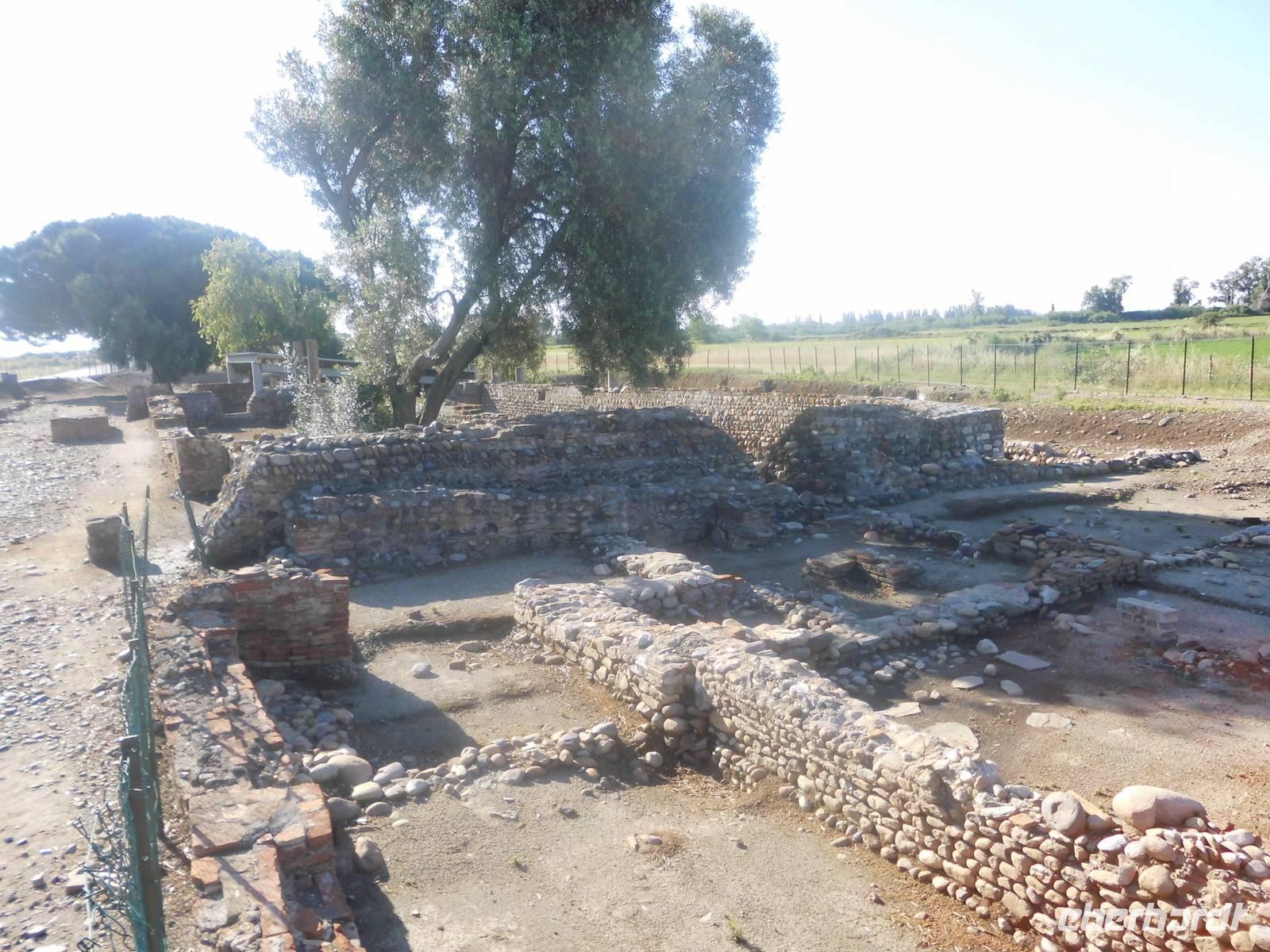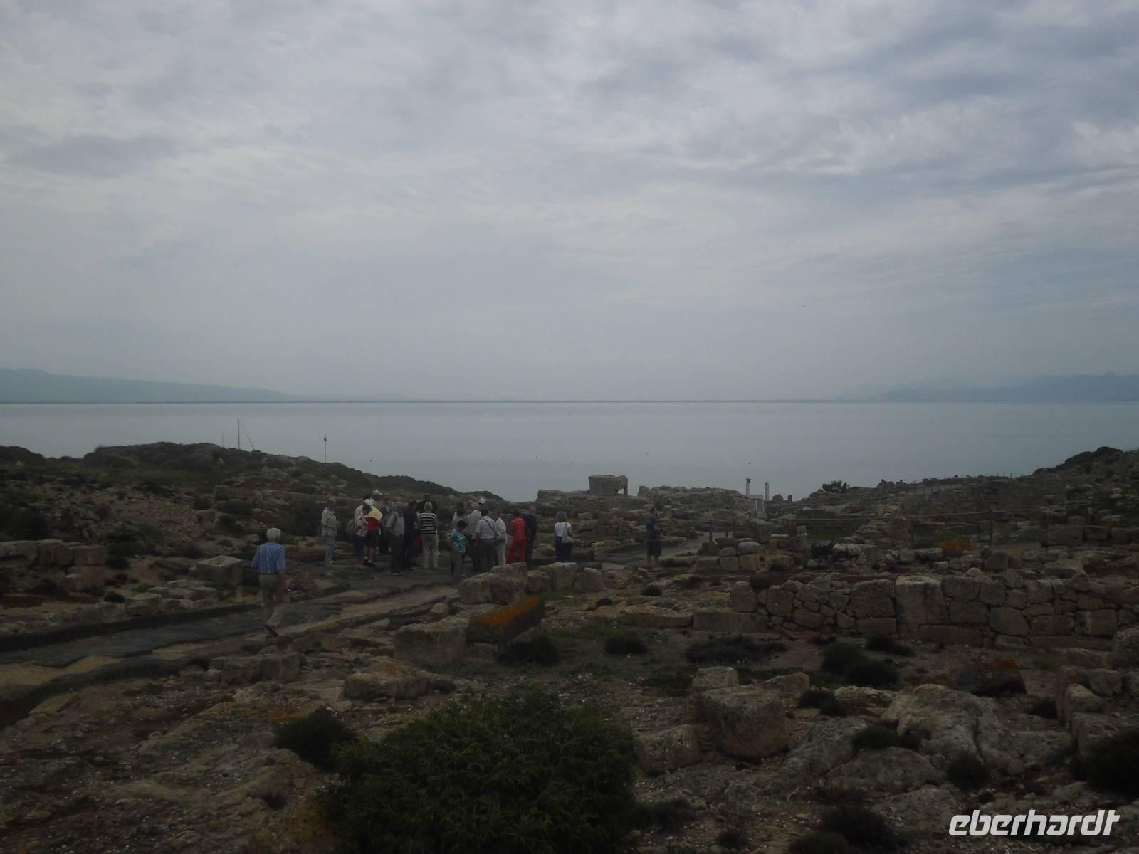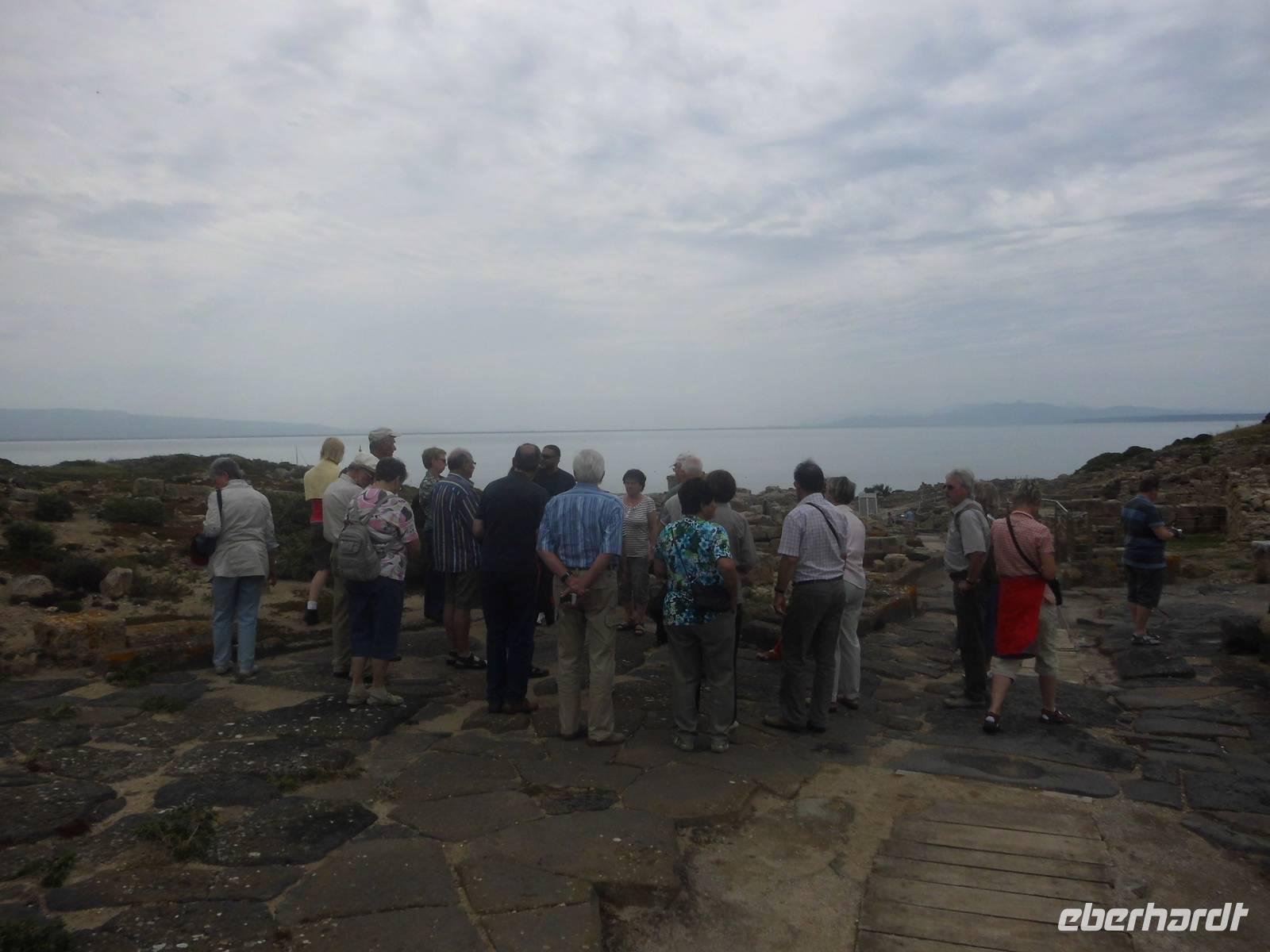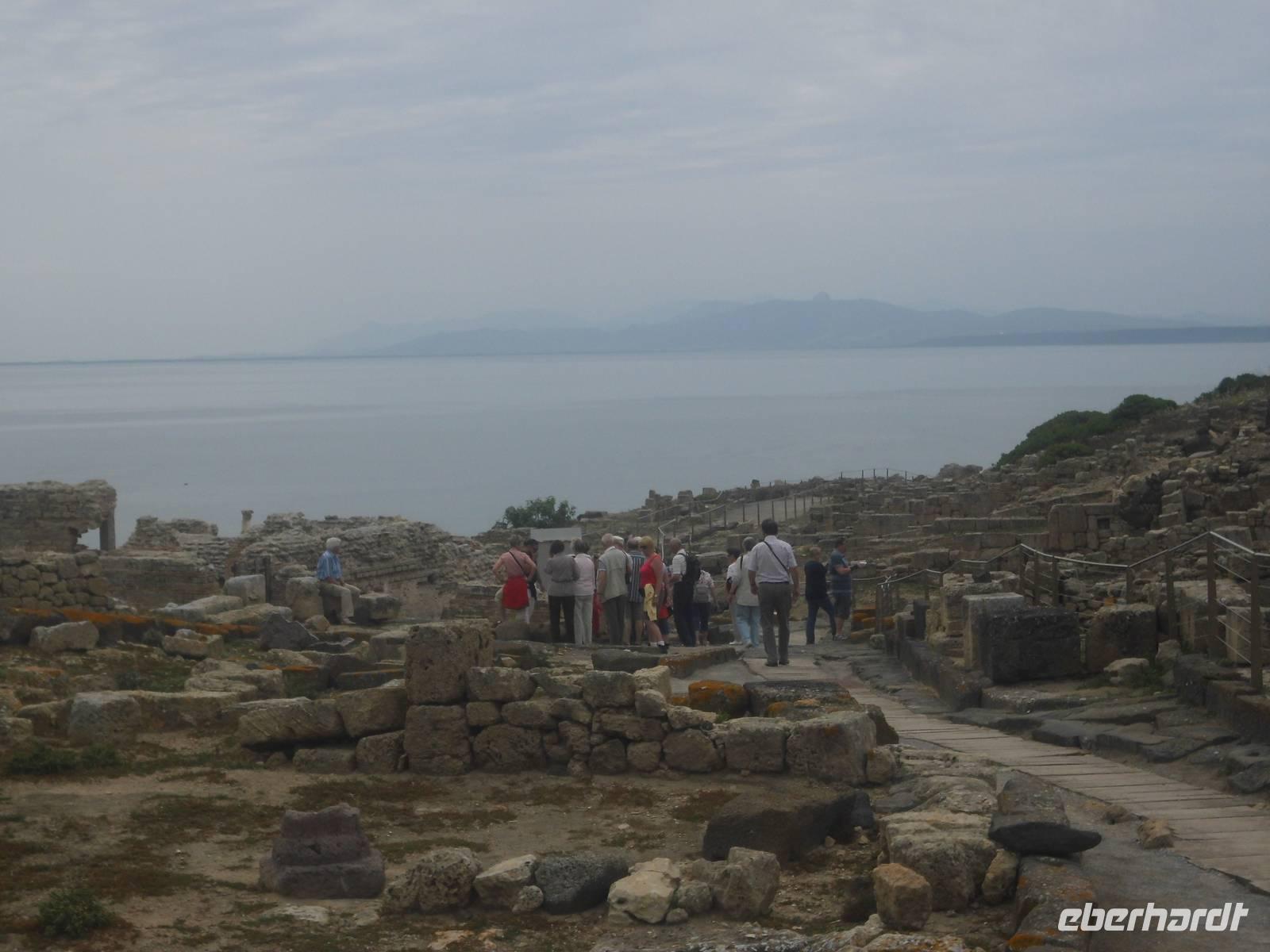 Heute fuhren wir zunächst durch den Südwesten der Insel in nördlicher Richtung nach Oristano, um dieses zu umfahren und zur Halbinsel Sinis zu gelangen. Das ist eine große, flache und kahle Landzunge, aber durch zahlreiche heimische Vogelarten und Fischreichtum ihrer Lagunen eine geschützte Biosphäre. Uns aber interessierte hier etwas anderes: Vom Busparkplatz waren es einige hundert Meter zu laufen, dann hatten wir eine interessante, von einer Anhöhe mit Wachturm markierte Stelle erreicht. Hier befindet sich mit Tharros eine der größten Ausgrabungen und eine der vielfältigsten antiken Ruinenstätten der Insel. Bereits im 12. Jahrhundert hatte ein arabischer Kapitän über ein großes, von See her sichtbares Ruinenfeld berichtet. Auf der schmalen, oft nur 100 m breiten Halbinsel Sinis hatten schon dir Träger der vorantiken Nuraghenkultur eine Siedlung errichtet, die von den Kolonisten des sich ausbreitenden Karthago, übernommen wurde und später von den Römern, nach ihren Siegen über die Karthager (Punier). Die Stadt blieb auch nach der Römerzeit bedeutend und war später einige Jahre Hauptstadt eines der vier Gerichtsbezirke, der sogenannten Judikate, in die Sardinien zu byzantinischer Zeit mit sich entwickelnder Autonomie aufgegliedert wurde. Durch ständige Überfälle vor allem arabischer Piraten und wegen des daraus resultierenden Bevölkerungsschwundes wurde die Stadt schließlich aufgegeben. Davon erzählte uns Franco, bei dessen Führung durch die punischen und römischen Ruinen wir die Straßenanlagen, Grundmauern der Häuser und Thermen sowie die fortgeschrittenen Bautechniken und den Erfindungsreichtum der Römer bei Wasser- und Kläranlagen und im Heizungsbau bewunderten.