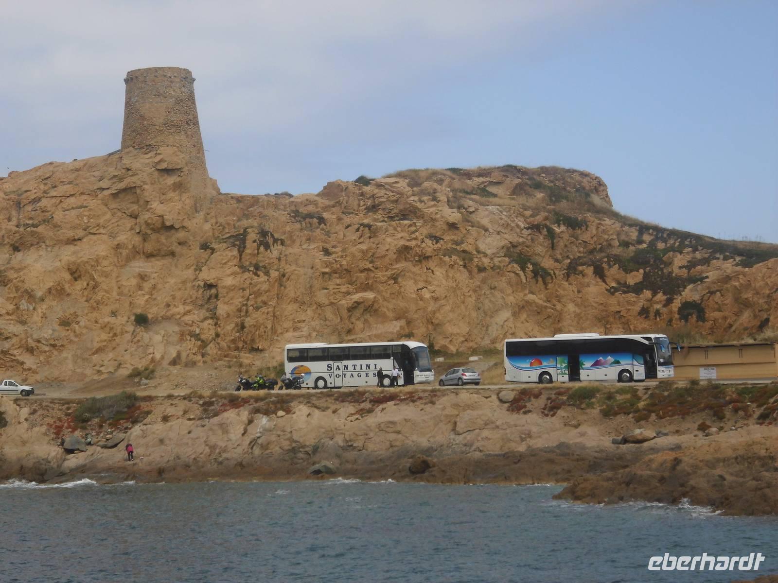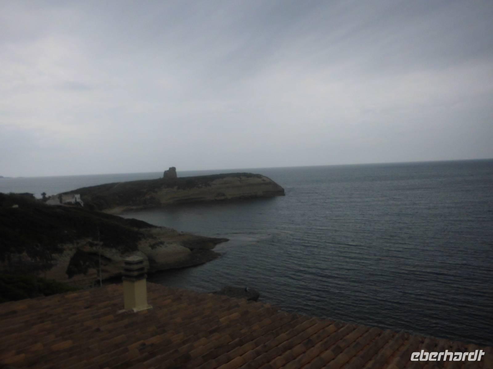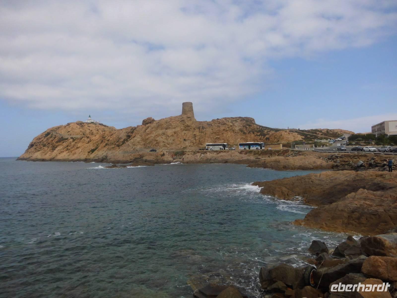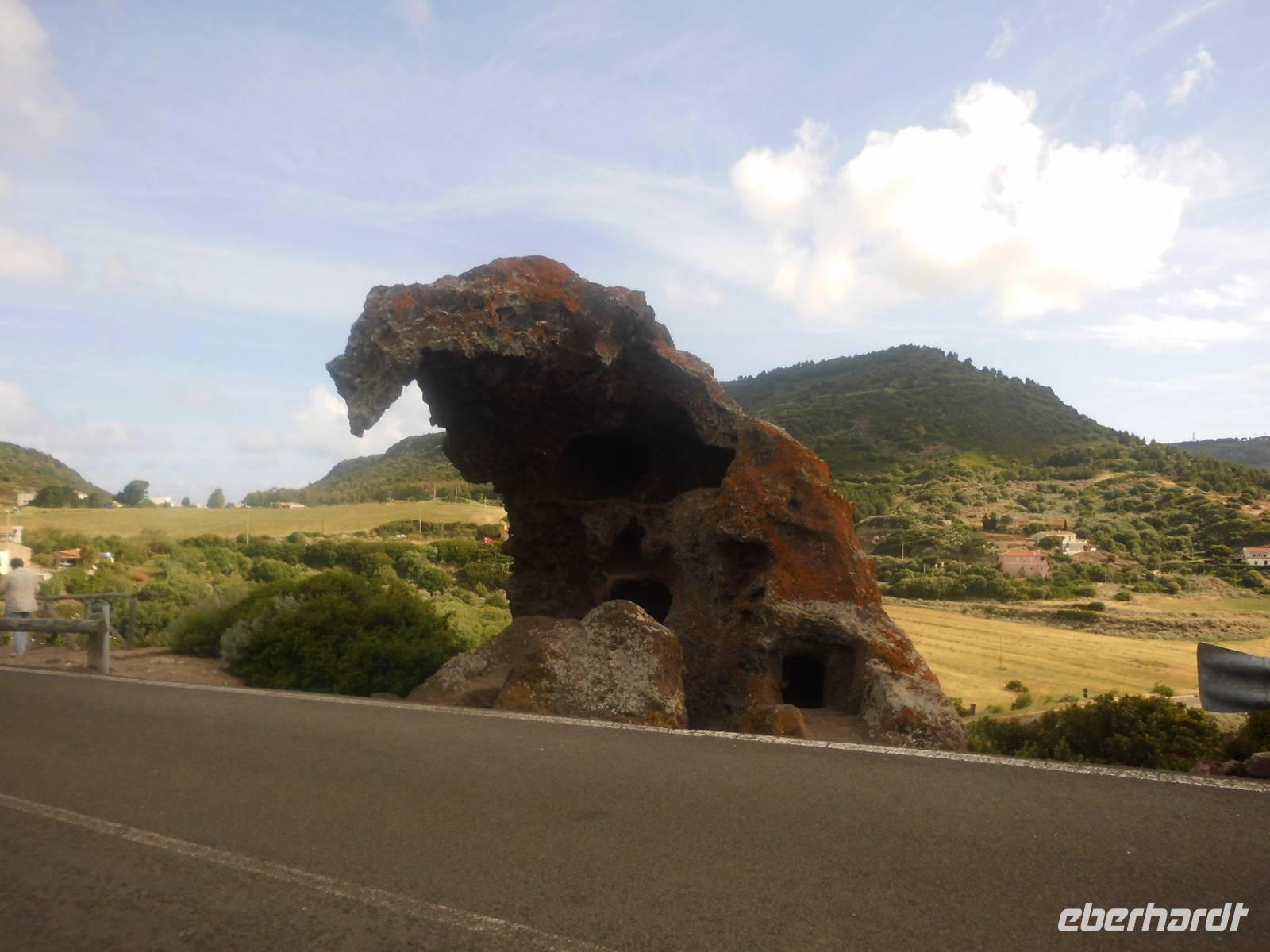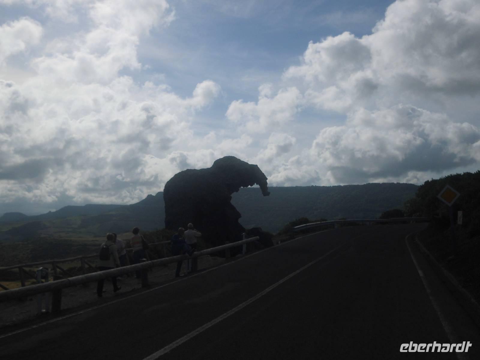 Heute sollte es nach Korsika gehen und wir mussten recht früh los. Deshalb gab es früheres Frühstück und schon kurz nach sieben Uhr brachen wir auf. Zunächst erreichten wir die Küste bei Porto Torres. Diese heute sehr industrialisiert wirkende Hafenstadt hat eine reiche Geschichte seit römischer Zeit, war Hauptstadt eines der sardischen Judikate in byzantinischer Zeit und danach und wurde dann genuesisch. Ab hier benutzten wir die Küstenstrasse und fuhren straff an der Küste entlang, zunächst bis Castelsordo, wo wir ein paar Fotos von der malerischen, festungsgekrönten Stadt schossen und dann auch noch den nicht allzuweit entfernten „Elefantenfelsen" (Rocca dell´Elefante) fotografieren konnten. auf unseren Besuch. Besonders interessant an diesem Trachytfelsen, der durch Verwitterung zu seiner seltsamen Elefantenform kam, ist seine Bedeutung als Grablege einer jungsteinzeitlichen sesshaften Bauernkultur. Dann ging es durch die Landschaft der Gallura zum Fährhafen Santa Teresa.