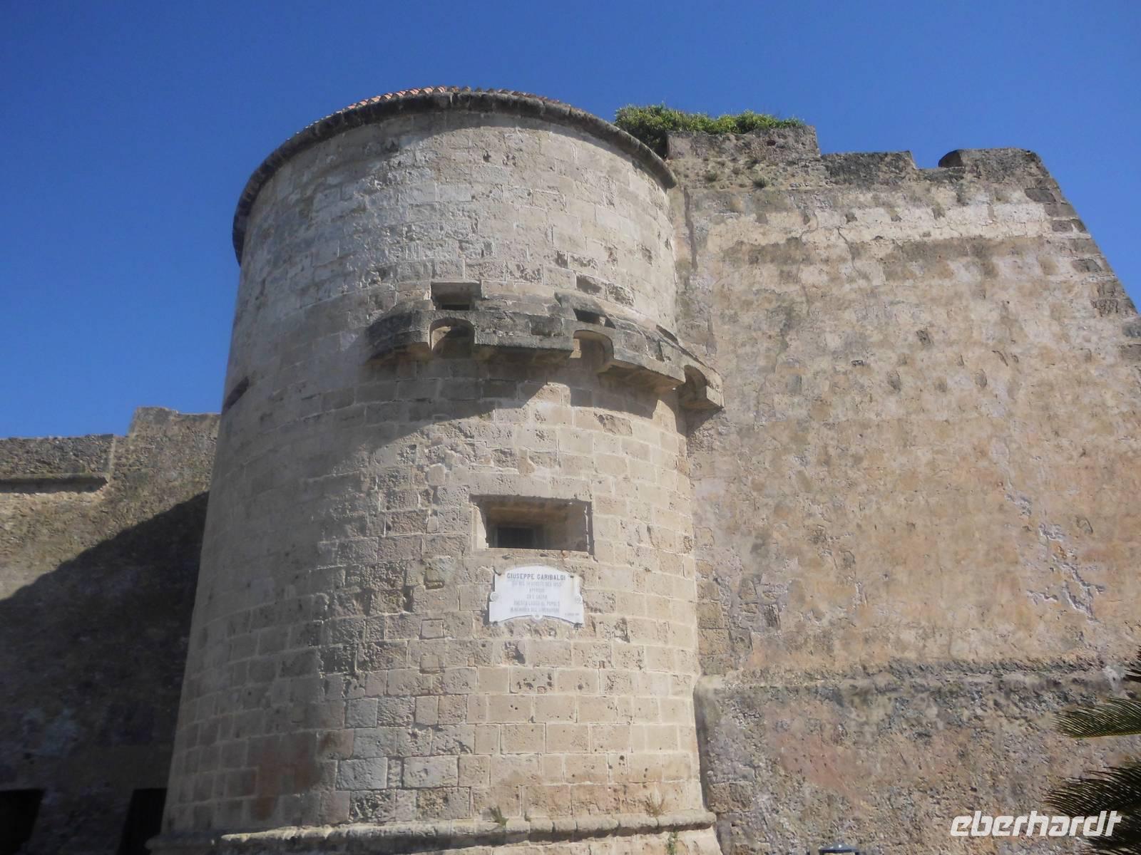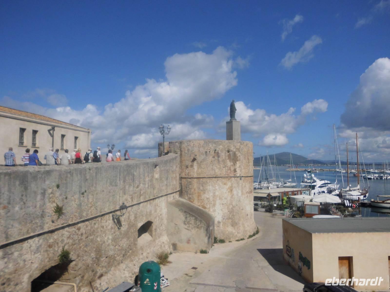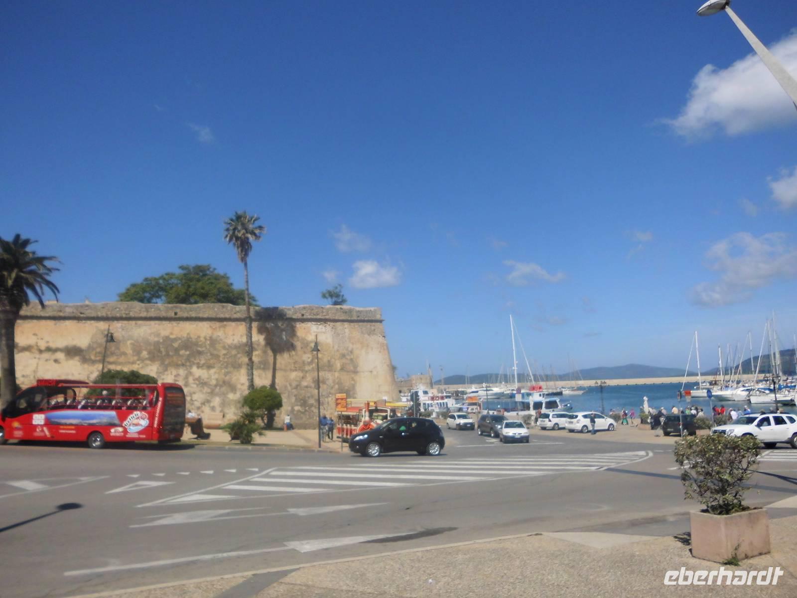 Unser Hotel „Corta Rosada" lag ein Stück entfernt von Alghero, in Richtung auf das westlich vorspringende schöne Cap Caccia. Heute war die Erkundung von Alghero vorgesehen, einer Kleinstadt, die durch die historische Siedlungspolitik der einst über Sardinien herrschenden Aragonesen bis heute als katalanische Sprachinsel gilt. Unsere örtliche Reiseleiterin Sophie lotste uns per Auto zum Parkplatz nahe der engen Innenstadt - das heißt, hinein in die komplett von Wehrmauer umgebene Stadt kamen wir mit dem Bus nicht, wohl aber zu einer nahe an der Mauer liegenden Stelle neben dem Hafen.