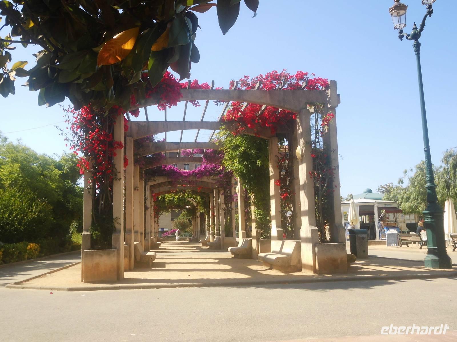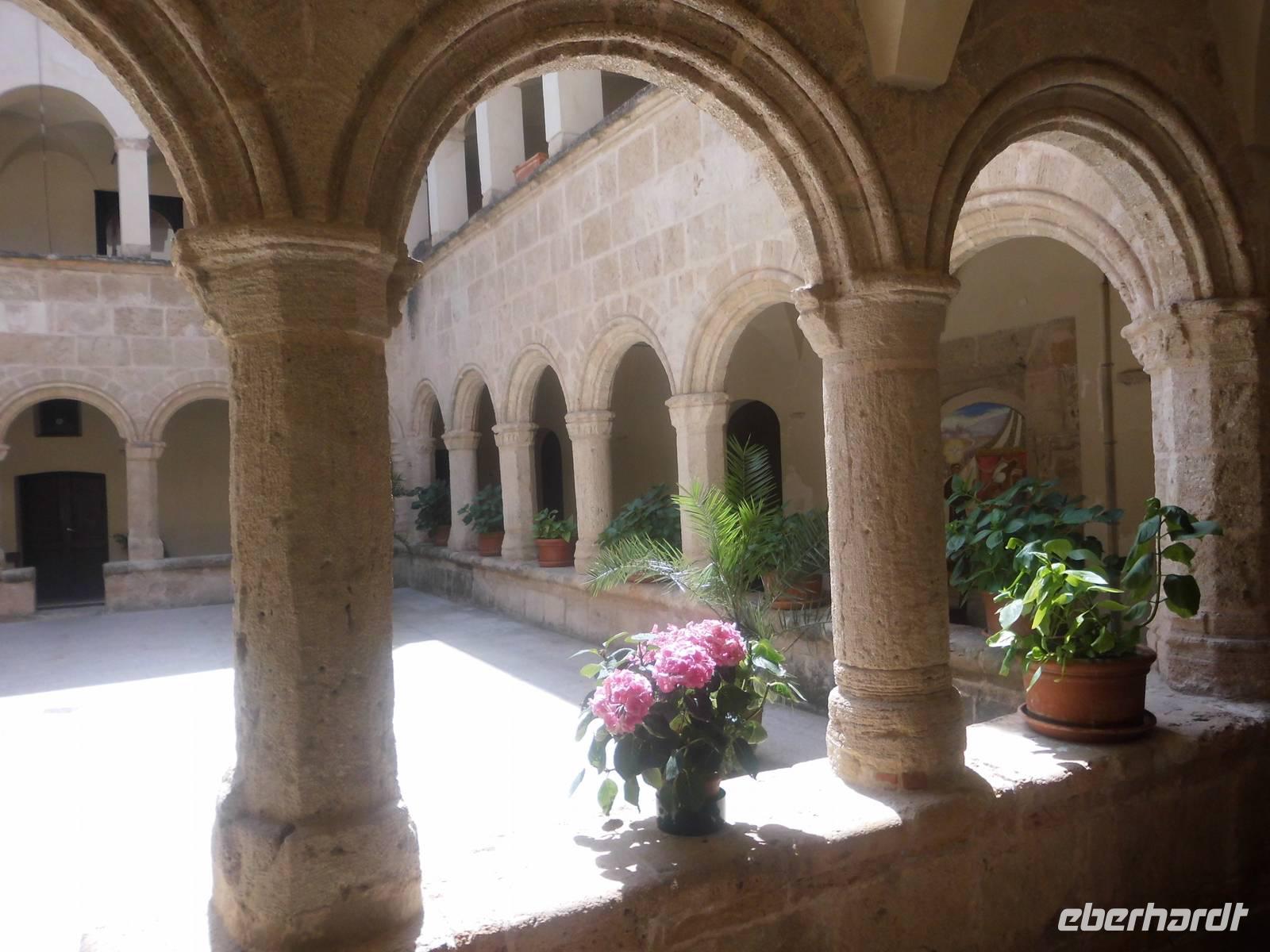 Malerisch liegt die Altstadt von Alghero ein wenig gedrängt auf einer Landzunge, immer noch von der Festungsmauer mit einer Anzahl von Bastionen, Wehrgängen und Vedetten - kleinen steinernen Wachhäuschen, die an strategisch wichtigen Orten direkt auf die Mauer gebaut wurden. Trotz der eigentlich zu erwartenden Wuchtigkeit des ansonsten schweren Mauerwerkes verliehen diese An- und Aufbauten Festungen wie der von Alghero eine gewisse „Leichtigkeit". Durch eine der kleinen pfortenartigen Mauerdurchbrüche führte uns Reiseleiterin Sophie hinein in die Altstadt. Das malerische Alghero ist eines von Sardiniens unumstrittenen touristischen Zentren - und das merkt man nicht nur an den bunten Werbungen für verschiedene Unternehmungen oder dem jetzt an vielen Orten üblichen „kleinen Zug", meist einer als Lokomotive „verkleideten" Landrover-Zugmaschine, die in ein paar Waggons mit Sitzbänken Touristen durch die Stadt fährt, sondern auch an den vielen Souvenir und Schmuckläden. Sophie führte uns zunächst zur Piazza Civica, dem Vorzeigeplatz Algheros mit typischen Häusern und einer Reihe gemütlicher Bars zum Sitzen, Sehen und Gesehen werden. Ein Rundgang in der Altstadt zeigte uns die verwinkelten Gassen und malerischen Straßenecken, kleine Stadtpaläste und die Kathedrale Santa Maria mit ihrem weithin sichtbaren achteckigen Glockenturm. Interessanter noch aber sind zwei andere Gotteshäuser: San Francesco hat trotz seiner schlichten Fassade ein sehr interessantes Inneres, prunkt aber vor allem mit seinem wundervollen aus 22 Bögen und Säulen bestehenden Sandstein-Kreuzgang. Und dann ist da noch die im Ursprung aus dem 16. Jahrhundert stammende „Chiesa di San Michele". Wieder errichtet im 17. Jahrhundert ist die Kirche des Heiligen Michael mit ihrem kreuzförmigen Grundriss bis heute Sitz des Jesuitenkollegs. Auffälligster Blickpunkt für die ganze Stadt aber ist die Kuppel dieser Kirche, erst im Jahr 1950 fertiggestellt: Ihre Deckung aus glasierten, farbigen Dachziegeln sichert ihr die zentrale Aufmerksamkeit!