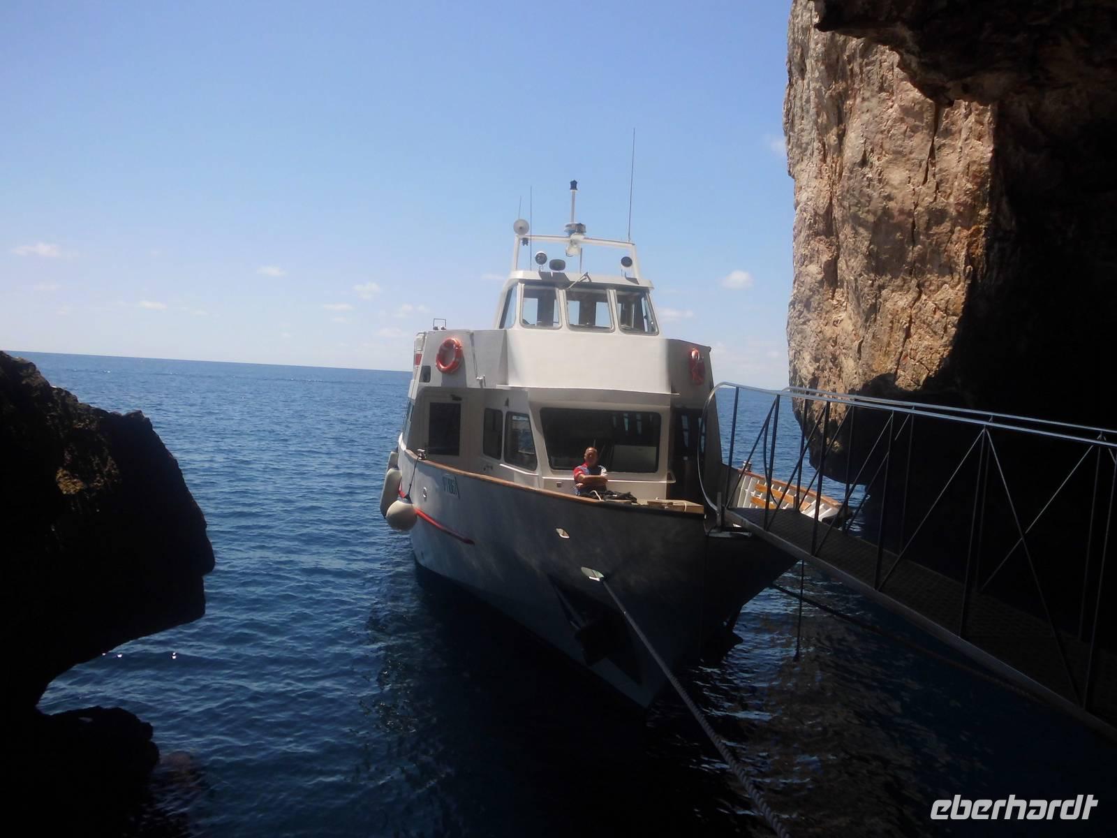 Nach der Stadtführung war Zeit zur freien Verfügung und dafür gab es einen heißen Tipp. Unterhalb des ein paar Kilometer entfernt liegenden Cap Caccia lockte eine besondere Sehenswürdigkeit: die Neptungrotte, eine interessante Tropfsteinhöhle, zu der man am schönsten und bequemsten auf dem Wasserweg gelangte. Also: wer möchte den Nachmittag für eine Bootsfahrt nutzen? 21 von uns wollten und so machten wir uns auf den Weg. Jede Stunde startet vom Hafen ein Boot des Unternehmens Navissarda. Wir buchten rasch unsere Tickets, gingen an Bord und ließen es uns bei herrlichem Wetter und leichter Mittelmeerbrise gut gehen. Eine der schönsten Tropfsteinhöhlen des Mittelmeeres versprach die Werbung. Bei ruhigem, in den verschiedensten Blautönen schimmerndem Meer fuhr das Boot zum schon beim ersten Anblick beeindruckenden Grotteneingang. Wir legten an, mussten den Höhleneintritt bezahlen und begaben uns dann auf eine kleine, geführte Wanderung durch die Wunderwelt der Stalagmiten und Stalagtiten. Die prächtigen Tropfsteingebilde, aus denen man mit etwas Phantasie die verschiedensten Formen, Figuren und Bildgeschichten herauslesen kann, entstehen durch jahrhundertelang durch den Felsen sickerndes Wasser, das den gelösten Kalk hinterlässt. So entstehen meist zapfenähnliche Gebilde an den Stellen, wo das kalkhaltige Wasser vom Felsen in einen Hohlraum tropft und da, wo es auftrifft. Die Grotta di Nettuno ist wirklich beeindruckend und zusammen mit der angenehmen Bootsfahrt war es für alle ein schönes Erlebnis.