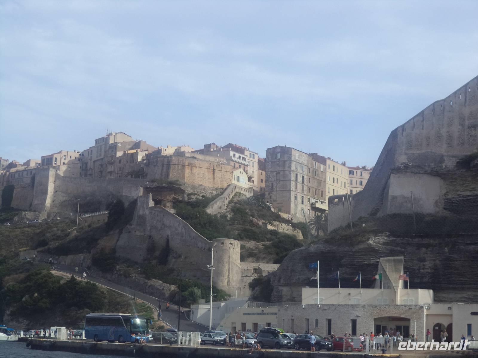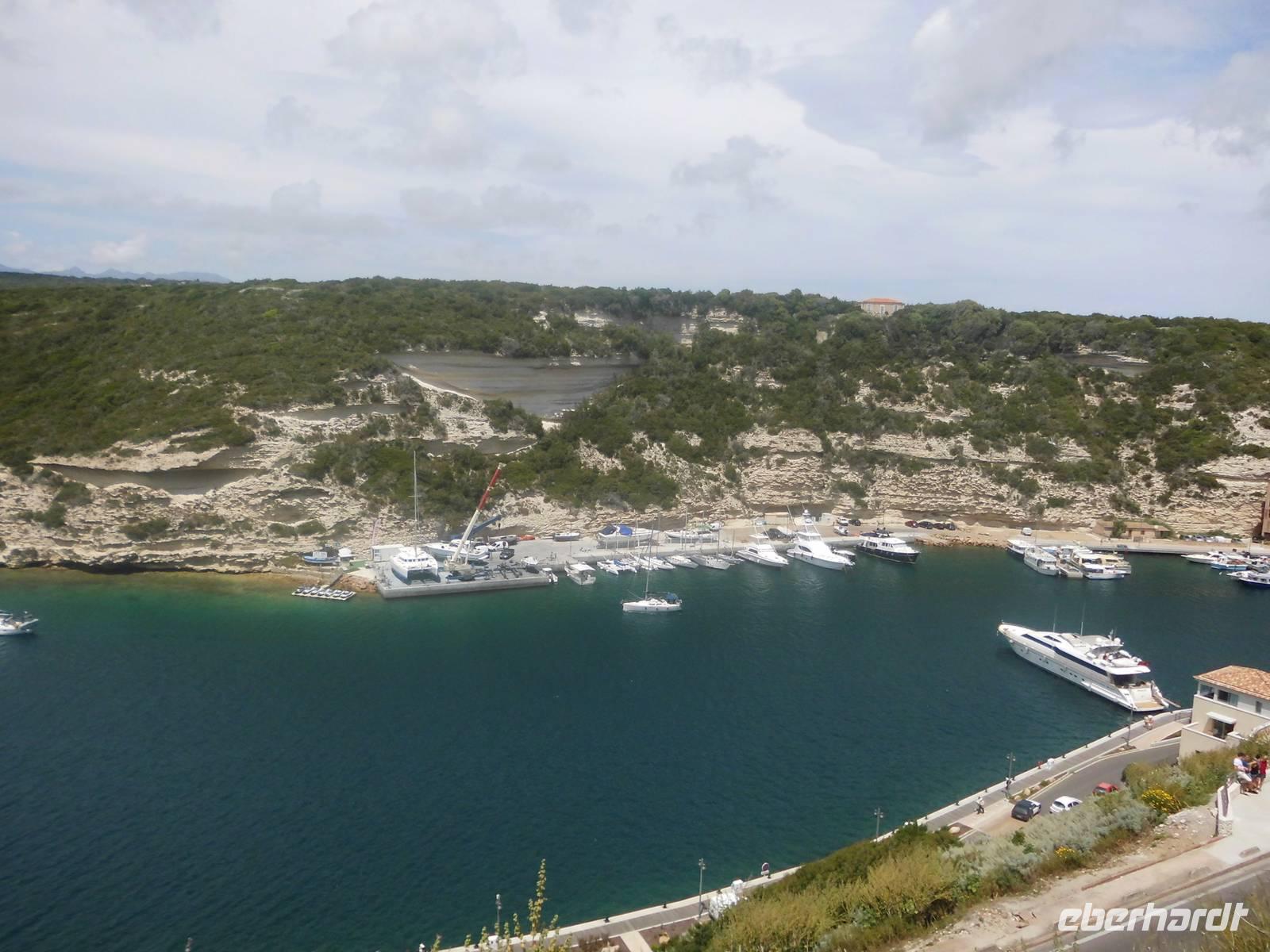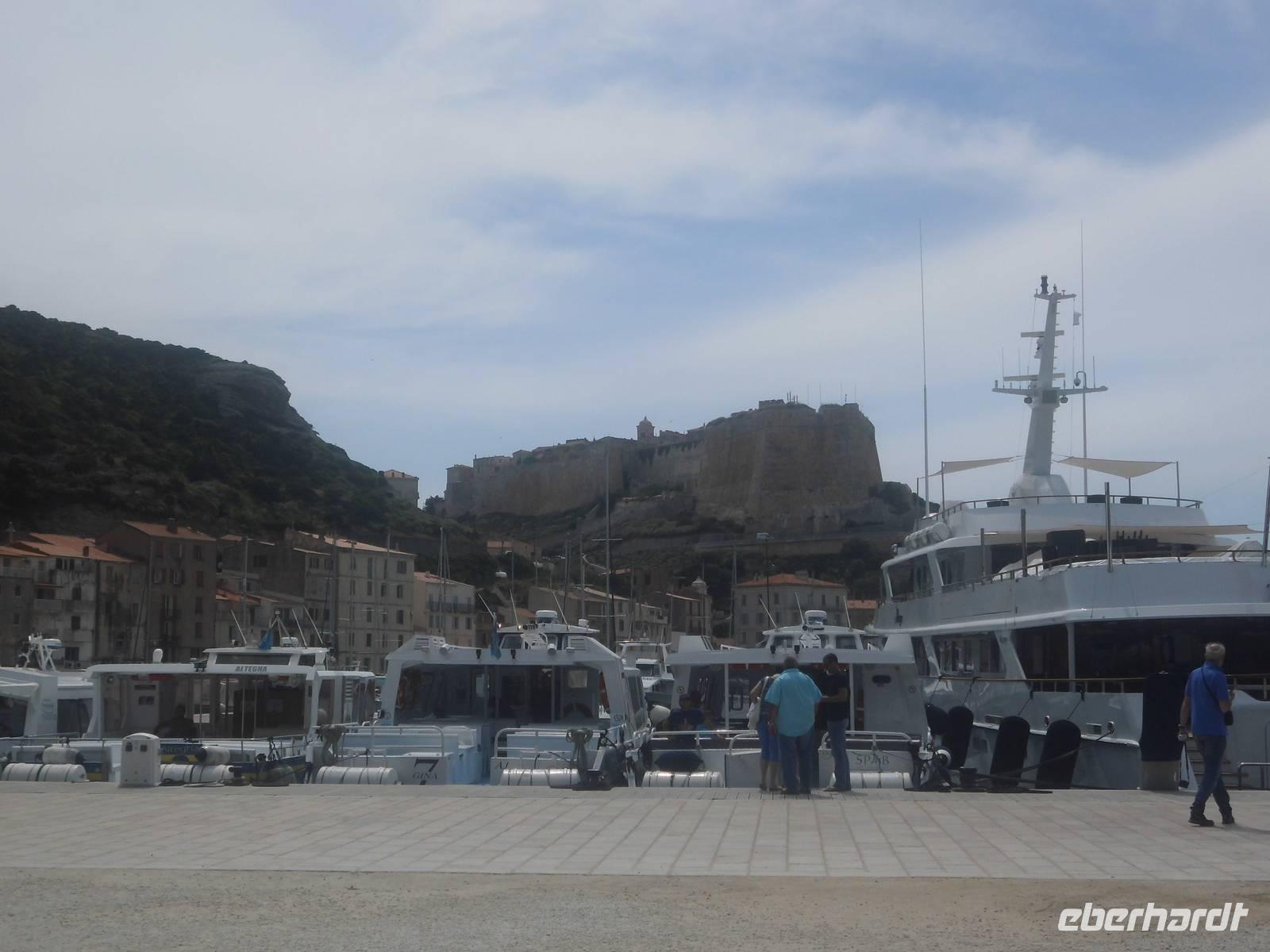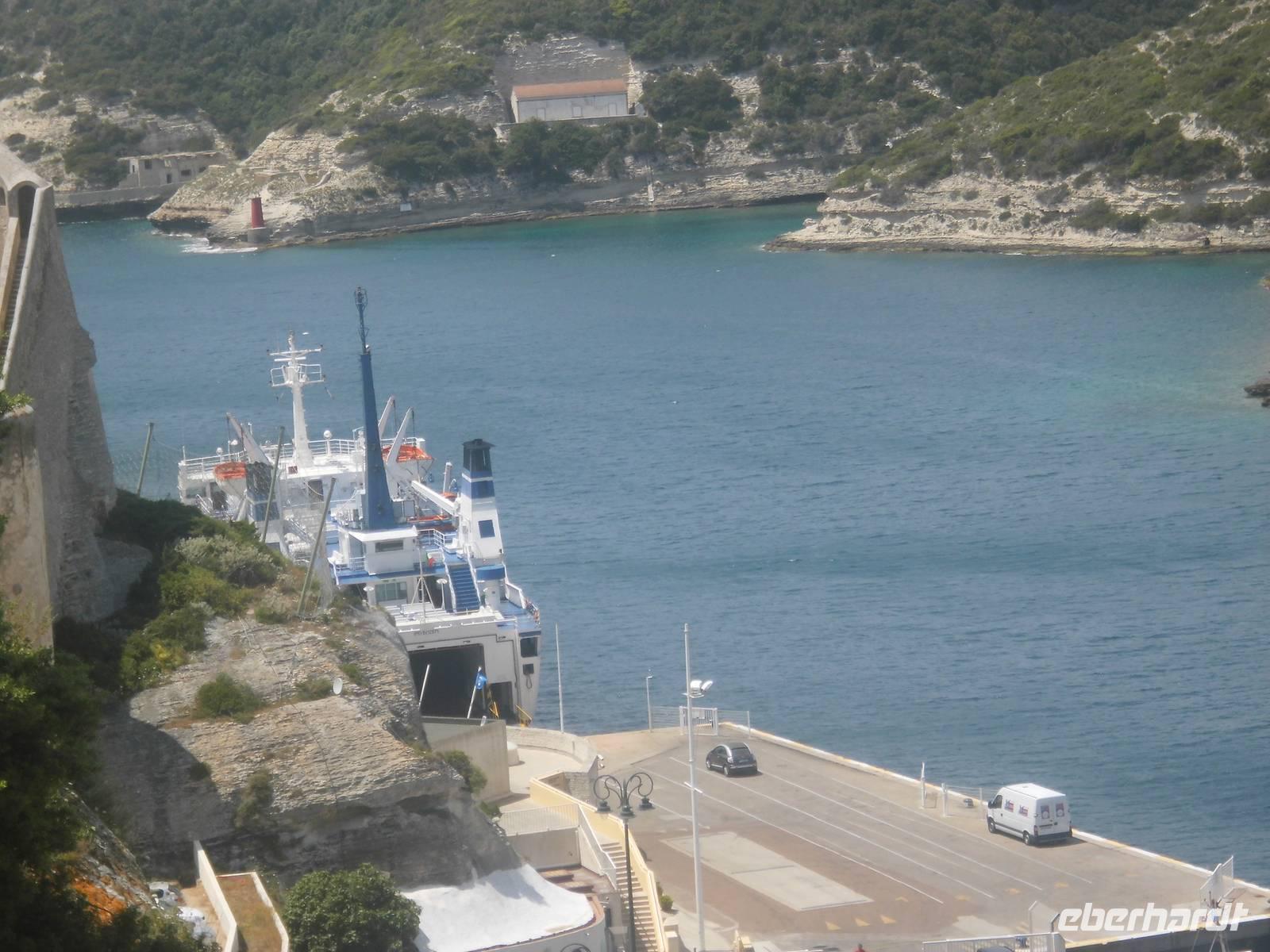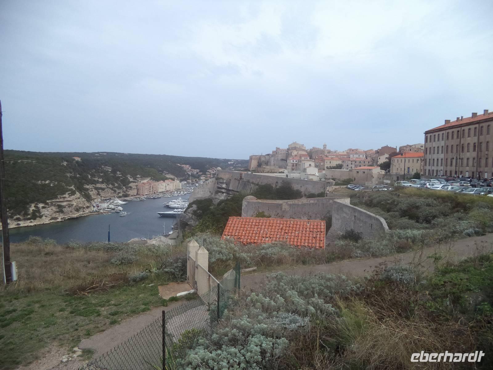 Nach einer guten Stunde endete die Fährüberfahrt in Bonifacio. Bereits die Anfahrt ist eine Show, denn die nur etwa 3000 Einwohner großer Stadt, nach der die Meerenge zwischen den beiden Inseln „Straße von Bonfacio heißt, liegt auf einem schmalen knapp einen Kilometer langen und vielleicht 80 m hohen Kalksteinfelsen. Ins Meer hineinragend wird er auf der einen Seite von der bis unmittelbar an den Abgrund zum Meer hin gebauten Altstadt dramatisch gekrönt, bildet auf der anderen Seite einen tief ins Land eingeschnittenen, gut geschützten Naturhafen, der natürlich von alters her gern genutzt wird. An dieser Stelle errichteten erst Pisaner und dann Genuesen eine gewaltige Zitadelle und eine unglaublich malerische, zitadellenähnliche weil mit gleichen Wehrmauern versehene Altstadt. Nachdem die Fähre gleich am Anfang des Hafens direkt unterhalb der Mauer angelegt hatte, konnten wir gleich den etwas steilen Weg in die Altstadt hinauf. Wir wählten den Straßenaufstieg durch das Stadttor: weniger Stufen, gleich an der richtigen Stelle für den Stadtrundgang und direkt am Stadttor gab es das Touristenamt mit einem Stadtplan für jeden. Gemeinsam gingen wir zum historischen Marktplatz direkt an den Wehrmauern, durch die spektakulär engen, oft mit Torbögen und „Stützbalken" versehenen (durch die aber meist Wasserleitungen zu den Zisternen führen) Gassen der mittelalterlichen Altstadt und kamen auf dem Weg zum alten Quartier der Stadtgarde und zum Exerzierplatz an der stark ins Gassengewirr eingebauten Hauptkirche mit Loggia vorbei. Die Kathedrale von Bonifacio liegt außerhalb in der Zitadelle, neben den historischen Zisternenanlagen. Dann konnten wir die Stadt auf eigene Faust entdecken, z.B. die überwältigenden Panoramablicke in den Naturhafen und von den Kalksteinklippen oder die weit ausgedehnte Zitadelle.