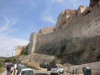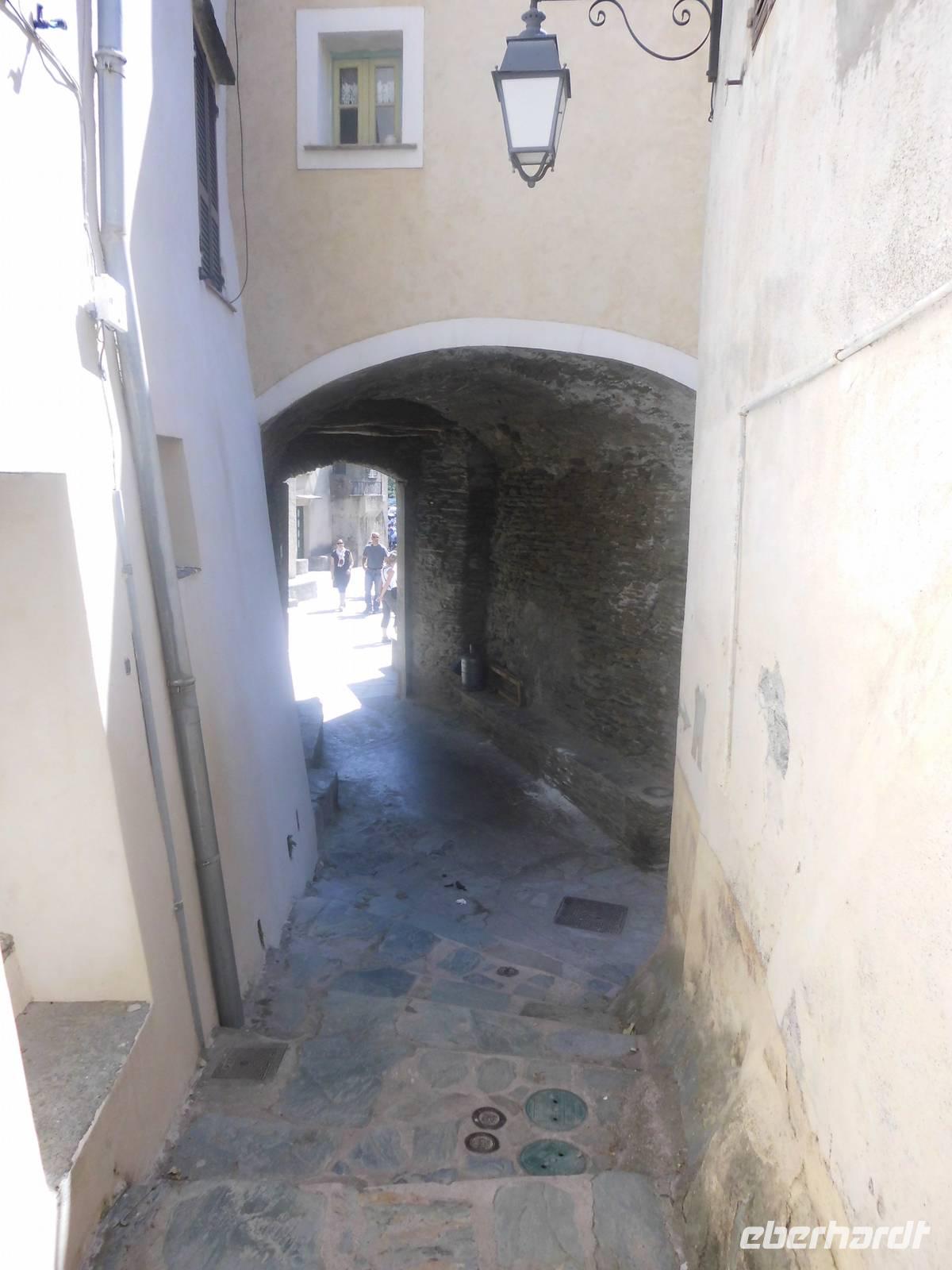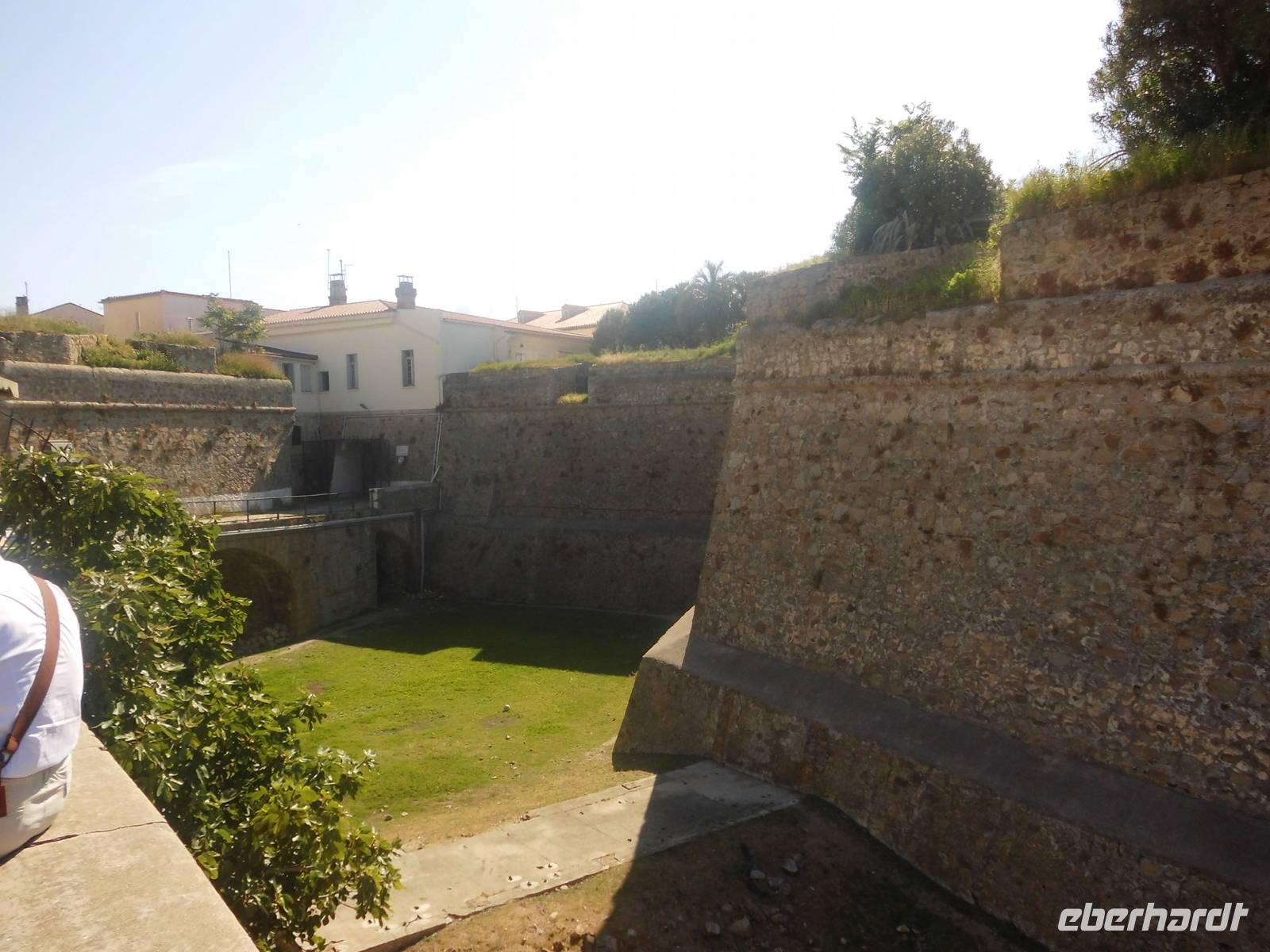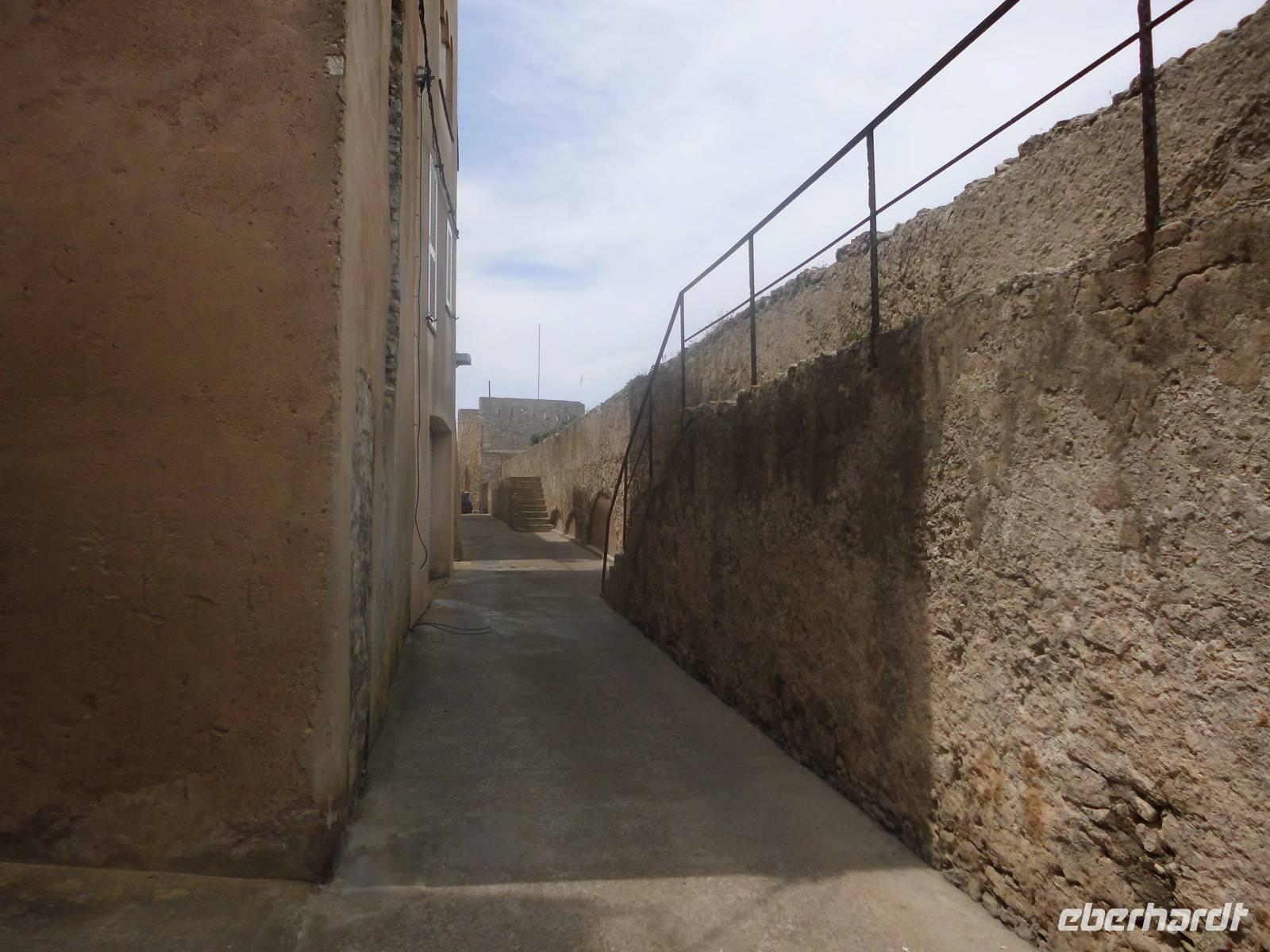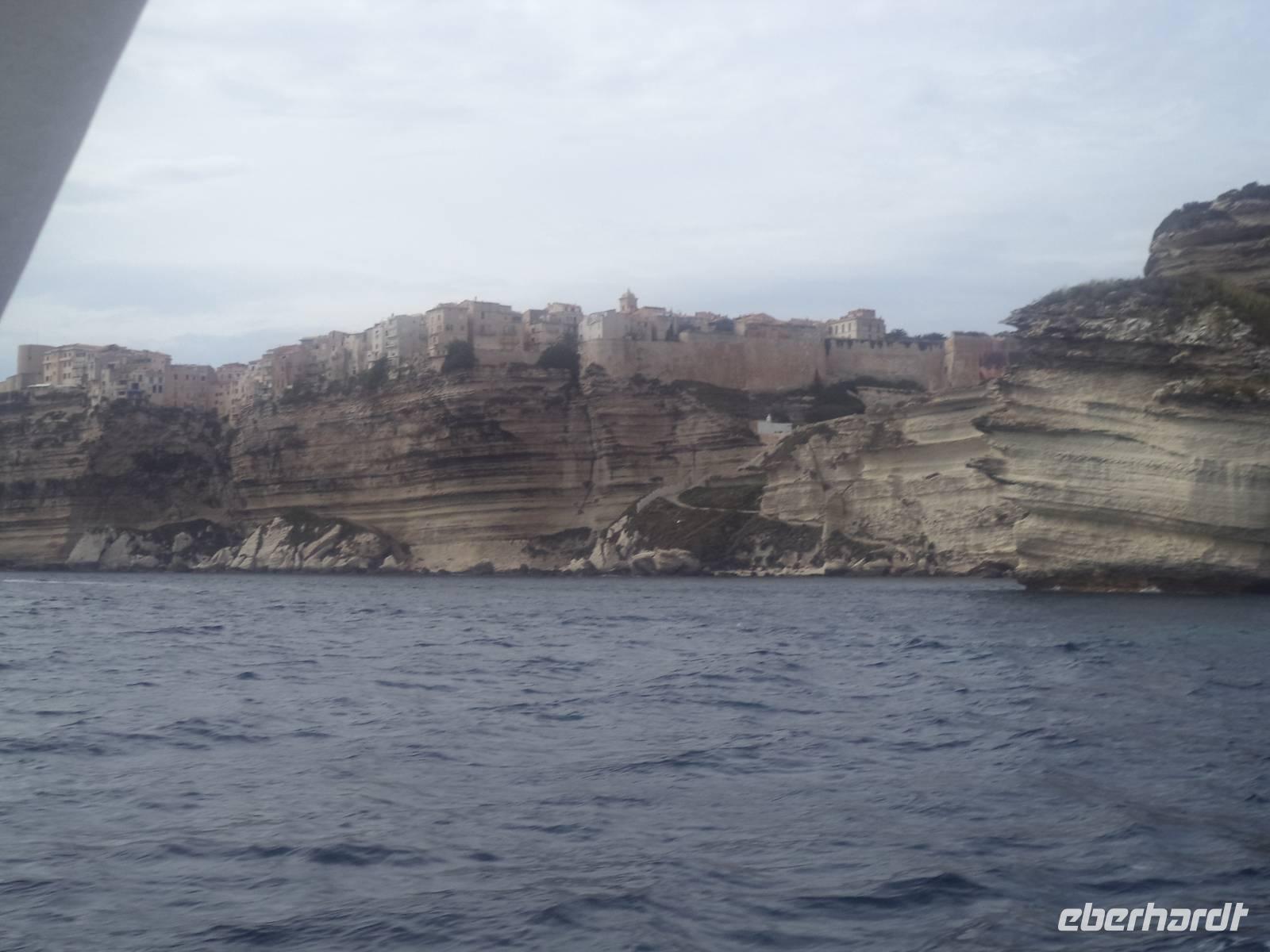 Nach einer guten Stunde endete die Fährüberfahrt in Bonifacio. Bereits die Anfahrt ist eine Show, denn die nur etwa 3000 Einwohner großer Stadt, nach der die Meerenge zwischen den beiden Inseln „Straße von Bonfacio heißt, liegt auf einem schmalen knapp einen Kilometer langen und vielleicht 80 m hohen Kalksteinfelsen. Ins Meer hineinragend wird er auf der einen Seite von der bis unmittelbar an den Abgrund zum Meer hin gebauten Altstadt dramatisch gekrönt, bildet auf der anderen Seite einen tief ins Land eingeschnittenen, gut geschützten Naturhafen, der natürlich von alters her gern genutzt wird. An dieser Stelle errichteten erst Pisaner und dann Genuesen eine gewaltige Zitadelle und eine unglaublich malerische, zitadellenähnliche weil mit gleichen Wehrmauern versehene Altstadt. Nachdem die Fähre gleich am Anfang des Hafens direkt unterhalb der Mauer angelegt hatte, konnten wir gleich den etwas steilen Weg in die Altstadt hinauf. Wir wählten den Straßenaufstieg durch das Stadttor: weniger Stufen, gleich an der richtigen Stelle für den Stadtrundgang und direkt am Stadttor gab es das Touristenamt mit einem Stadtplan für jeden. Gemeinsam gingen wir zum historischen Marktplatz direkt an den Wehrmauern, durch die spektakulär engen, oft mit Torbögen und „Stützbalken" versehenen (durch die aber meist Wasserleitungen zu den Zisternen führen) Gassen der mittelalterlichen Altstadt und kamen auf dem Weg zum alten Quartier der Stadtgarde und zum Exerzierplatz an der stark ins Gassengewirr eingebauten Hauptkirche mit Loggia vorbei. Die Kathedrale von Bonifacio liegt außerhalb in der Zitadelle, neben den historischen Zisternenanlagen. Dann konnten wir die Stadt auf eigene Faust entdecken, z.B. die überwältigenden Panoramablicke in den Naturhafen und von den Kalksteinklippen oder die weit ausgedehnte Zitadelle.