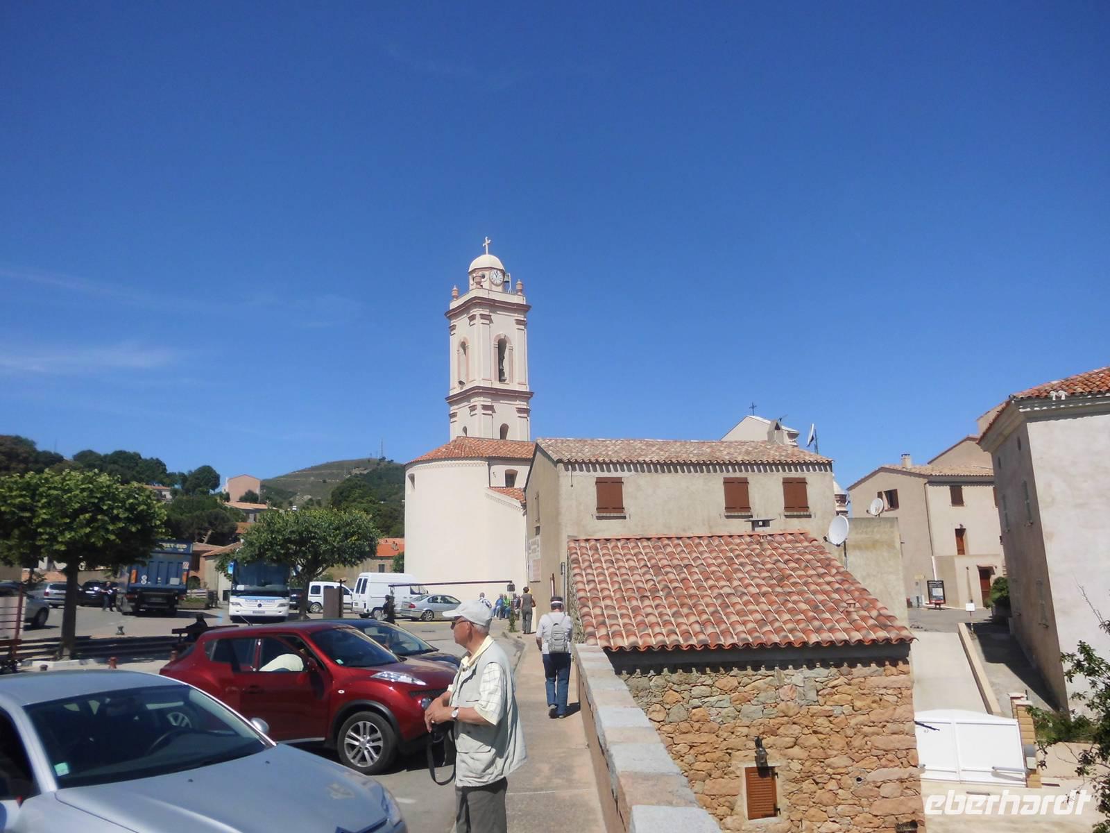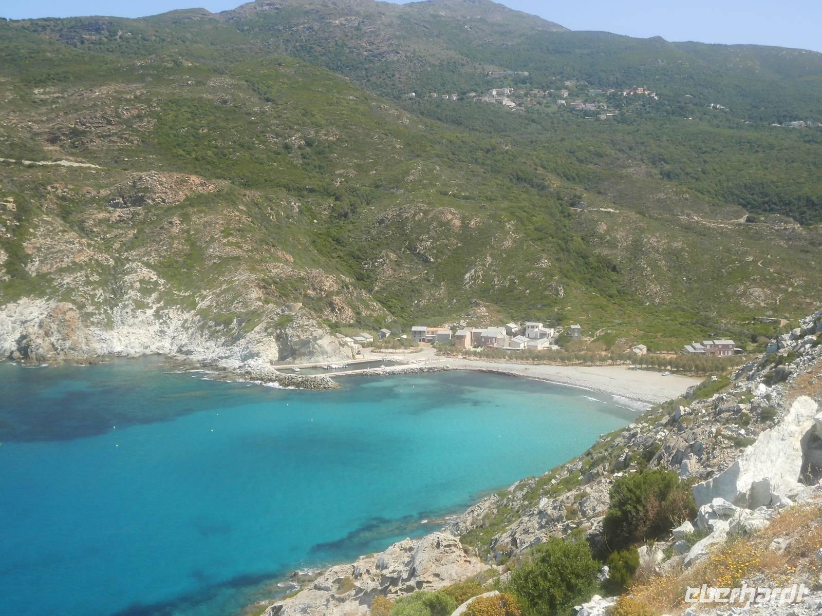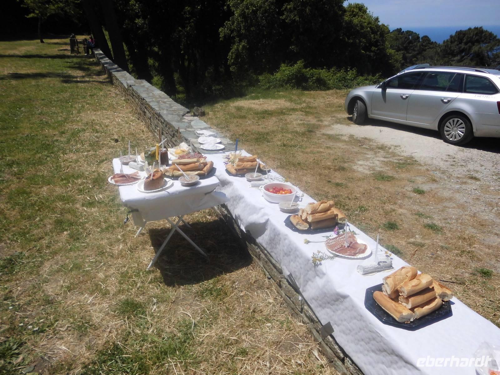 Fragt man einen Korsen, welche Form seine Insel hat, wird er sagen: wie eine Faust mit aufgerecktem Daumen! Um genau diesen Daumen wollten wir heute bei herrlichem Wetter fahren. Wir starteten auf schon bekanntem Weg zur Bucht von Sant Florent, doch diesmal besuchten wir auch den bekannten Badeort. Während die Gäste eine Dreiviertelstunde Freizeit hatten, kaufte ich in den Geschäften des Ortes für ein Picknick heute Mittag ein. Das gelang zeitlich gerade so und dann waren wir auf der schmalen, kurvenreichen Uferstraße unterwegs. In Nonza, einem überaus malerischen Ort, überragt von einem Genueserturm,. Hatten wir den ersten Aufenthalt, dann folgten Fotostopps und im Örtchen Pino ein weiter Toilettenstopp. Dann bogen wir in die Berge ab und erreichten bald den Pass der Heiligen Lucia, an dem eine der Heiligen gewidmete Kapelle steht. Auf deren Umfassungsmauer bereiteten Fahrer Frederic und ich ein leckeres Picknick vor, Während sich die Gäste die Umgebung besahen. Vom Ergebnis unserer Bemühungen waren dann alle überzeugt: auf der Mauer und dem mitgebrachten Tisch waren korsische und französische Spezialitäten versammelt: Salami und Schinken, Hirtensülze und Leberpastete und mehrere Sorten korsischer und französischer Käse. Dazu gab es Baguette und korsischen Rotwein. Bon apetit!