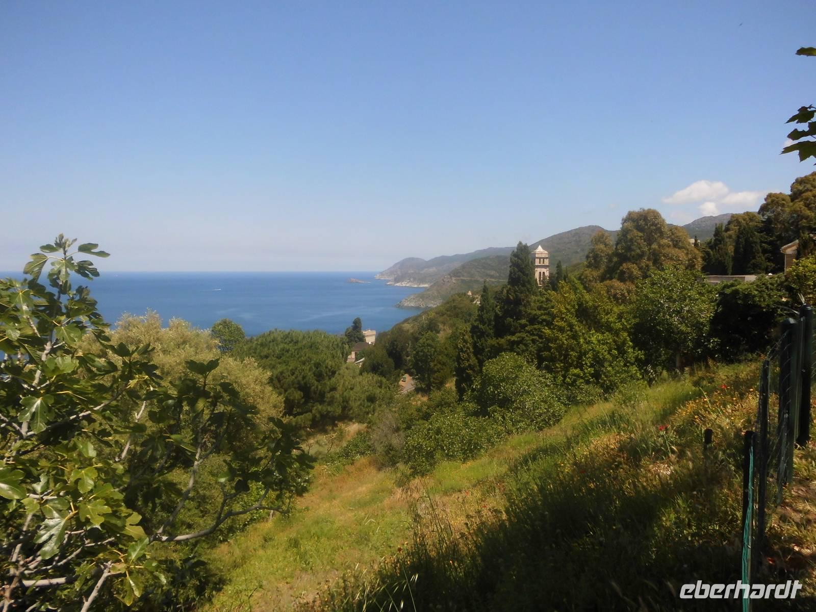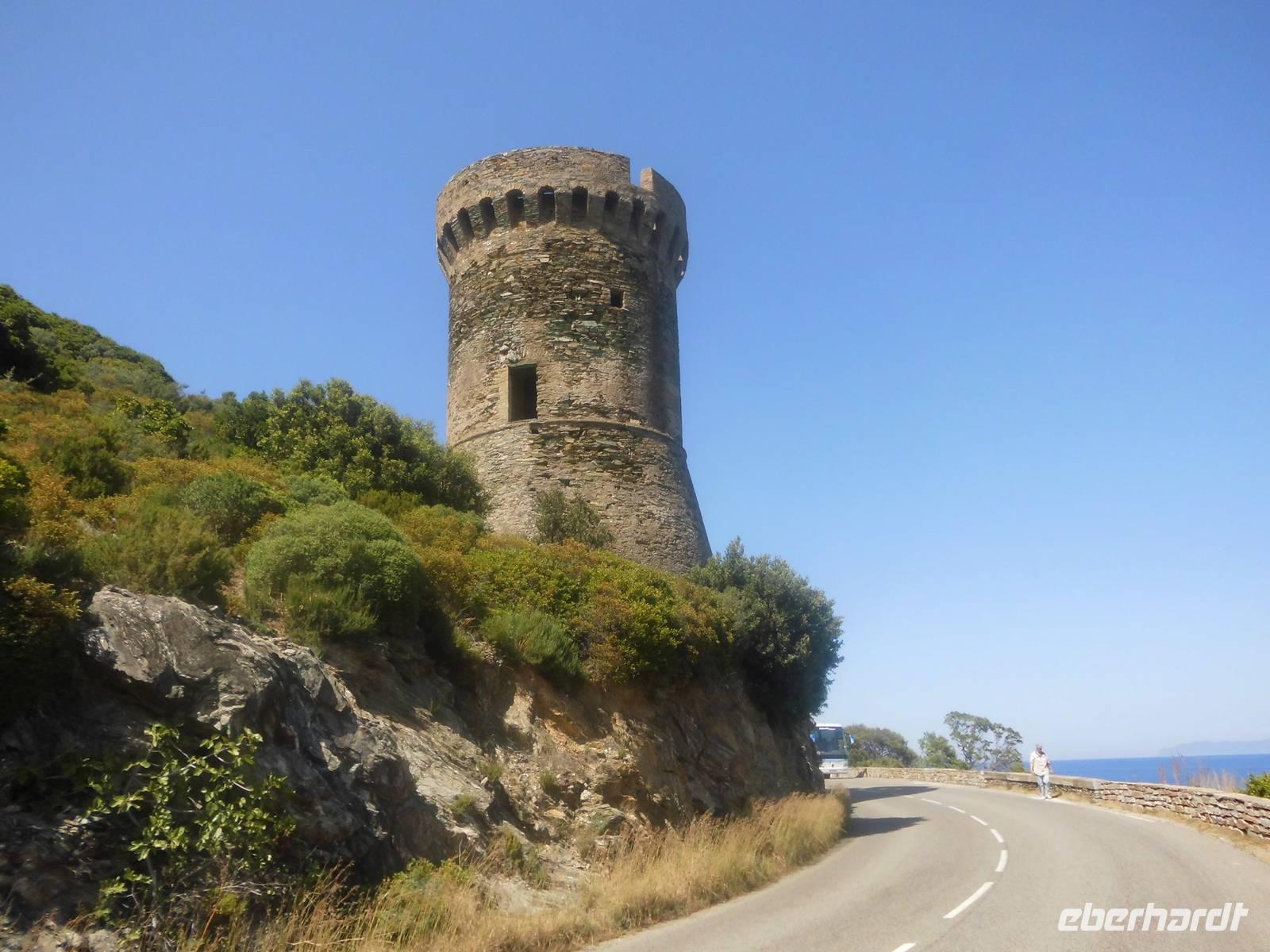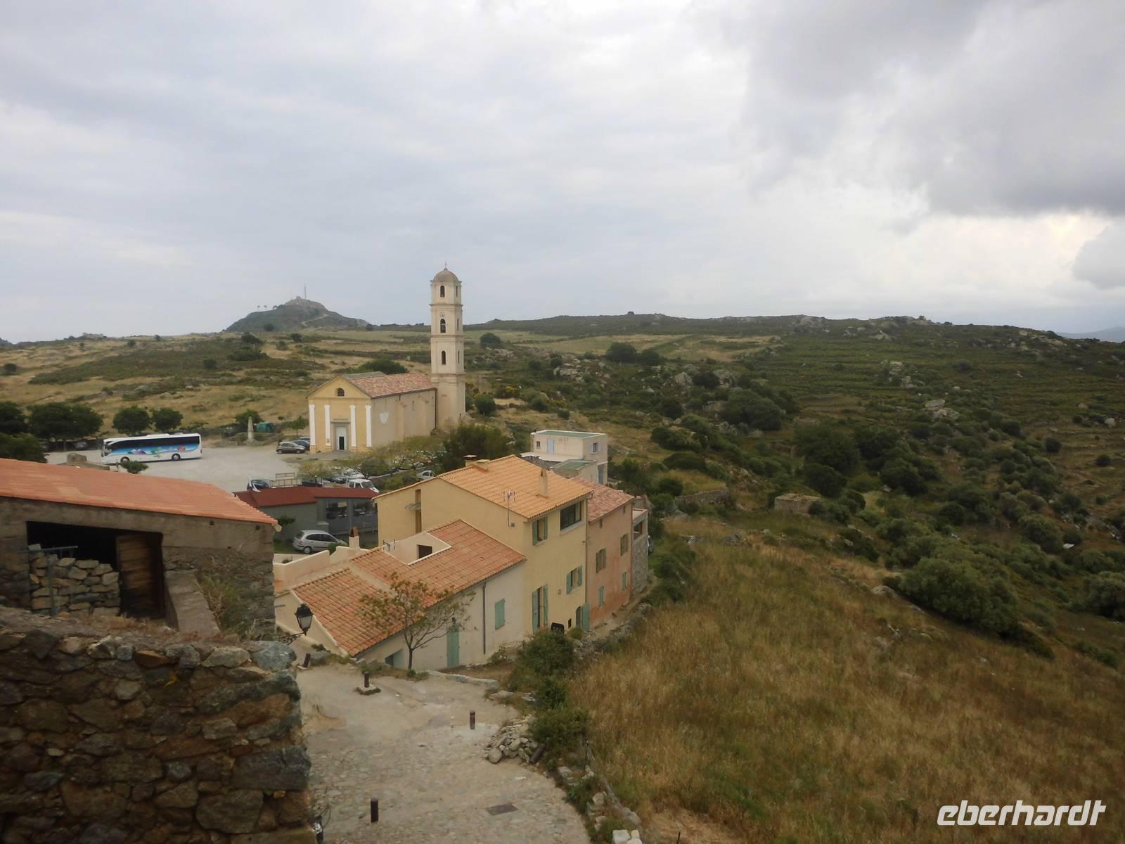 Fragt man einen Korsen, welche Form seine Insel hat, wird er sagen: wie eine Faust mit aufgerecktem Daumen! Um genau diesen Daumen wollten wir heute bei herrlichem Wetter fahren. Wir starteten auf schon bekanntem Weg zur Bucht von Sant Florent, doch diesmal besuchten wir auch den bekannten Badeort. Während die Gäste eine Dreiviertelstunde Freizeit hatten, kaufte ich in den Geschäften des Ortes für ein Picknick heute Mittag ein. Das gelang zeitlich gerade so und dann waren wir auf der schmalen, kurvenreichen Uferstraße unterwegs. In Nonza, einem überaus malerischen Ort, überragt von einem Genueserturm,. Hatten wir den ersten Aufenthalt, dann folgten Fotostopps und im Örtchen Pino ein weiter Toilettenstopp. Dann bogen wir in die Berge ab und erreichten bald den Pass der Heiligen Lucia, an dem eine der Heiligen gewidmete Kapelle steht. Auf deren Umfassungsmauer bereiteten Fahrer Frederic und ich ein leckeres Picknick vor, Während sich die Gäste die Umgebung besahen. Vom Ergebnis unserer Bemühungen waren dann alle überzeugt: auf der Mauer und dem mitgebrachten Tisch waren korsische und französische Spezialitäten versammelt: Salami und Schinken, Hirtensülze und Leberpastete und mehrere Sorten korsischer und französischer Käse. Dazu gab es Baguette und korsischen Rotwein. Bon apetit!