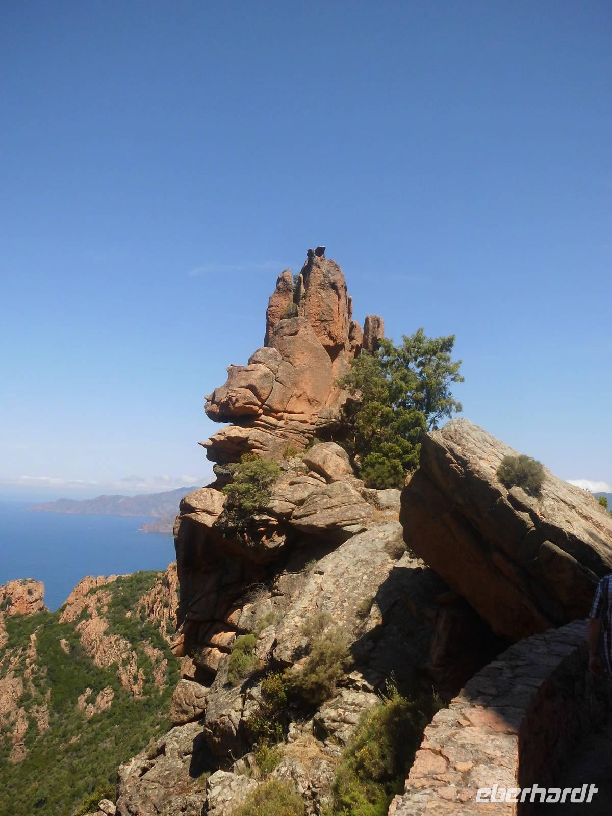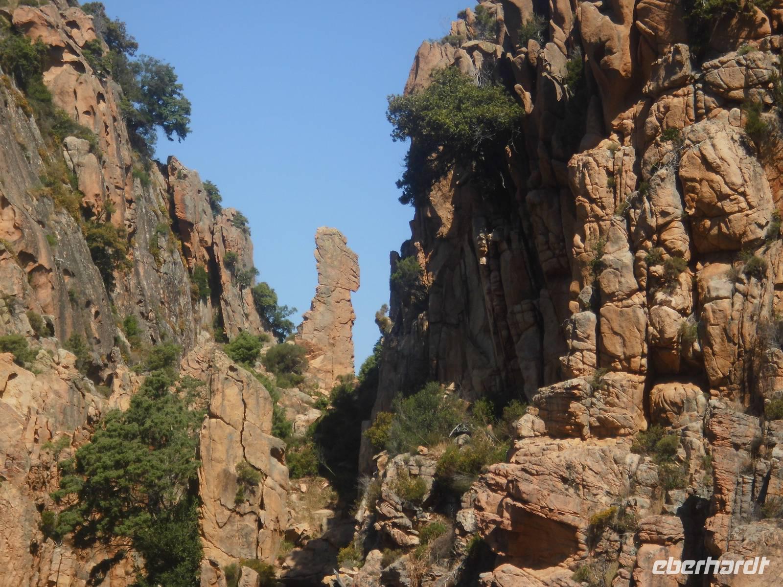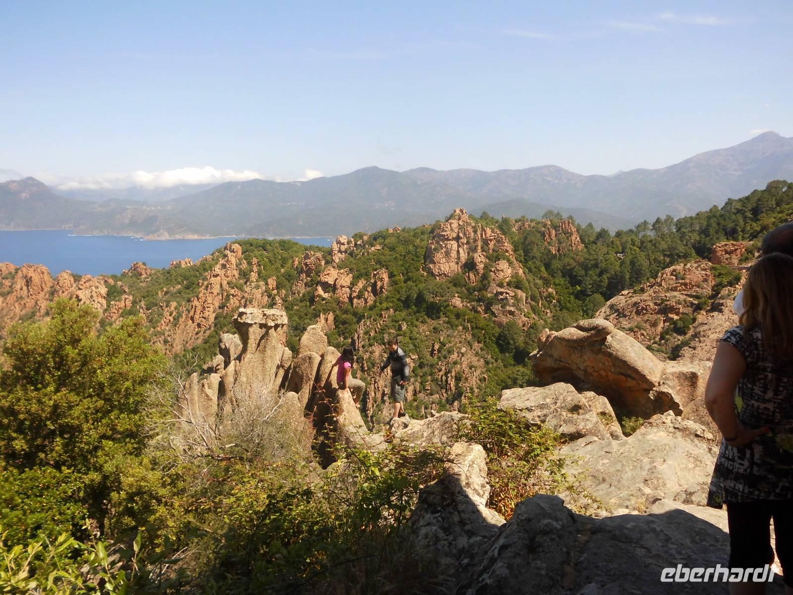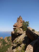 Einer der großen Reisehöhepunkte erwartete uns heute: die Fahrt durch die Felsenlandschaft der Calanche. Wir fuhren heute in einem korsischen Bus, gesteuert vom freundlichen Frederic, den wir alsbald zum ersten Fotostopp am Golf von Sagone überredeten, am Parkplatz der ersten griechischen Gründung auf Korsikas, der Stadt Cargese. Bis heute hat sie eine weströmisch und eine oströmisch katholische Kirche. Über Piana, in dessen malerischer Ortsmitte wir einen weiteren Stopp einlegten, errreichten wir schließlich die Calanche, das Reich der roten Felsen. Entstanden sind diese wohl berühmtesten Naturphänomene Korsikas durch Erosion ganz bestimmter Materialen und Mineralien, deren besondere Zusammensetzung und Art der Verwitterung „Tafoni" genannt wird und sich von anderen Erosionsphänomenen, die auch „Calanche" genannt werden - z.B. in den Abruzzen oder bei Marseille - unterscheiden. Wir hielten auf der Straße an und konnten ein paar Minuten durch die rötliche bizarre Felsenwildnis laufen, während der Bus ein paar hundert Meter weiter an einem kleinen Imbisslokal auf uns wartete. Mit etwas Phantasie kann man in den Formationen der gelben und roten Felsen - die kaum irgendwo so großräumig auftreten wie hier, die unterschiedlichsten Formen, Wesen, Gestalten und mystischen Kreaturen entdecken.