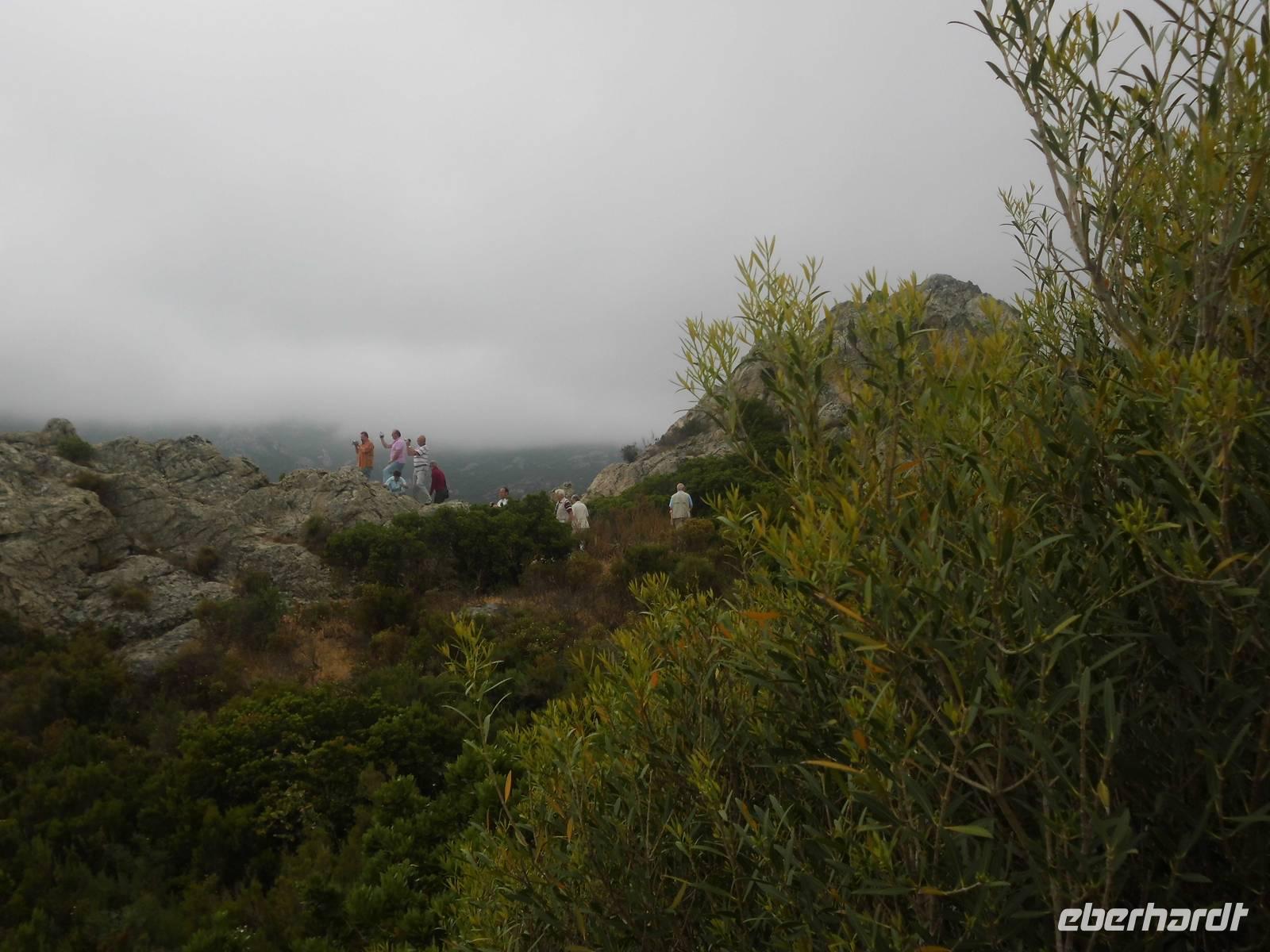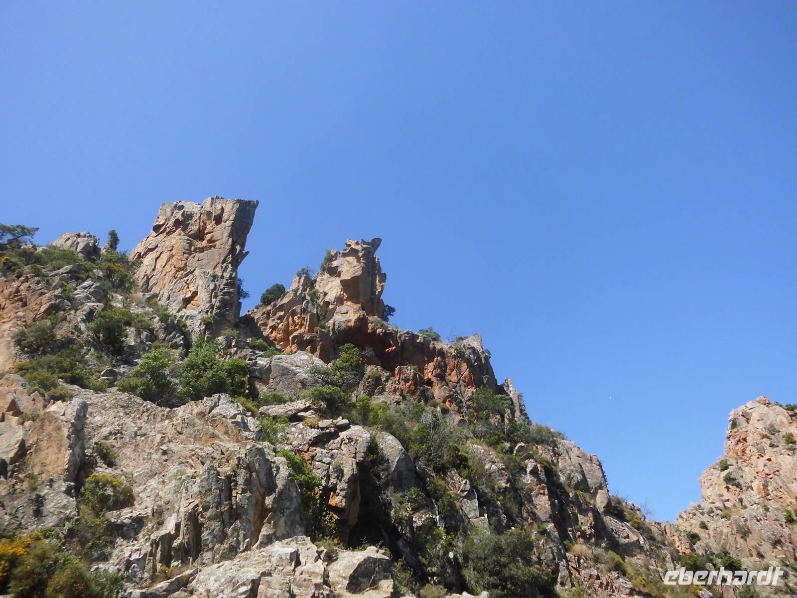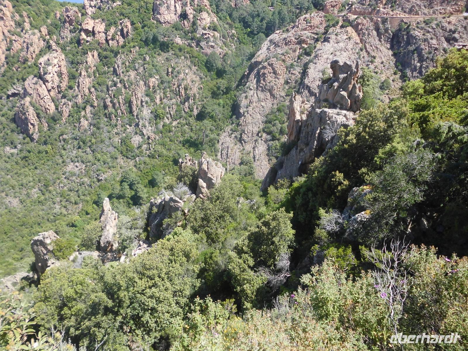 Einer der großen Reisehöhepunkte erwartete uns heute: die Fahrt durch die Felsenlandschaft der Calanche. Wir fuhren heute in einem korsischen Bus, gesteuert vom freundlichen Frederic, den wir alsbald zum ersten Fotostopp am Golf von Sagone überredeten, am Parkplatz der ersten griechischen Gründung auf Korsikas, der Stadt Cargese. Bis heute hat sie eine weströmisch und eine oströmisch katholische Kirche. Über Piana, in dessen malerischer Ortsmitte wir einen weiteren Stopp einlegten, errreichten wir schließlich die Calanche, das Reich der roten Felsen. Entstanden sind diese wohl berühmtesten Naturphänomene Korsikas durch Erosion ganz bestimmter Materialen und Mineralien, deren besondere Zusammensetzung und Art der Verwitterung „Tafoni" genannt wird und sich von anderen Erosionsphänomenen, die auch „Calanche" genannt werden - z.B. in den Abruzzen oder bei Marseille - unterscheiden. Wir hielten auf der Straße an und konnten ein paar Minuten durch die rötliche bizarre Felsenwildnis laufen, während der Bus ein paar hundert Meter weiter an einem kleinen Imbisslokal auf uns wartete. Mit etwas Phantasie kann man in den Formationen der gelben und roten Felsen - die kaum irgendwo so großräumig auftreten wie hier, die unterschiedlichsten Formen, Wesen, Gestalten und mystischen Kreaturen entdecken.