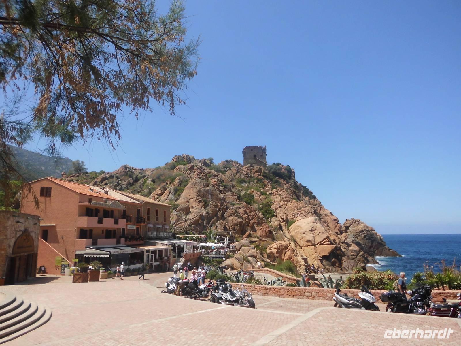 Einigen hat der Volksmund Namen zugeordnet, bei den anderen darf man „phantasieren" - was angesichts der grandiosen Farbkontraste zwischen tiefbklauem Meer, sattgrüner Vegetation und leuchtend roten Felsen nicht schwer fällt! . Zu Mittag hatten wir Zeit für einen Imbiss im malerischen Hafenstädtchen Porto, das von einer kleinen genuesischern Festung beherrscht wird und nur aus Hotels, Restaurants, Eisdielen und Souvenirläden zu bestehen scheint.