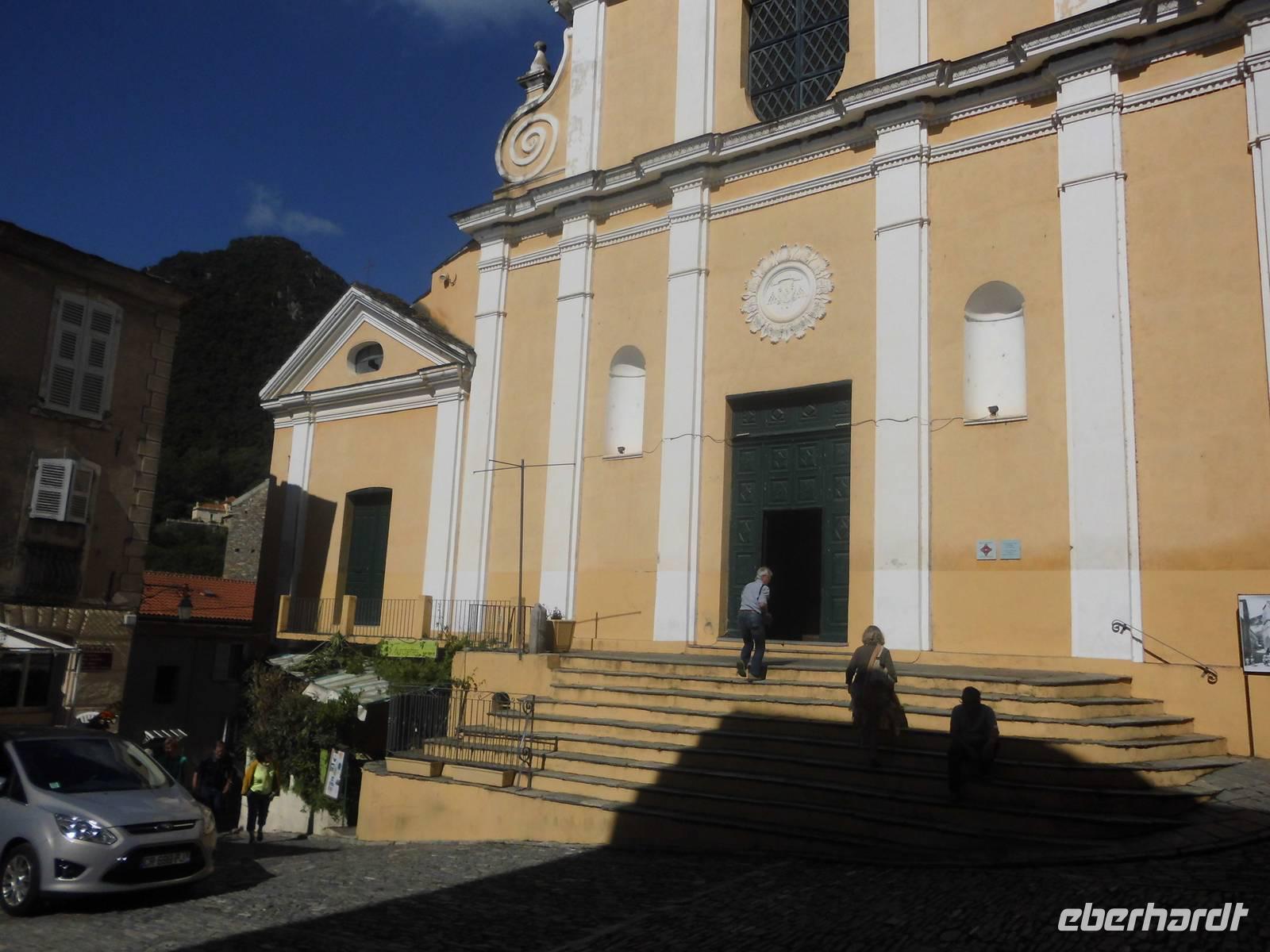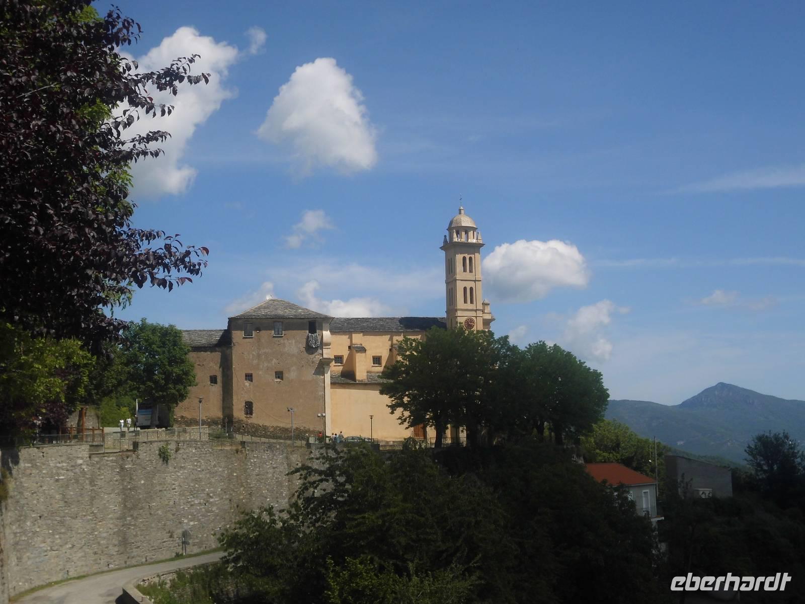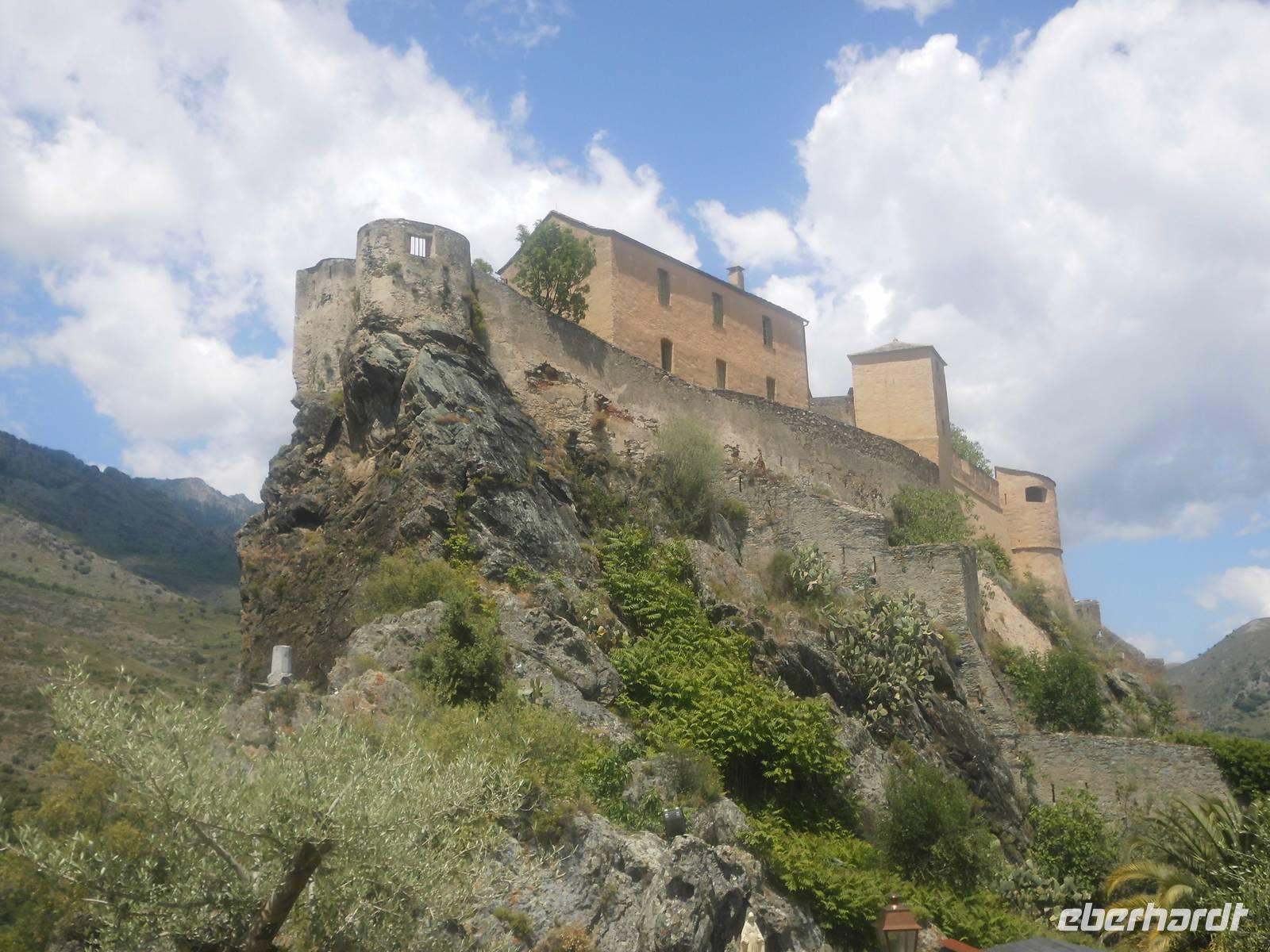 Heute war ein Ausflug das Land der Edelkastanie, die Castagniccia geplant. Die typische korsische Landschaft enthält zahllose Kastanienbäume, ganze Wälder, oft angepflanzt. Heute tun sich die wilden Schweine an den Früchten der verwildernden Bäume gütlich, aber zu Genueser Zeiten war der „Brotbaum", wie die Eßkastanie hier noch manchmal genannt wird, das Hauptnahrungsmittel. Kastanienkuchen - den wir natürlich verkosteten - wird bis heute aus dem Mehl gebacken und das typische korsische Getränk - das „Pietra"-Bier - ist nichts anderes als Kastanienbier. Wir erreichten die Lasndschaft bei Cervione, ein Ort, der sich einst für dsechs Monate als „Hauptstadt Korsikas" bezeichnen durfte, denn hier residierte König Theodor I., ein deutscher Abenteurer, den korsische Adelige zum König gekrönt hatten, damit er dem Land zur Unabhängigkeit verhelfe. Hier hatten wir ein paar Minuten Zeit, um uns die alte Bischofskirche und den Palast anzusehen, dann ging es durch die gewundenen engen Straßen der Castagnicca nach Piedocroce, einem hübschen Ort mit interessanter, freistehender Kirche. Von hier aus verließen wir die „Kastanienlandschaft" und gelangten nach Corte, jener Bergstadt, in der sich von 1755 bis 1769 während der Regierung von Pasqual Paoli der Regierungssitz des korsischen Staates befunden hatte. Wenn Calvi genuesisch, Ajaccio französisch und Bastia italienisch ist, dann ist Corte unbedingt korsisch! Wir erreichten die von ihrer Festung dominierte Stadt in der Inselmitte gegen Mittag. Ein typischer „kleiner Zug" für Touristen brachte uns in die Altstadt. Während der Fahrt hörten wir historische und Streckenkommentare auf Deutsch. Holpernd durch steile, mit Kopfstein und Kieseln gepflasterte Gassen gelangten wir zum Platz unterhalb der Zitadelle. Dominiert vom Denkmal eines bedeutenden Korsen, General Gaffori, bildet er neben dem Place Paoli einen der zentralen Punkte der Stadt. Vom Platz Gaffori stiegen wir zunächst zum Aussichtspunkt Belvedere auf, von wo man nicht nur die umliegende Bergwelt und die Dächer der Stadt herrlich sehen, sondern auch einen „Postkartenblick" auf die krönende Burg, das „Adlernest" hat. In der anschließenden Freizeit konnten wir durch die Gassen mit ihren zahlreichen Lokalen bummeln oder zu einem Mittagsimbiss einkehren.