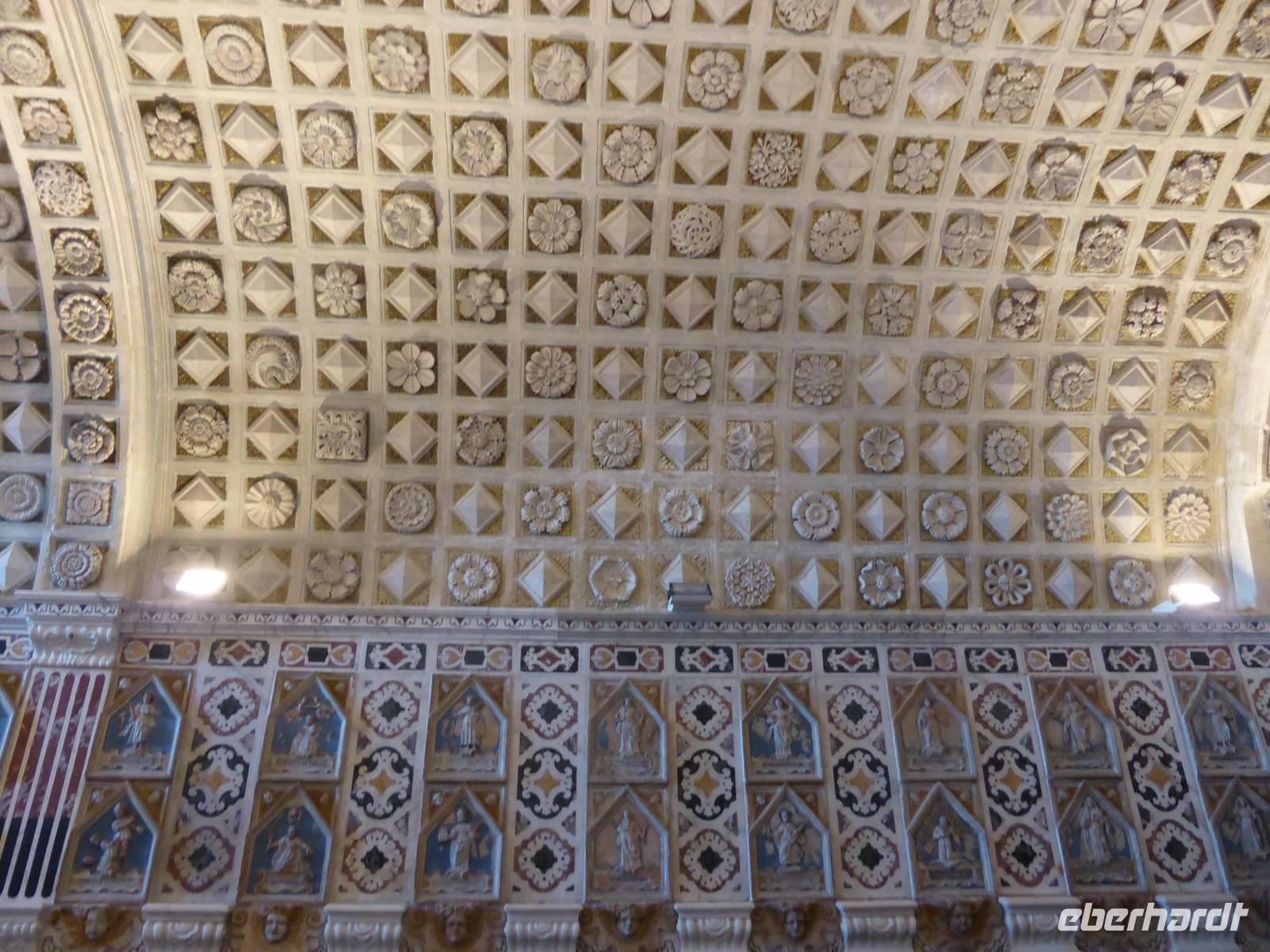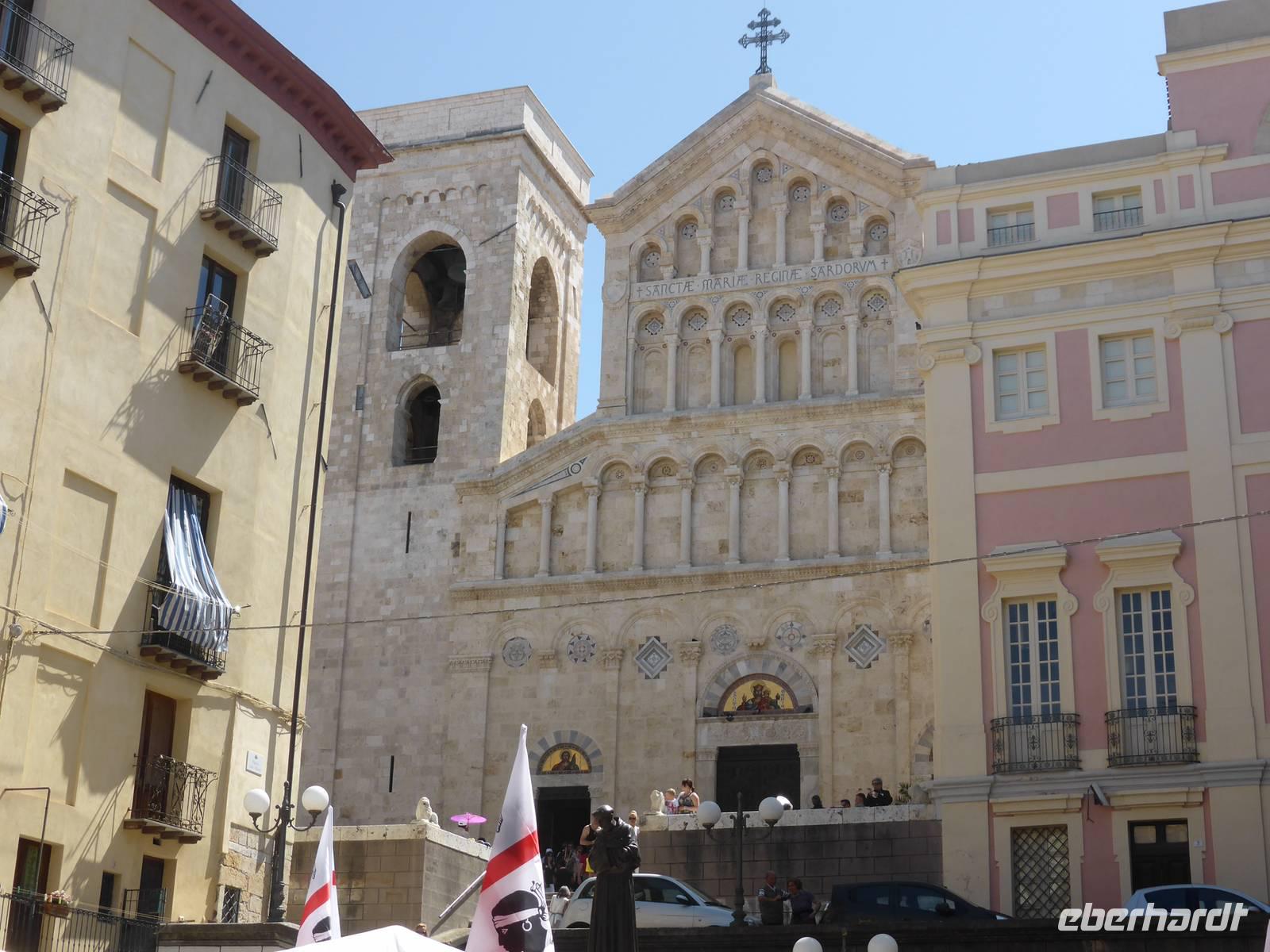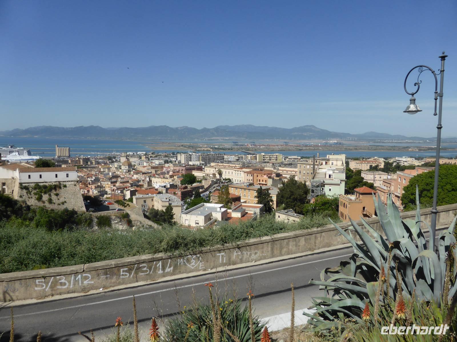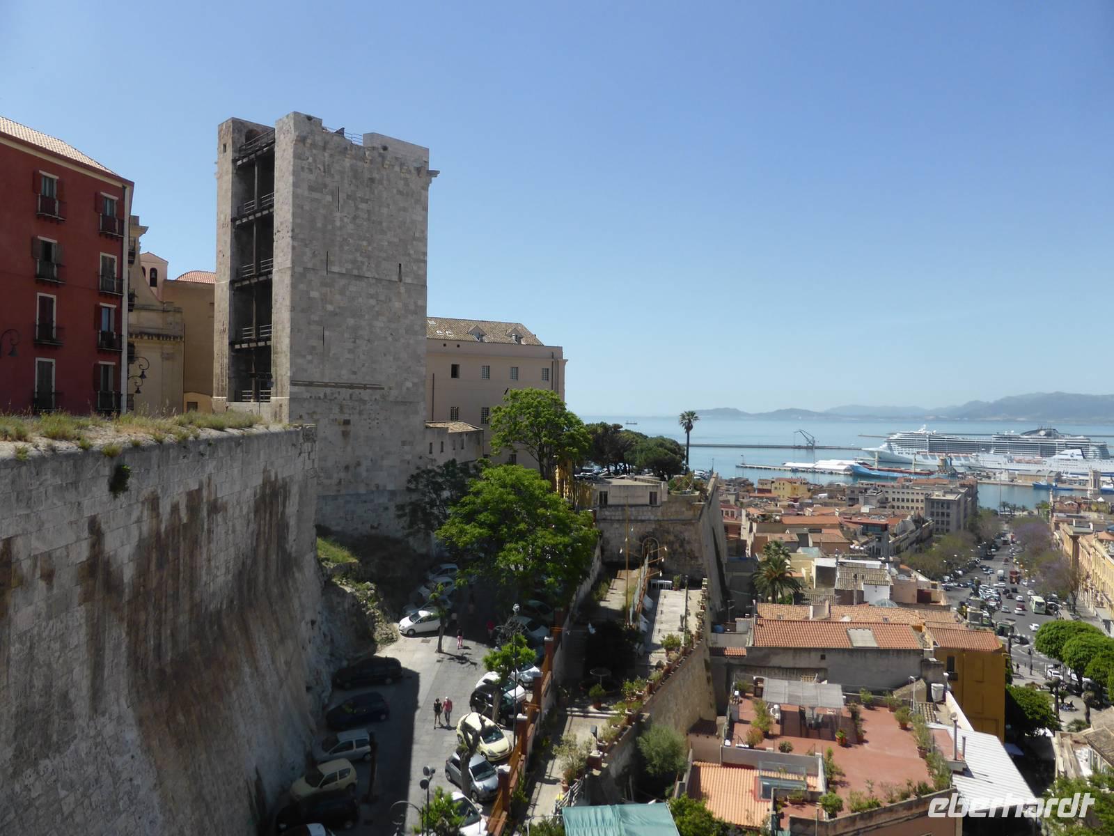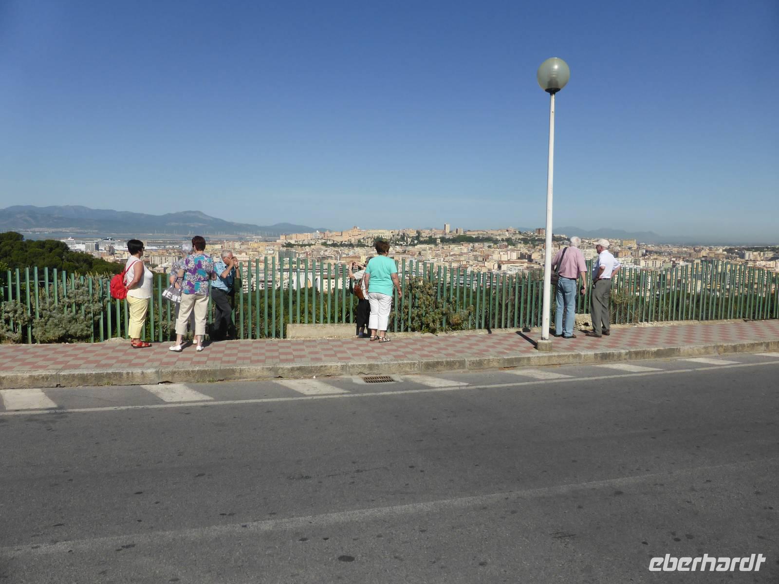 Auf der Weiterfahrt zum Castello (Altstadt) lernten wir das Stadtviertel Villanova kennen. Den Bus verließen wir am mächtigen Tor vom Torre S. Pancrazio und begannen unseren Stadtrundgang. Da ein Kreuzfahrtschiff im Hafen lag war die Altstadt voller Menschen. Auf unserem Rundgang besichtigten wir die Kathedrale Santa Maria di Castello. Bei dieser Besichtigung ließen wir auch die bekannte Krypta nicht aus. Besonders eindrucksvoll ist das mit unzähligen Rosetten verzierte Tonnengewölbe. Vorbei am Elefantenturm, der seinen Namen nach einer Marmorstatue, einem kleine Elefanten als Sinnbild von Weisheit und Stärke erhalten hat, verließen wir die Altstadt und erreichten den Platz Yenne. Auf diesem lebhaften Platz steht eine Ziersäule aus rotem Porphyr, davor erhebt sich das Standbild König Carlo Felice, des Auftraggebers der hier beginnenden Schnellstraße Cagliari - Porto Torres.