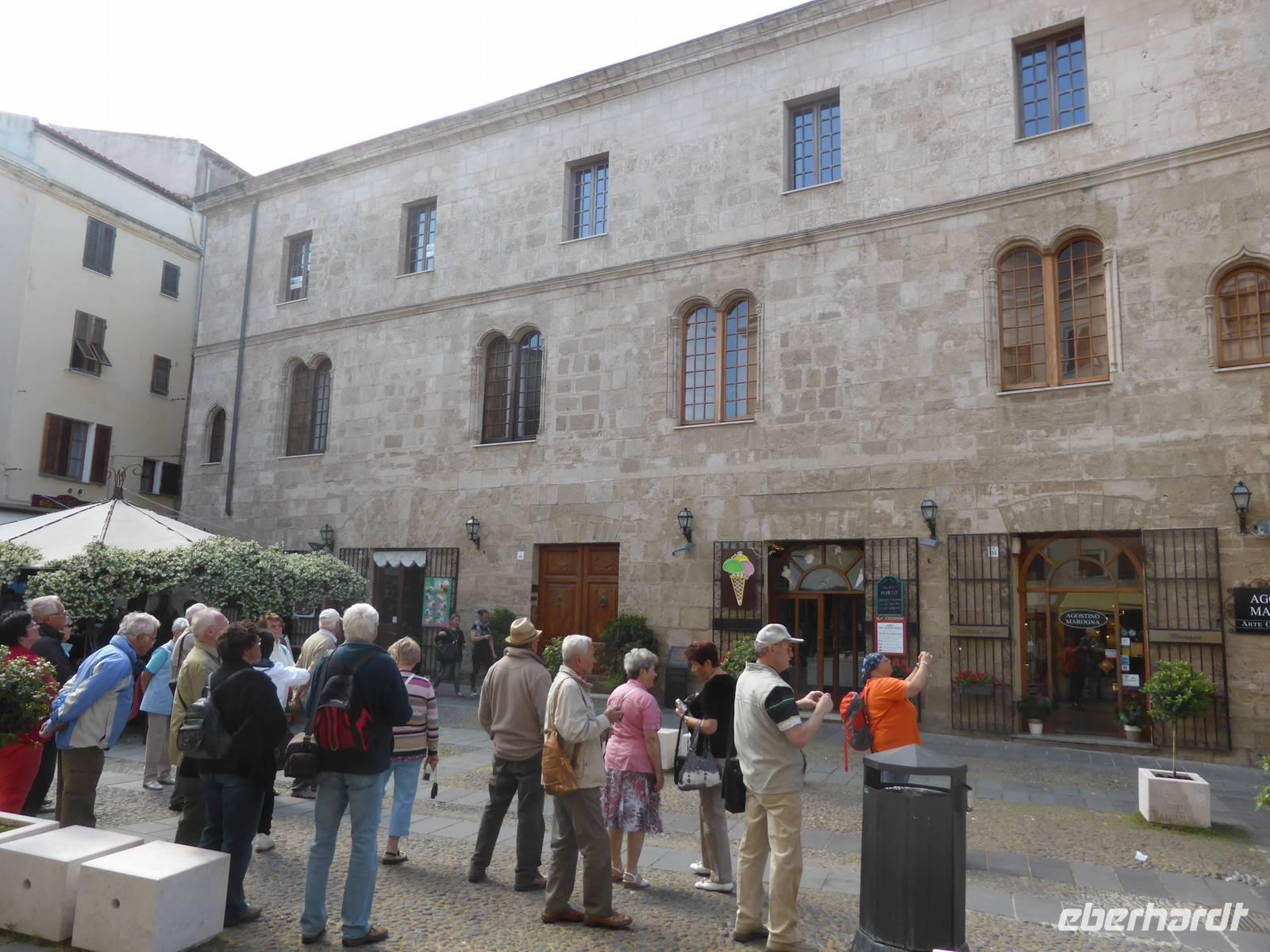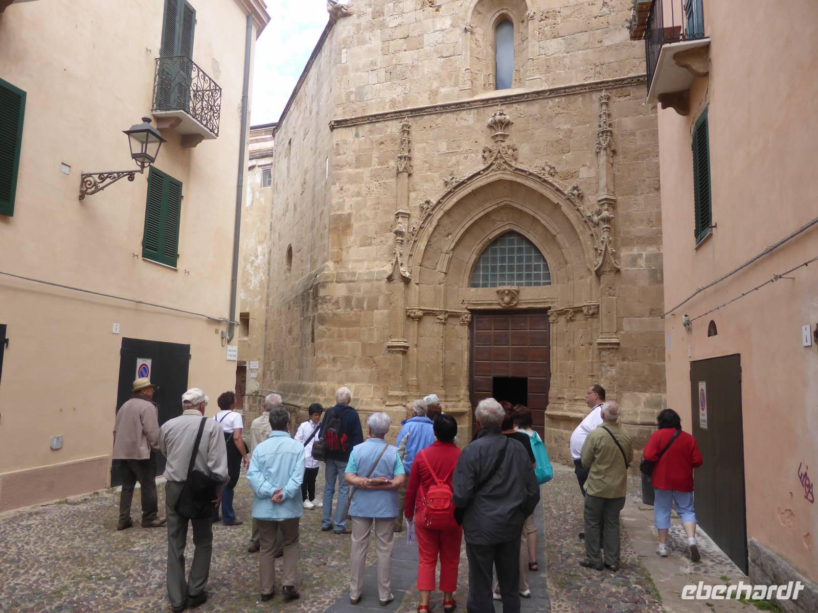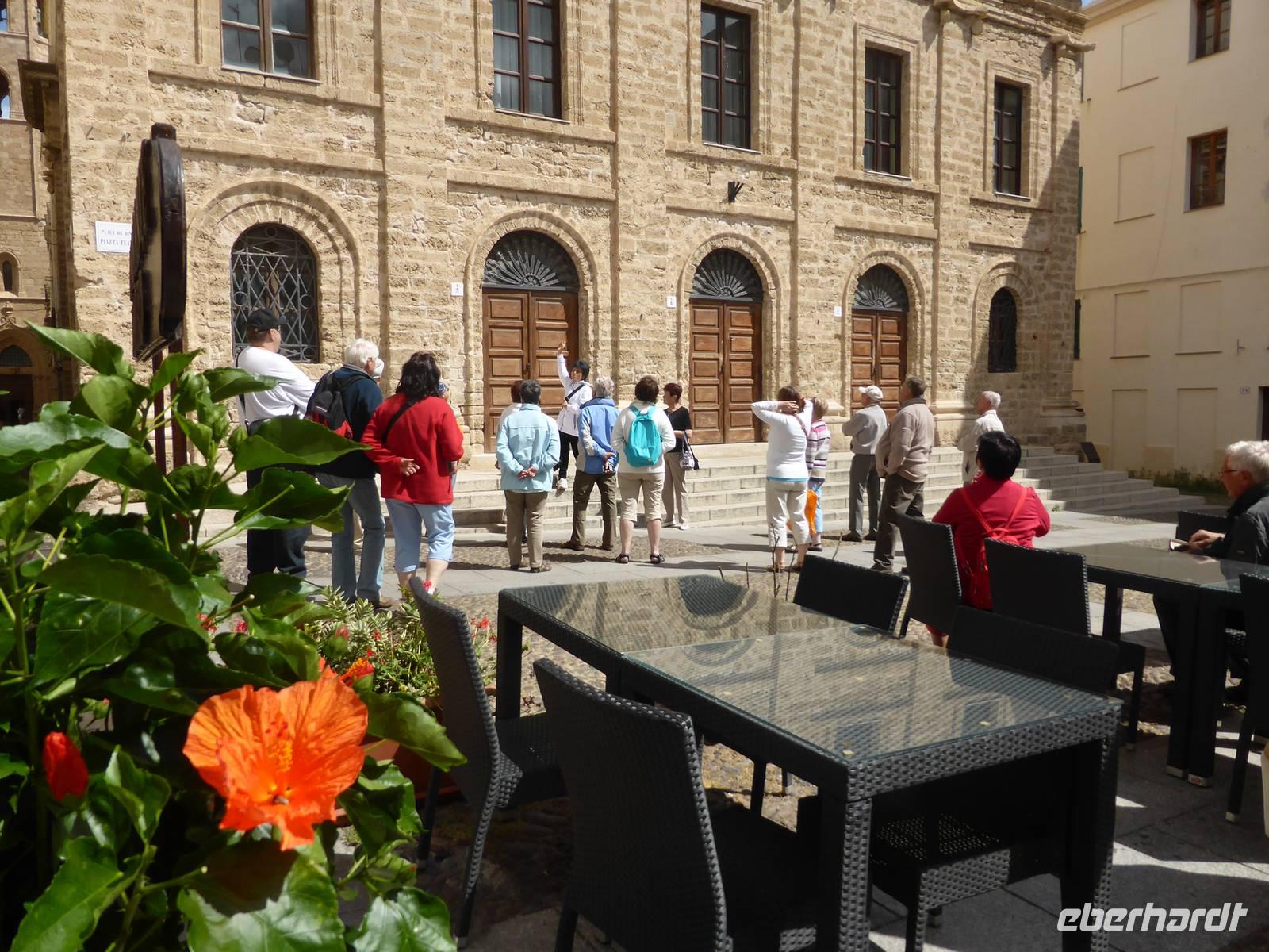 Am heutigen Tag erkundeten wir mit unserer Reiseleitung Marcella die Stadt Alghero. Die Altstadt der spanischsten Stadt der Insel liegt gedrängt auf einer Landzunge umgeben von der Festungsmauer. Trotz der schweren Zerstörungen des Zweiten Weltkrieges ist das Zentrum der Altstadt zum größten Teil intakt. Während unseres Stadtrundganges sahen wir Piazza Civica, der „guten Stube" der Bürger von Algheros. Wir gelangten zur Kathedrale Santa Maria mit ihrem ungewöhnlich achteckigen Glockenturm. Durch die Altstadtgassen erreichten wir die San Francesco Kirche. Hinter der schlichten Fassade verbirgt sich ein sehenswertes Inneres sowie ein, aus 22 Säulen bestehender Kreuzgang aus Sandstein.