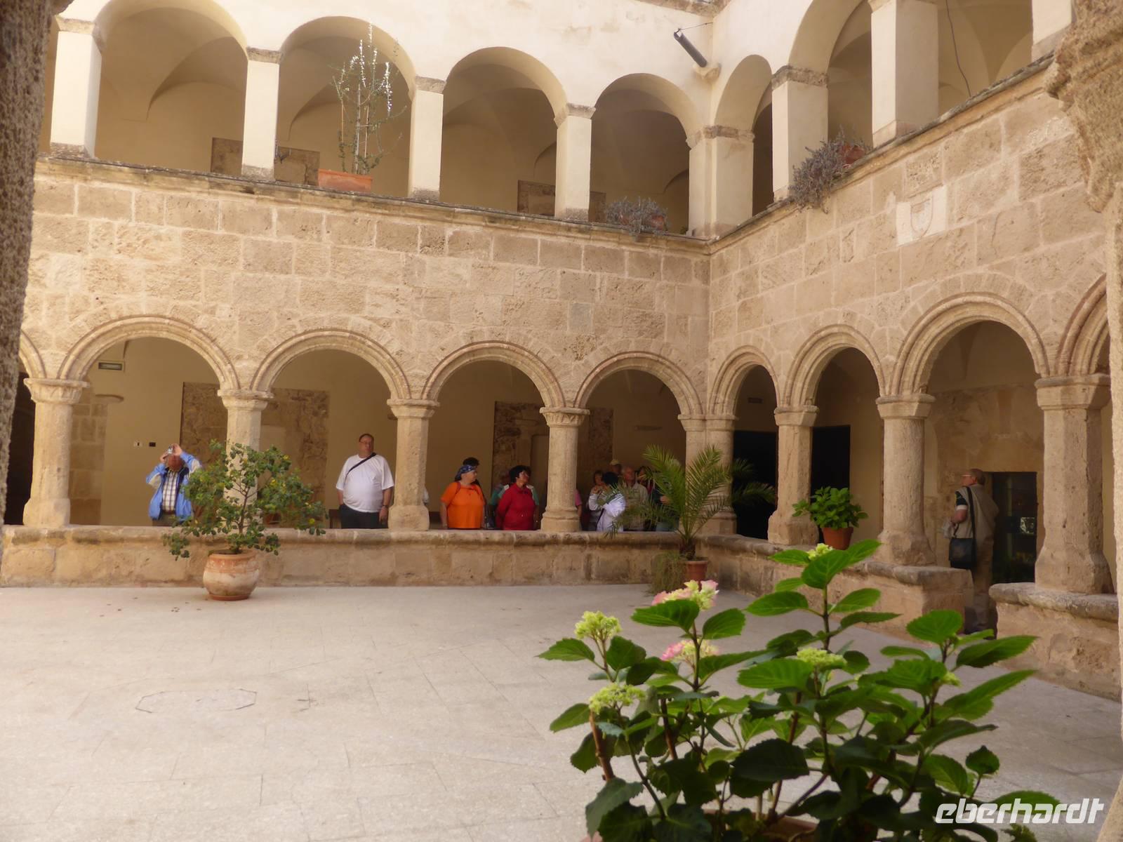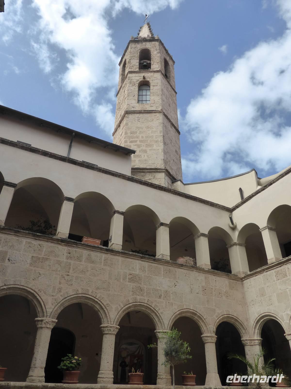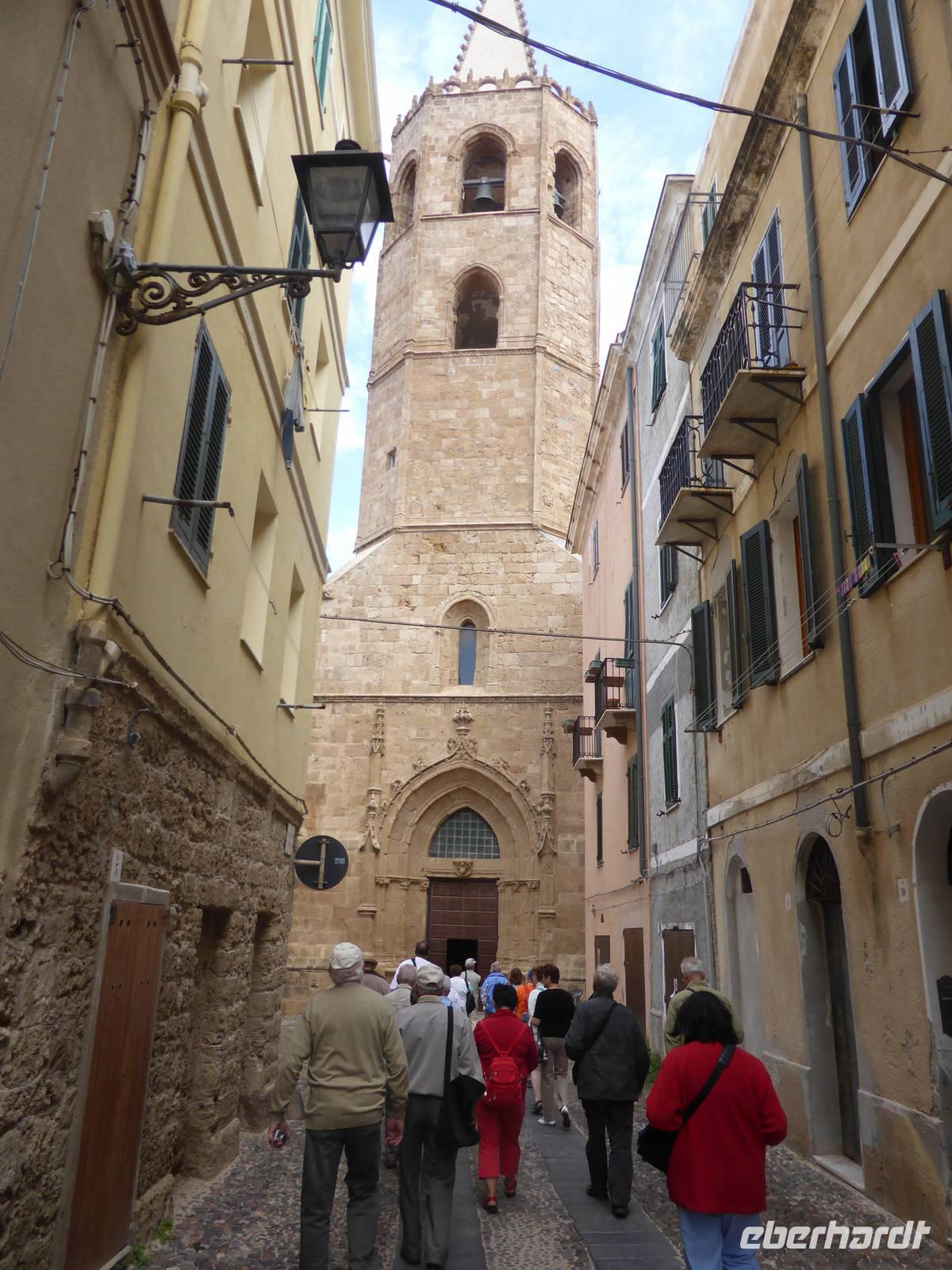 Am heutigen Tag erkundeten wir mit unserer Reiseleitung Marcella die Stadt Alghero. Die Altstadt der spanischsten Stadt der Insel liegt gedrängt auf einer Landzunge umgeben von der Festungsmauer. Trotz der schweren Zerstörungen des Zweiten Weltkrieges ist das Zentrum der Altstadt zum größten Teil intakt. Während unseres Stadtrundganges sahen wir Piazza Civica, der „guten Stube" der Bürger von Algheros. Wir gelangten zur Kathedrale Santa Maria mit ihrem ungewöhnlich achteckigen Glockenturm. Durch die Altstadtgassen erreichten wir die San Francesco Kirche. Hinter der schlichten Fassade verbirgt sich ein sehenswertes Inneres sowie ein, aus 22 Säulen bestehender Kreuzgang aus Sandstein.