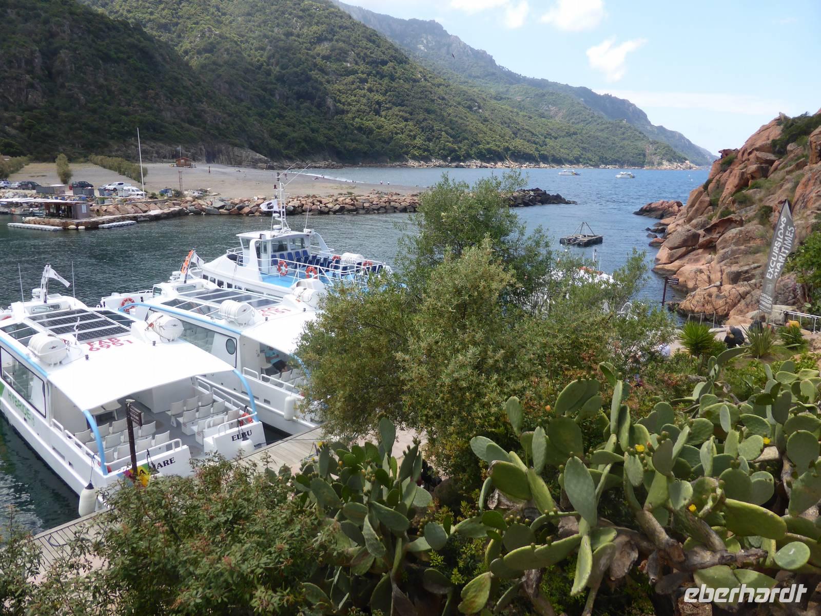 Nach diesem Naturereignis fuhren wir weiter nach Porto zur Mittagspause. Bernd und Claudia überraschten uns mit einem kleinen Picknick mit sardischen und korsischen Spezialitäten. Während der Schifffahrt zum Capo Rosso lernten wir die phantastische Küstenlandschaft kennen. Wir entdeckten die Grotte der Verliebten, den Felsen in Form von Korsika sowie das Rote Kap. Von dieser spektakulären Felsenlandschaft des Golfes von Porto mit Fischadlernestern und sogar einem Fischadler waren alle fasziniert. Im Anschluss fuhren wir durch die wildromantische Spelunca Schlucht, welche ein Werk von den Flüssen Aitone und Tavulella ist. Über Vico und den Golf von Sagone ging es zurück nach Ajaccio.