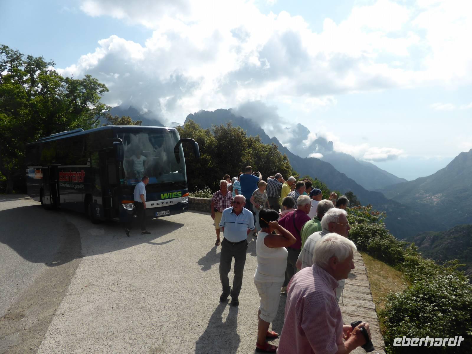 Die alte, hoch auf einem Felsen errichtete Festung wacht noch heute über Corte. Durch Pascal Paoli, dem Vater des Vaterlandes, wurde Corte ein erstaunliches Geschick zuteil. Er wählte Corte zur Hauptstadt und dem Sitz der Regierung der korsischen Nation zwischen 1755 und 1769. Auf der Fahrt mit dem Bummelzug in die Altstadt erfuhren wir viel Wissenswertes über die Stadt und ihre Geschichte. Besonders malerisch ist die enge Altstadt mit steilen, kieselgepflasterten Gassen. Vom Platz Gaffori bummelten wir zum Aussichtspunkt und genossen einen schönen Blick auf die umliegende Bergwelt sowie die Dächer der Stadt. Während unseres Stadtbummels legten wir einen Stopp beim Bäcker ein, um die typischen Falculella (Milchbrot mit Brocciu Käse) zu kosten. Der Zug brachte uns dann wieder zurück zum Bus. Unsere Mittagspause legten wir an der bekannten Ponte Novu ein, wo die entscheidende Schlacht zwischen Korsika und Frankreich am 08.05.1769 stattfand.
