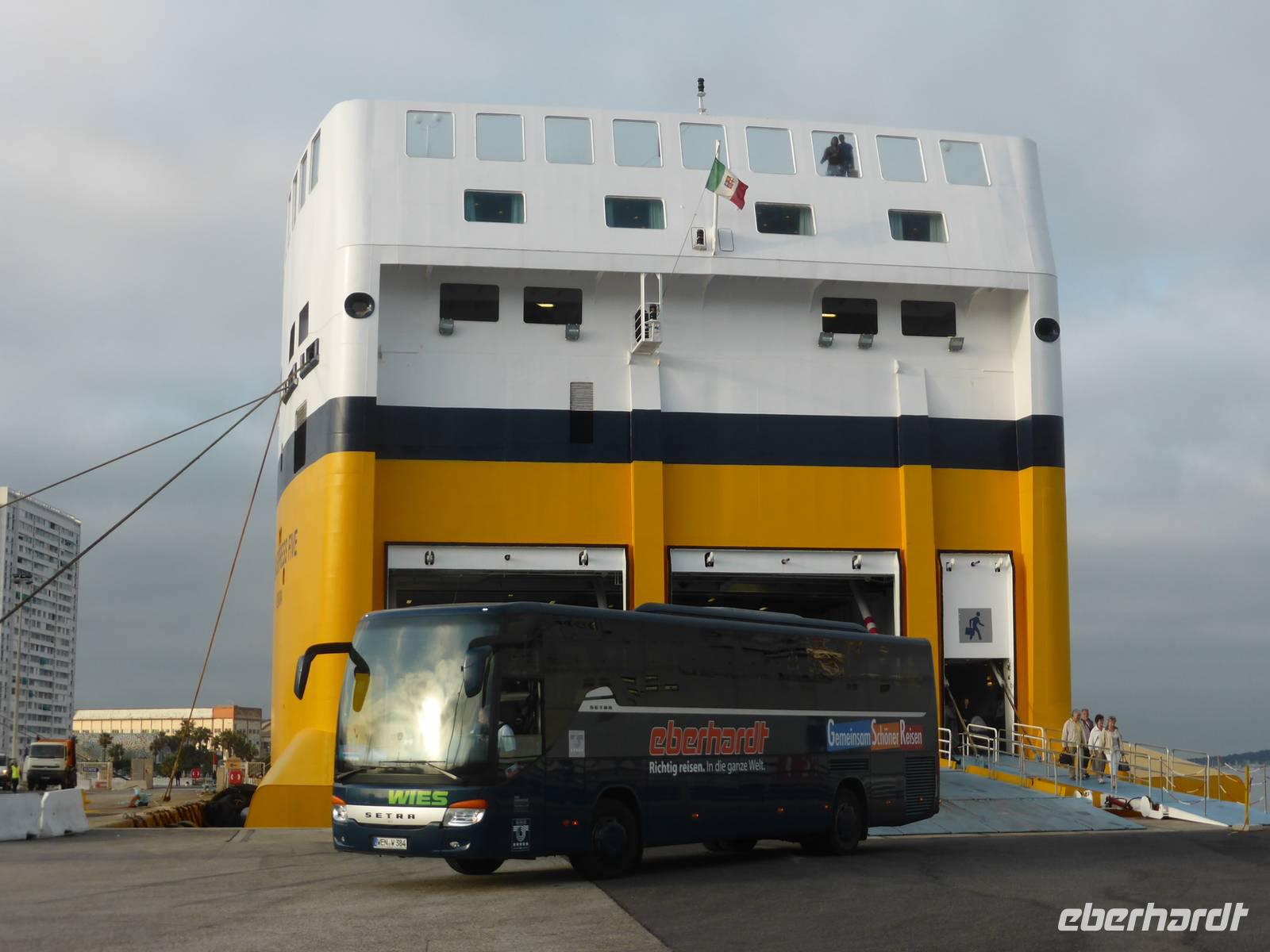 Die Weiterreise führte uns durch das Eisack- und Etschtal an den Gardasee. Von Torbole nach Garda genossen wir entlang der Ostuferstrasse die Ufer des Gardasees. In Garda legten wir einen kleinen Stopp zum Bummeln, Eis essen und flanieren ein. Durch die Oberitalienische Tiefebene erreichten wir die Appeninen. Entlang der Versiliaküste mit dem schönen Panorama der Apuanischen Alpen mit den Carrarar Marmorbrüchen gelangten wir am Abend in den Hafen von Livorno. Livorno ist der wichtigste Hafen der Toskana und somit Ausgangspunkt für die Fähren nach Sardinien und Korsika. Unser geplantes Schiff Mega Express 2 stand nicht im Hafen, sondern die „Regina". Es sollte der Ersatz für die Mega Express sein, da diese aufgrund von technischen Problemen nicht zum Einsatz kommen konnte. Dies brachte uns zwar gut nach Sardinien, aber die Nacht war aufgrund des Lärms recht kurz.