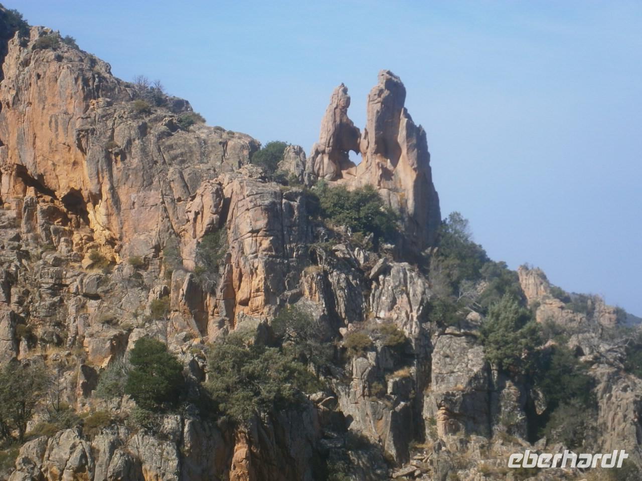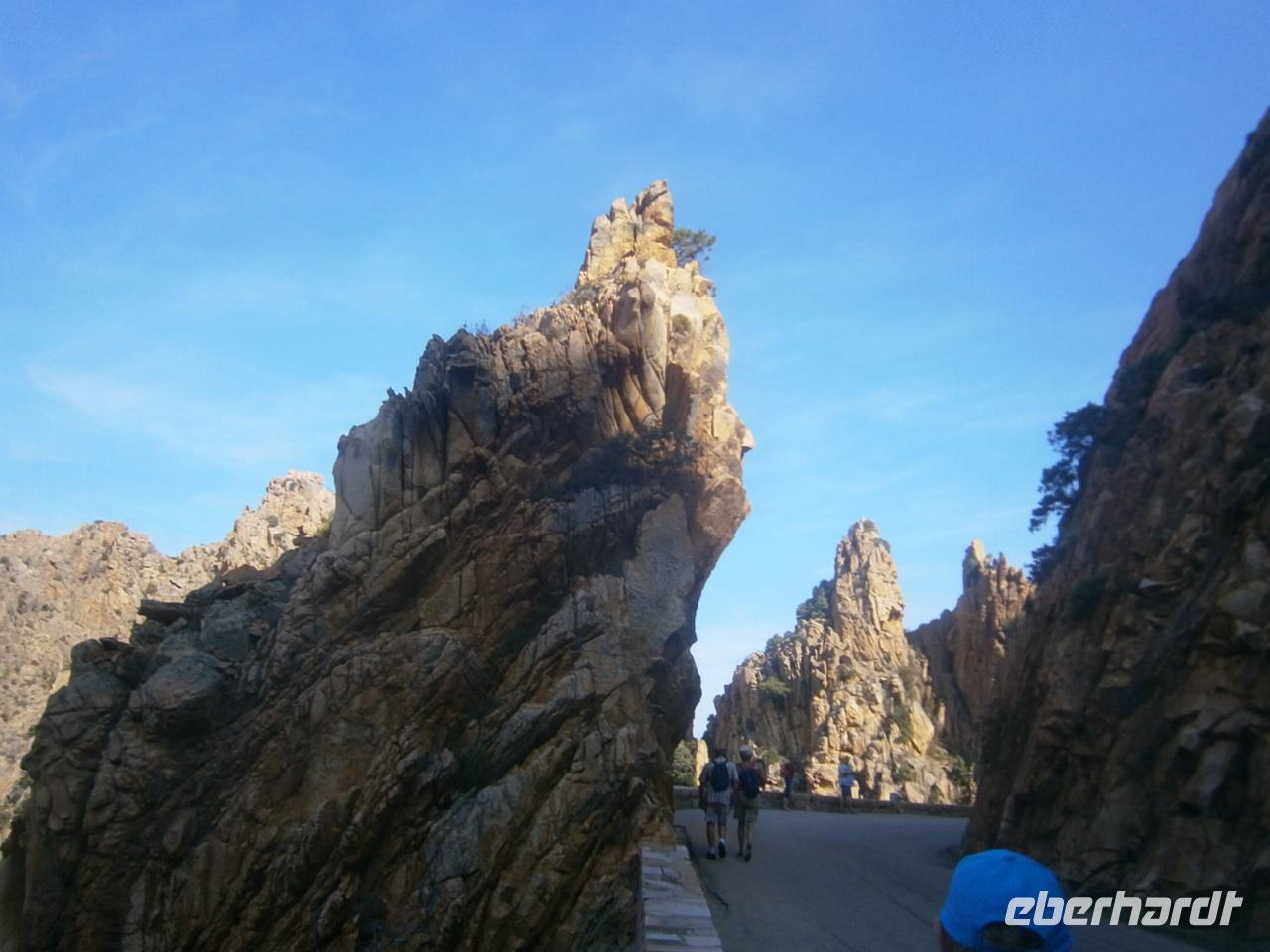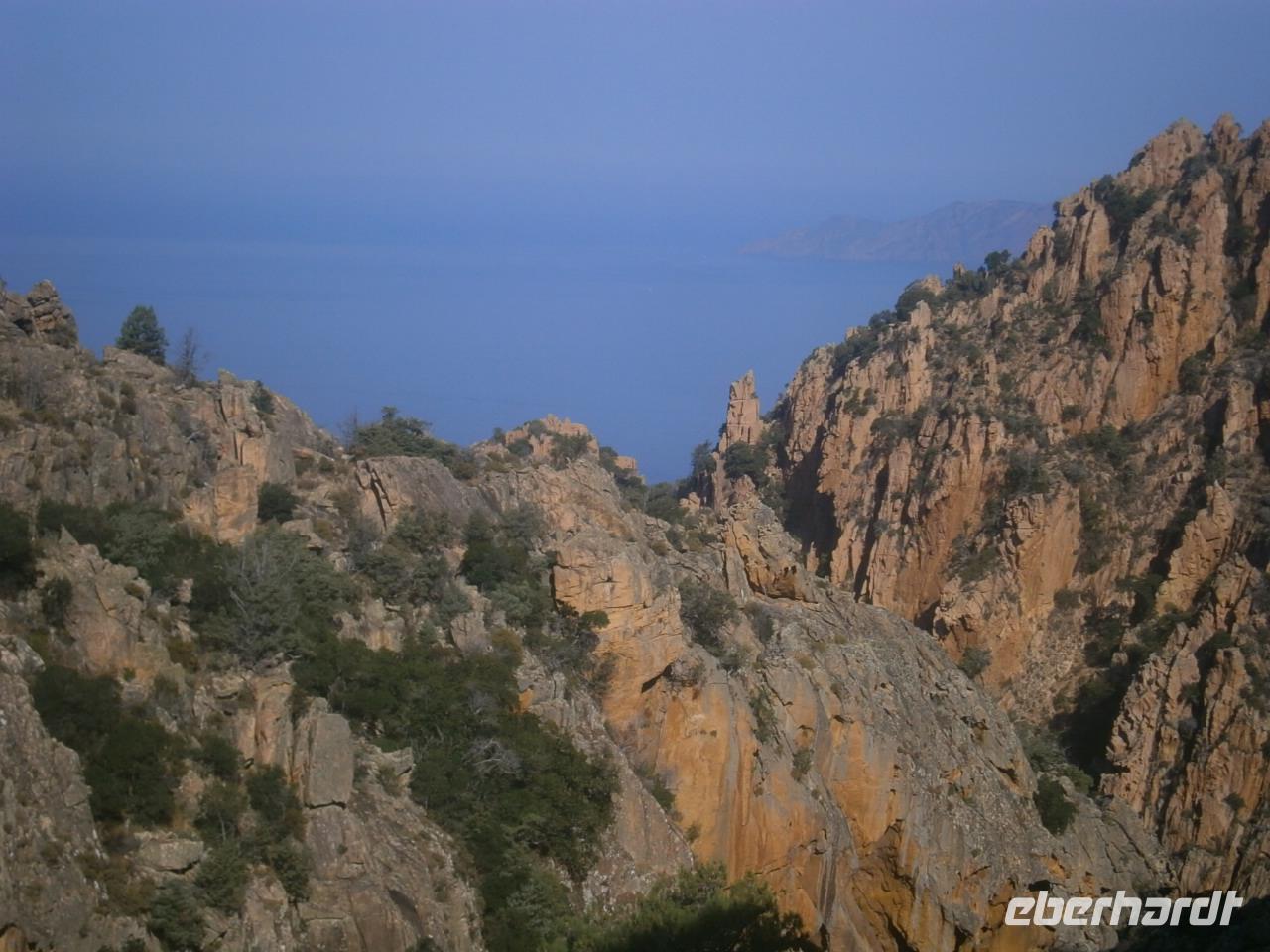 Das Gebiet der Cinarca ist landwirtschaftlich geprägt - hier gedeihen Oliven, Zitrusfrüchte, Weinreben, Obst und Gemüse. Begrenzt wird es unter anderem vom Golf von Sogone. Sogone das ist auch der Fluss an dessen Mündungsgebiet einer der ältesten Orte Korsikas entstanden ist. Ebenfalls am Golf von Sogone liegt die Ortschaft Cargese. Sie wurde im 17. Jahrhundert von griechischen Einwanderern gegründet. Weiter der Straße folgend kommen wir durch Piana. Der Ort zählt zu den „schönsten Dörfern Frankreichs". Grund dafür ist die ausgesprochen sensationelle Lage, reichlich 430 m hoch über dem Golf von Porto auf einer Hochebene. Piana ist Ausgangsort für die Fahrt in die Calanche. Um diesen Wunder der Natur hautnah genießen zu können verlassen wir unseren Bus und spazieren entlang der Strecke. Immerhin sind wir dabei schneller als so manches Fahrzeug, denn an diesem Tag sind scheinbar alle Touristen in der Calanche unterwegs. Sie ist ein eindrucksvolles Naturphänomen. An der Südseite des Golfes von Porto erstreckt sich diese einmalige Felsenlandschaft. Mit den bizarren Felsformationen. Mit den sogenannten 'Tafoni', zählt die wild zerklüftete Calanche sicherlich zu den schönsten Landschaften von Korsika. Hier haben Wind, die salzhaltige Luft und der Wechsel von Regen und Sonne die roten Granitfelsen in seltsame Figuren aufgelöst. Besonders beeindruckend ist das Naturschauspiel beim Sonnenuntergang, wenn die Felsen in Rot getaucht werden.