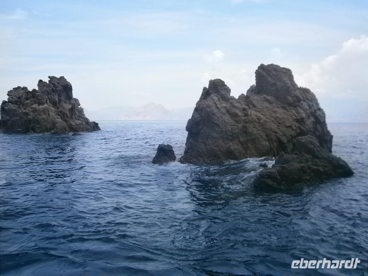 ....um am nächsten Morgen vor der geplanten Ankunftszeit im Hafen von Golfo Aranci, an der Ostküste Sardiniens anzulegen. Die Mittelmeerinsel empfängt uns bei angenehmen warmen Temperaturen und wir beginnen unsere Tagesetappe entlang der Küstenstraße an der Costa Smeralda. Dieses Küstengebiet wurde in den letzen Jahrzehnten für den gehobenen Tourismus erschlossen. Es ist gerade in den Sommermonaten das Urlaubsziel für viele Prominente, für die Schönen und die Biegsamen. Also auch für die Reisegruppe von Eberhardt Travel. Im mondänen Ort Porto Cervo spazieren wir gemeinsam über die kleine Piazzaetta um zum Hafen zu kommen. Das jedes Jahr im September die Segelregatta Rolex Swan Cup statt findet liegen an diesem Tag zahlreiche Luxusliner im Hafen. Oberhalb befindet sich die kleine Kirche Stella Maris. Erbaut wurde sie 1968 im neosardischen Stil, die Inneneinrichtung ist sehr bescheiden und dennoch ist die Kirche für viele das Wahrzeichen an der Costa Smeralda. Auch für Hochzeiten wird sie genutzt, zum einen zeugt das Aufgebot davon und zum anderen die Reiskörner die wir noch auf den Stufen sehen können.