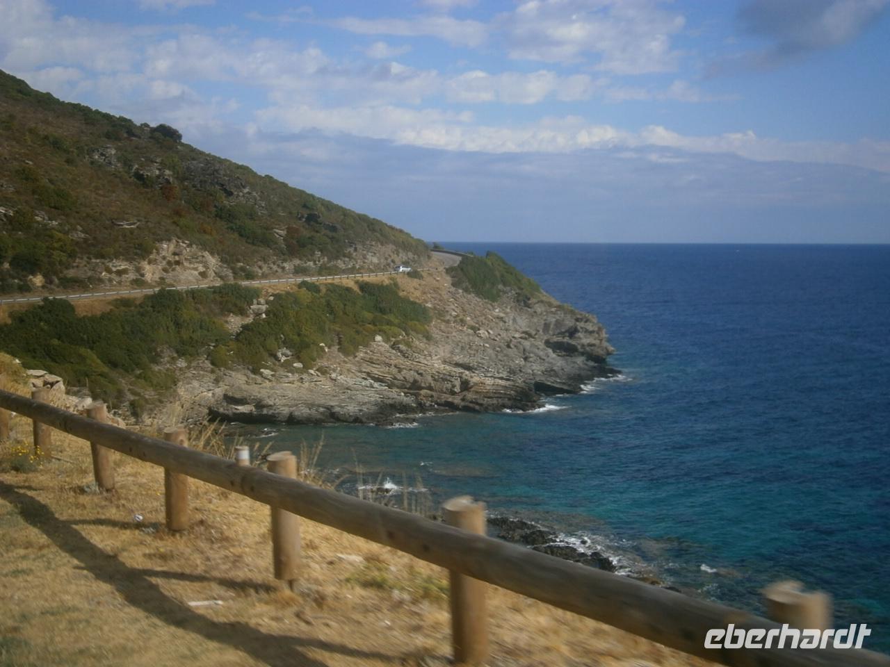 Unsere Fahrt geht weiter nach Macinaggio. Heute besitzt der Ort den größten Jachthafen des Cap Corse. Macinaggio ist in der Saison ein quirliger Ort mit viel Leben. Entlang der Hafenpromenade reiht sich ein Restaurant und eine Bar an die andere. Der Hafen bietet Platz für über 500 Boote. Hier verbringen wir die Mittagspause und fahren anschließend über den Col de la Serra zu Moulin Mattei. Von der restaurierten Windmühle hat man bei klarer Sicht den Blick frei über das Küstengebiet und bis zur Insel Capraja. Entlang der Westküste, die steiler ins Meer fällt, fahren wir durch viele kleine Ortschaften, am alten Asbestwerk vorbei und erreichen schließlich die Höhe von Nonza. Der schwarze Strand von Nonza bietet dem Betrachter etwas besonderes. Viele Besucher schreiben mit herumliegenden weißen Steinen Liebeserklärungen oder andere Botschaften auf den Strand, die dann vom Turm von No nza aus gelesen werden können. Einen letzten Aufenthalt machen wir in St. Florent. Es ist der Hauptort der Region Nebbio und liegt am Golf St. Florent. Mediterranes Flair macht den Ort zum korsischen Saint Tropez. Gerade in den Sommermonaten kommen zahlreiche zahlungskräftige Touristen. Im Yachthafen, in den Restaurants und Cafes, in den kleinen Gassen der Altstadt ist dann „La dolce Vita". Über die Conca d'Oru, „goldene Muschel", so wird das in Terrassen angelegte Hinterland genannt, führt uns die Straße entlang durch Weideland, Weinanbaugebiete, Oliven- und Korkeichenwälder zum Col de Terghime. Hier haben wir noch einmal den Blick zurück auf den Golf von St. Florent und voraus auf die Laguneninsel und die Stadt Bastia. Hier kommen wir schließlich bei strömenden Regen am Fährterminal an. Am Schalter der Fährgesellschaft heißt es dann Ausdauer und Ruhe bewahren. Nach erfolgreicher Paß,- Personen- und Buskontrolle erreichen wir als letzte unser Schiff. Wir dürfen im Bus auf das Schiff fahren und hinter uns schließt sich die Klappe.