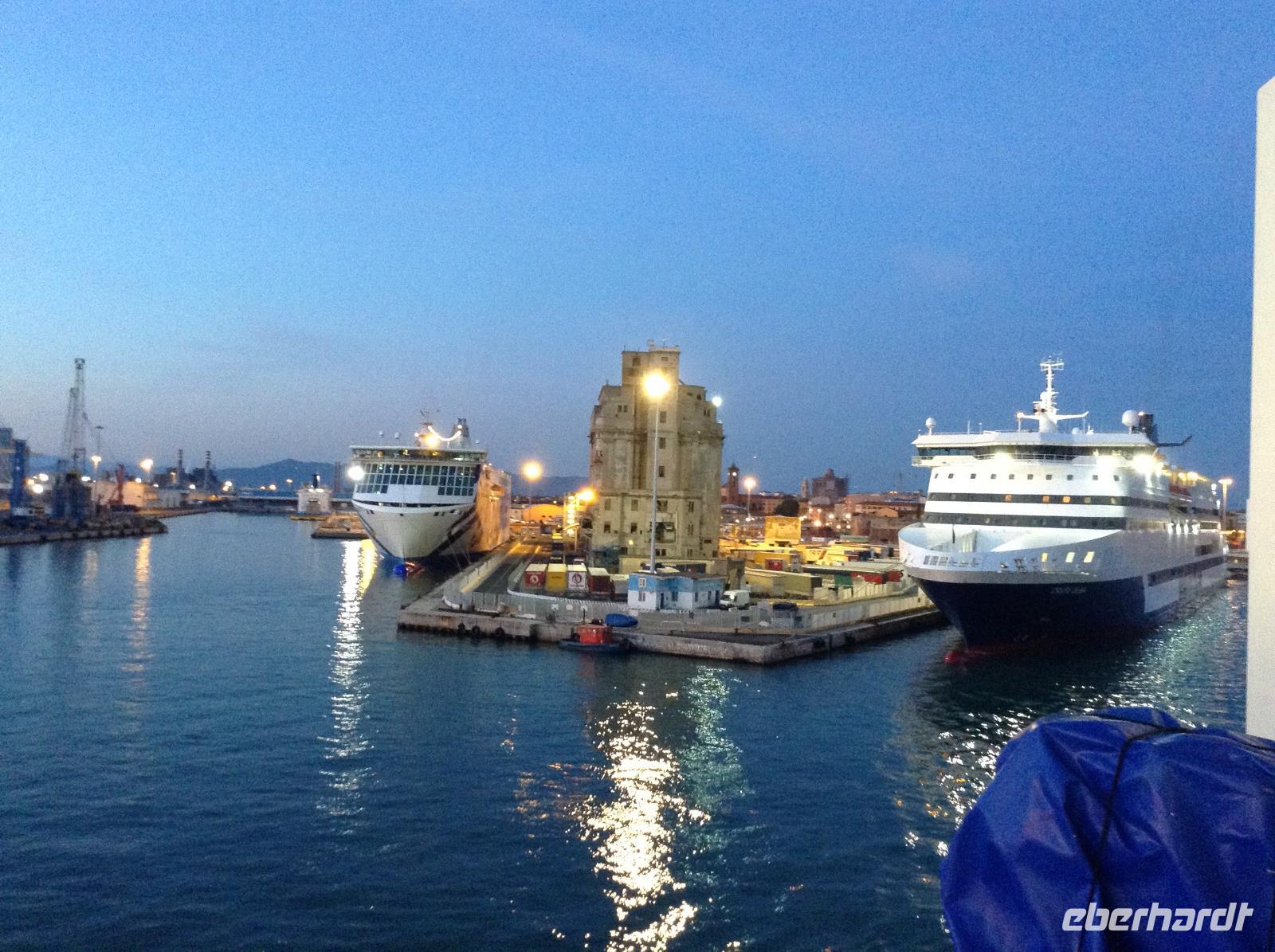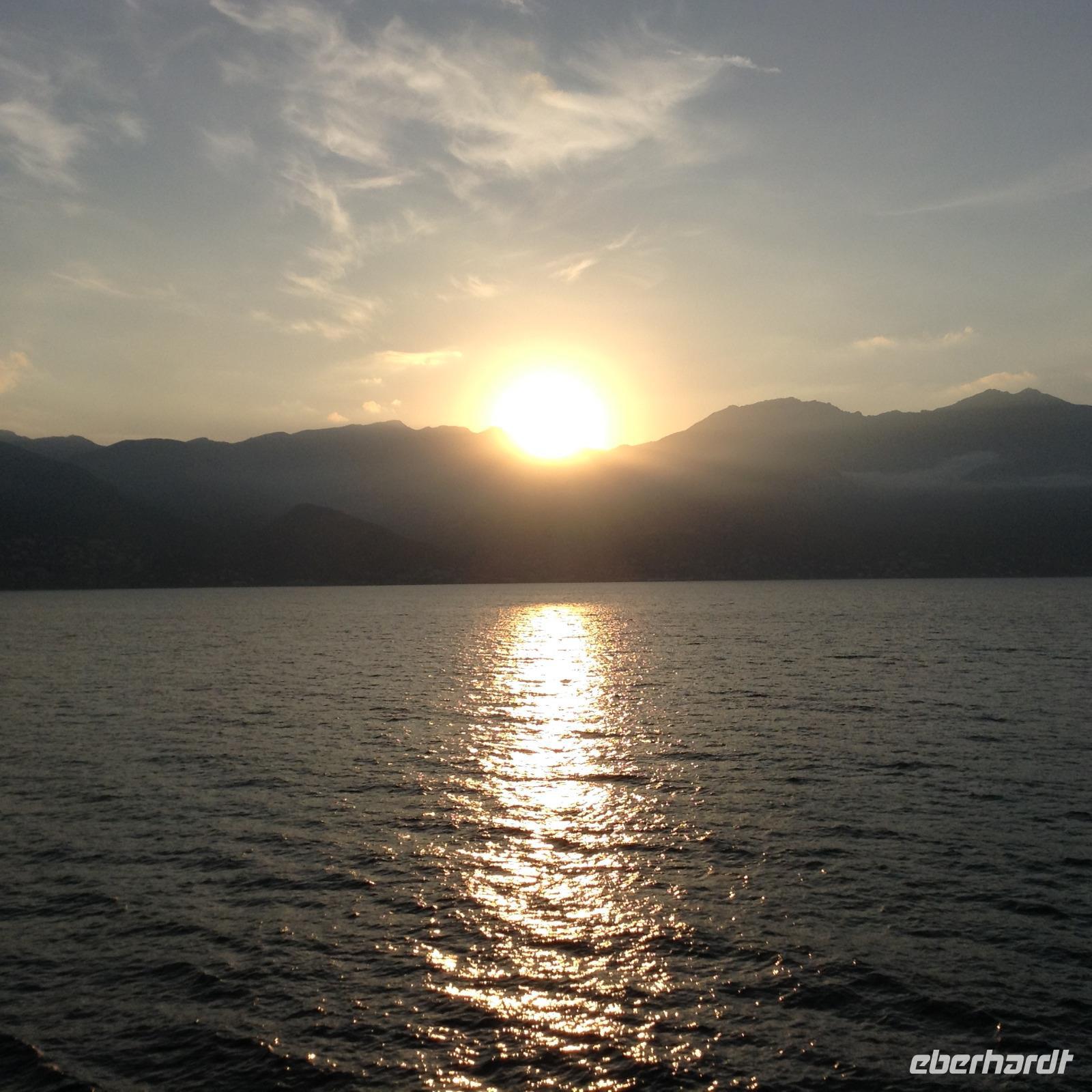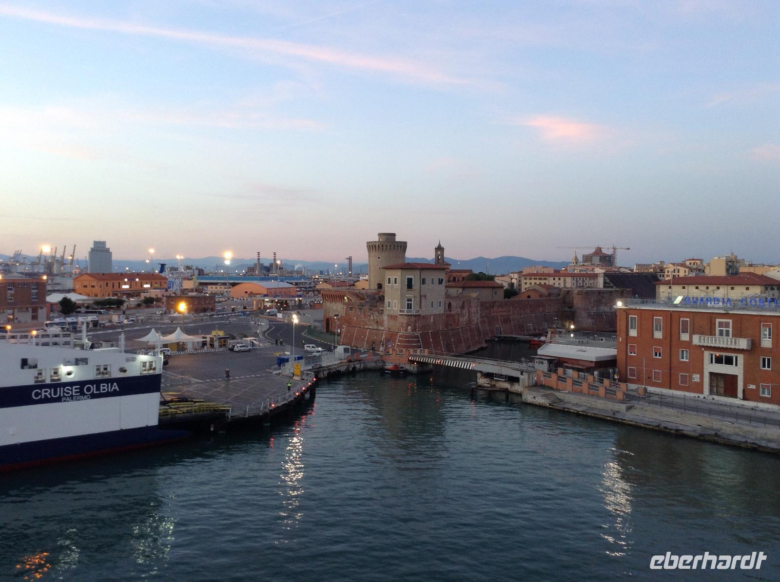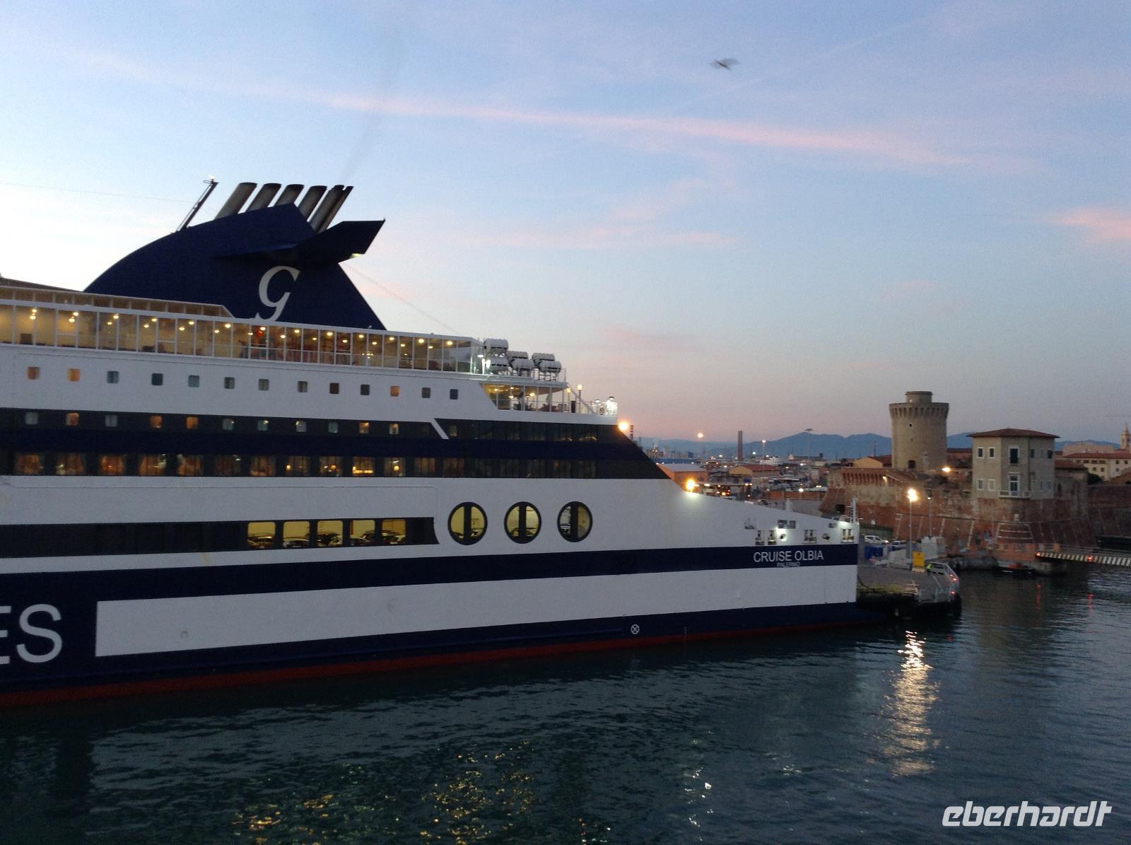 Weiter in Richtung Süden ging es durch Südtirol, wir fuhren das Eisacktal und das Inntal entlang und verließen bei Rovereto die Autobahn in Richtung nördlichem Ende des Gardasees. Einen ersten Stopp gab es in Mori, bevor wir in Torbole das Nordende des Sees erreichten. Die Gardesana am linken Seeufer entlang ging es bis nach Garda. Es war ein sonniger Tag und wir genossen immer wieder die tollen Ausblicke entlang der Uferstrasse. In Garda war unser nächster Stopp, Zeit zum Bummeln, Eisessen oder Mittagessen. Von Garda aus ging es nach dem Mittag über Parma durch die Poebene mit seinen fruchtbaren Feldern bis hin zu den Appeninen und entlang der Versiliaküste vorbei an La Spezia und den Marmorbrüchen von Carrara bis nach Livorno. In Livorno, wichtigste Hafenstadt der Toskana, ging es am Abend auf die Fähre in Richtung Sardinien. Die Fährausfahrt erfolgte mit einem tollen Sonnenuntergang.