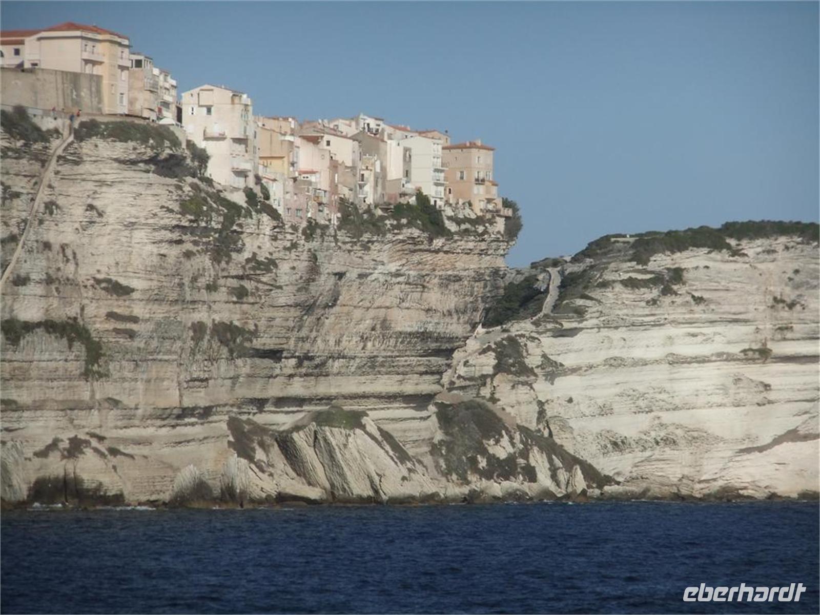 Der Fährausfall hatte natürlich auch zu einen Stau der Fahrzeuge geführt und so kamen wir später nach Korsika, als wir alle gewünscht hatten. Erstaunlicherweise hatten sich die Wogen heute geglättet und die Überfahrt verlief bei ruhiger See. Die schönste Seite von Bonifacio zeigt sich bei der Annäherung mit dem Schiff. 70 m über dem Meeresspiegel drängen sich die Häuser aneinander, geschützt von mächtigen Festungsanlagen.