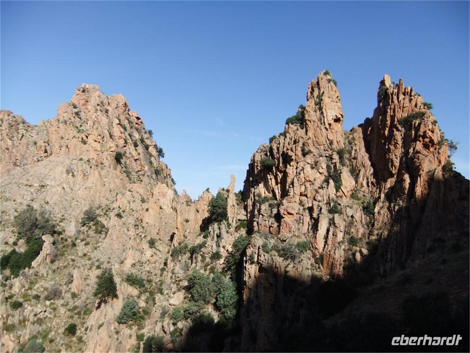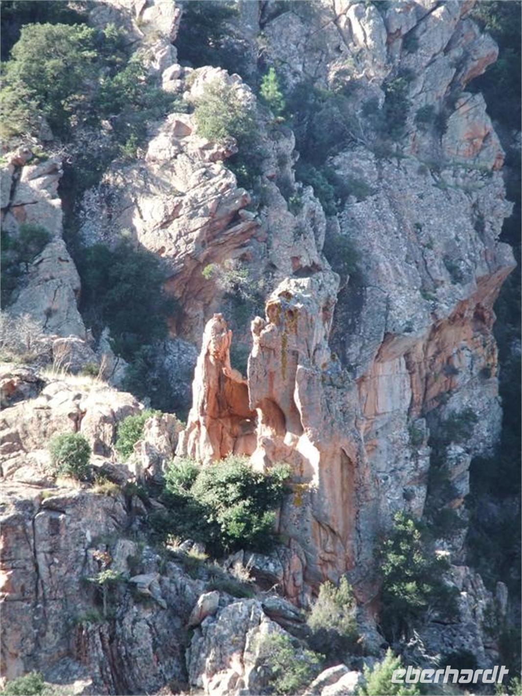 Les Calanche. „Da waren Spitzen, Säulen, Türmchen, erstaunliche Figuren, geformt von der Zeit, vom Wind und dem Nebel des Meeres. Bis zu dreihundert Meter hoch, fein und gewunden, gekrümmt, unförmig, überraschend, unwirklich. Diese verblüffenden Felsen schienen wie Bäume, Pflanzen, Tiere, Gebäude, Menschen. Mönche in Kutten, gehörnte Teufel und Riesenvögel, ein ganzes furchtbares Volk, eine durch den Willen irgendeines exaltierten Gottes versteinerte Ansammlung von Alpträumen." So beschrieb Maupassant die Calanche, jene bizarre Granitlandschaft in Rot und Grün inmitten des Blau des Meeres und des Himmels.
