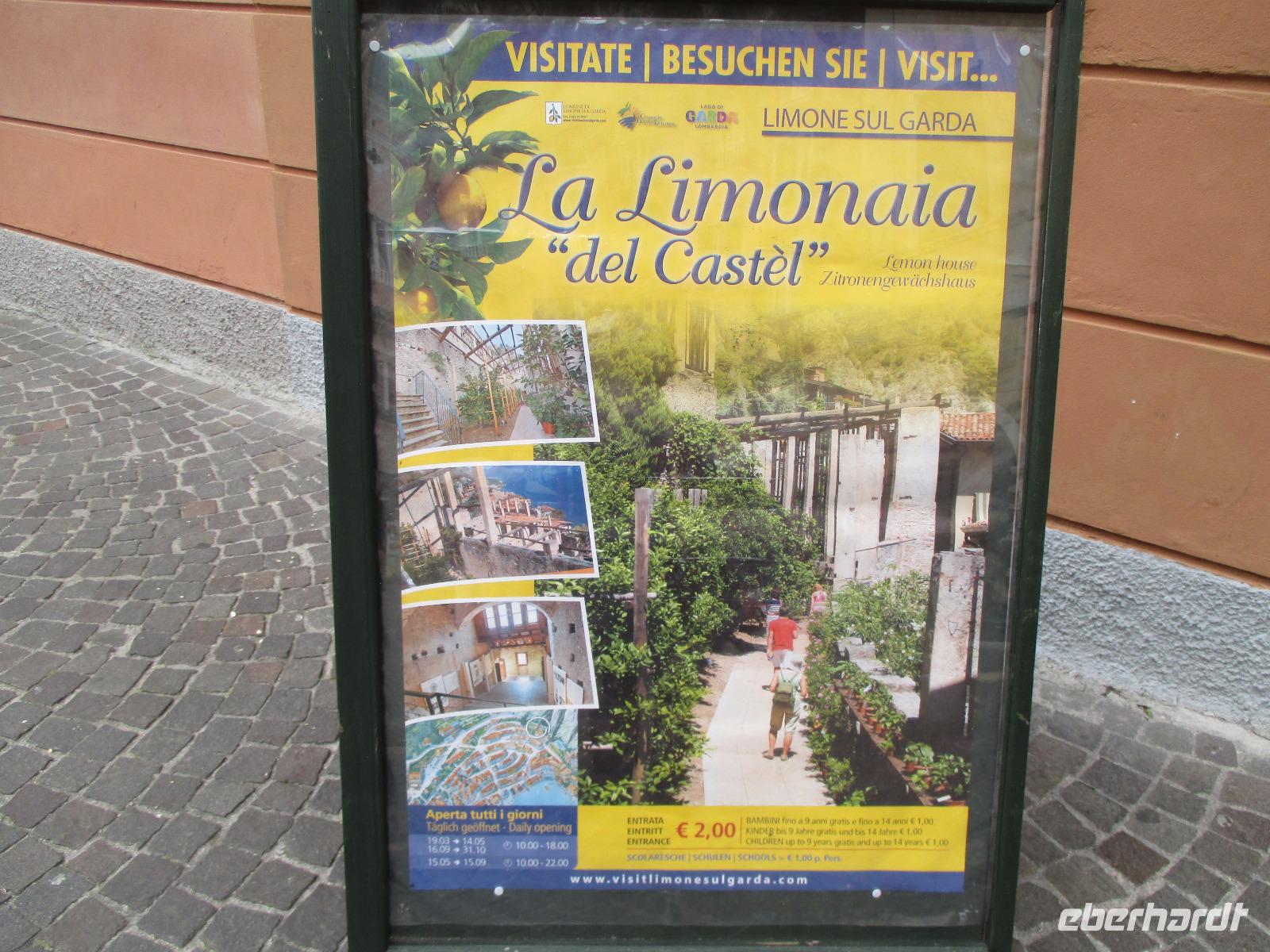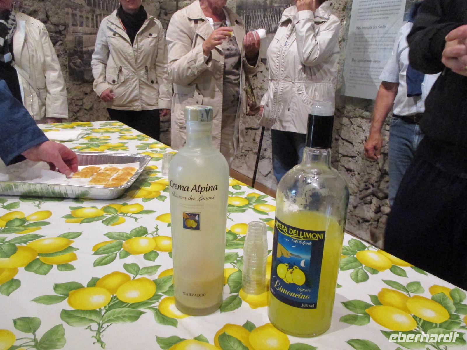 Franco erzählt uns über die Bedeutung dieser Anlagen in der Vergangenheit. Zitronen in Limone haben fast vierhundert Jahre Geschichte. Selbst Goethe war von den Anlagen beeindruckt. Um die Bäume und Früchte vor dem Frost zu schützen, wurden ab dem 17. Jahrhundert die ersten Zitronengewächshäuser gebaut. In den Wintermonaten wurden sie mit Bretterabdeckungen und Glasscheiben verkleidet. Nachdem die Anlage in Limone verfallen war, restaurierte die Gemeinde sie liebevoll. Es wurden an die 50 unterschiedlichen Zitrusgewächse angepflanzt, die wir nun bewundern und beschnuppern können. 2004 wurden die Limonaie der Öffentlichkeit zugänglich gemacht und sind nun ein Touristenmagnet. Natürlich verkosten wir auch die Produkte - Limoncellolikör, Bitterorangenmarmelade und Zitronencarpaccio. Lecker!