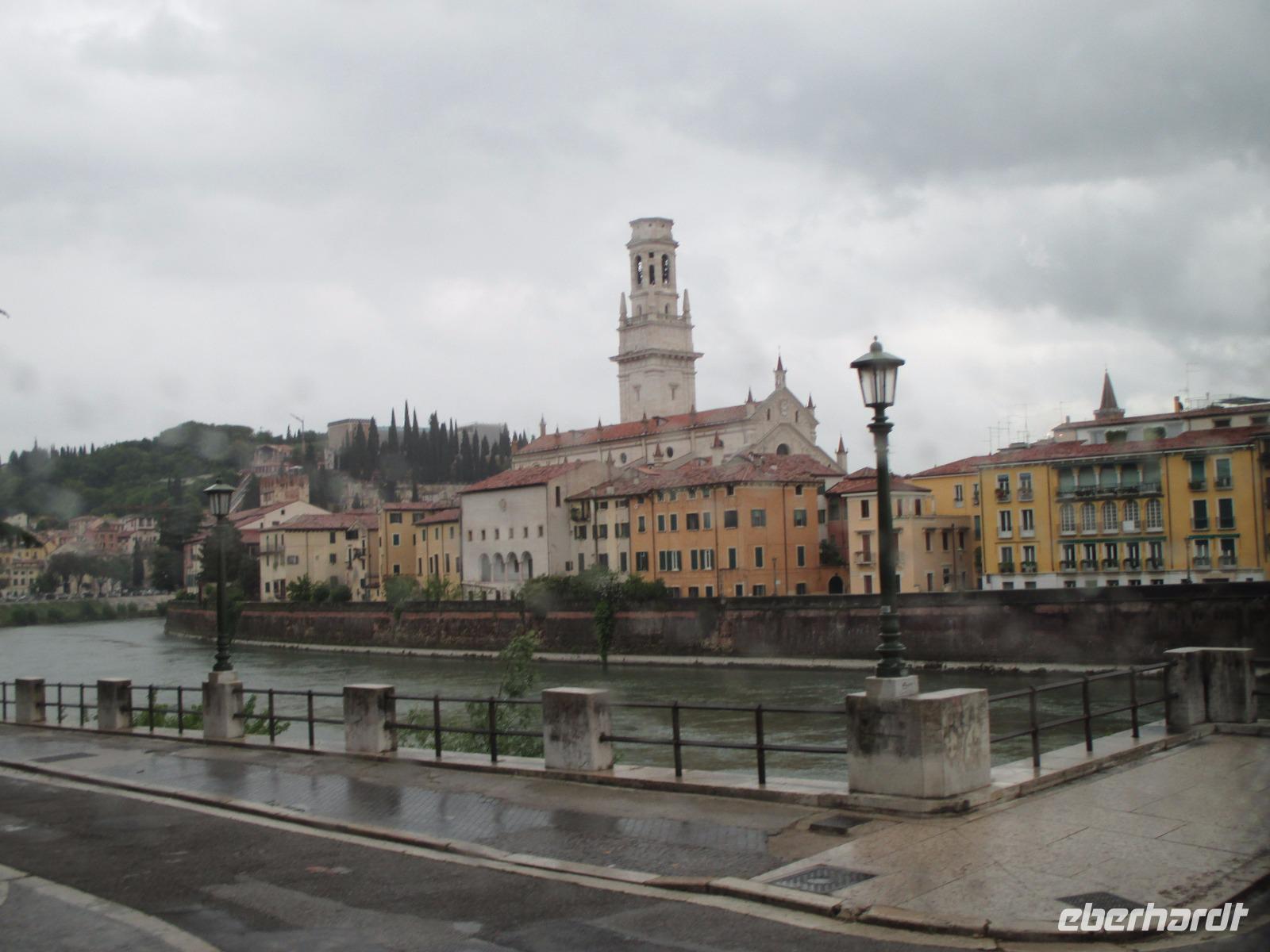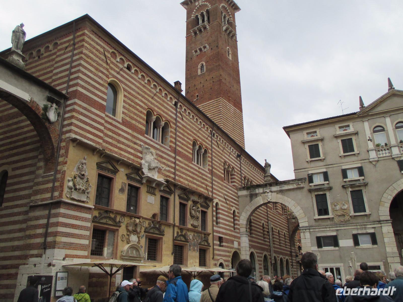 Leider hat der Regen so zugenommen, dass wir bei dem Gedränge nicht zum Haus der Julia gehen, sondern uns in einem trockenem Durchgang die Ausführungen Saras anhören. Sie geleitet uns noch zur Piazza Bra mit der berühmten Arena. Die hat die Stadt in der ganzen Welt bekannt gemacht, denn hier treffen sich in den Sommermonaten Opernfreunde von allen Kontinenten. Aber bei dem Wetter, das sich auch nicht bessert, wagen nur wenige eine Besichtigung der Arena oder begeben sich zurück, um den Balkon der Julia zu sehen. Schade! Vielleicht ein Grund nochmals wiederzukommen, um die Stadt mit ihren vielen berühmten Kunstdenkmälern in Ruhe zu entdecken.
