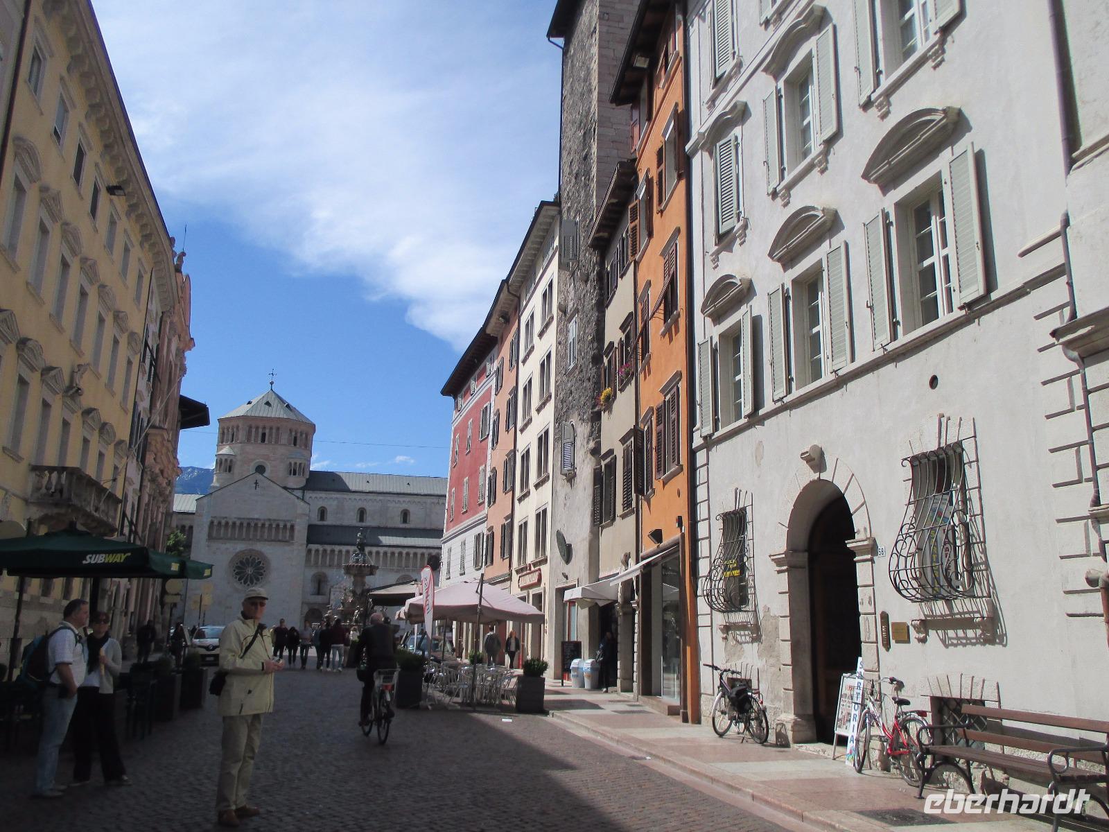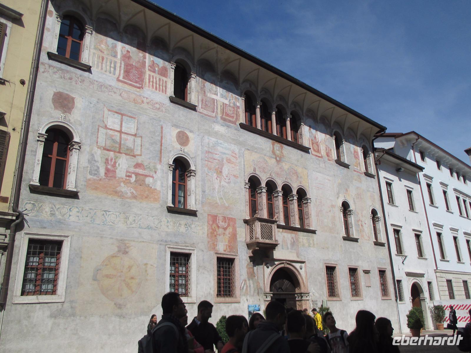 Mit unserem Bus fahren wir auf der Autobahn nach Trient, der Hauptstadt des Trentino, und treffen uns mit unserer Stadtführerin Maria. Langsam bummeln wir ins Zentrum der Stadt, zum Domplatz. Die vielen Fresken auf den Palazzi berichten über die Geschichte der Stadt, über die Reise der deutschen Kaiser nach Rom, über das Konzil 1545. Sie zeigen aber auch mythologische Figuren. Maria erklärt sie uns ausgiebig. Im Dom von Trient, der Kathedrale San Vigilio, berichtet Maria natürlich über die Architektur und die Sitzungen des Konzils.