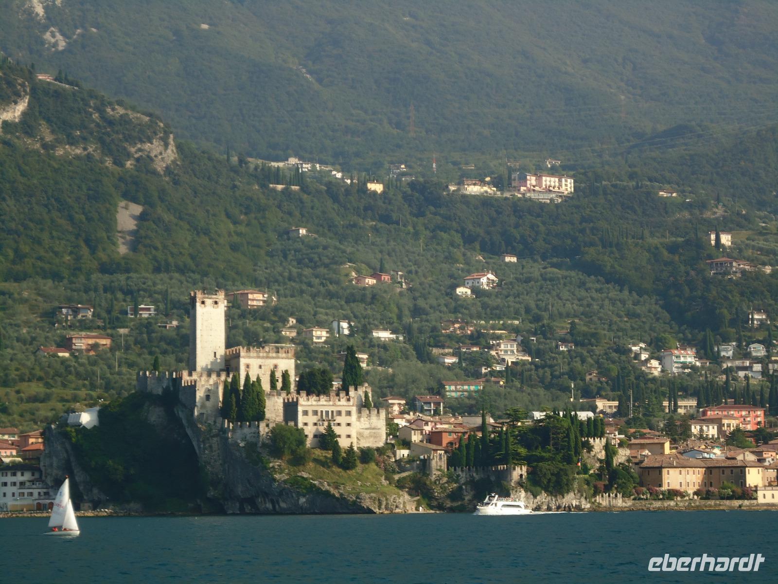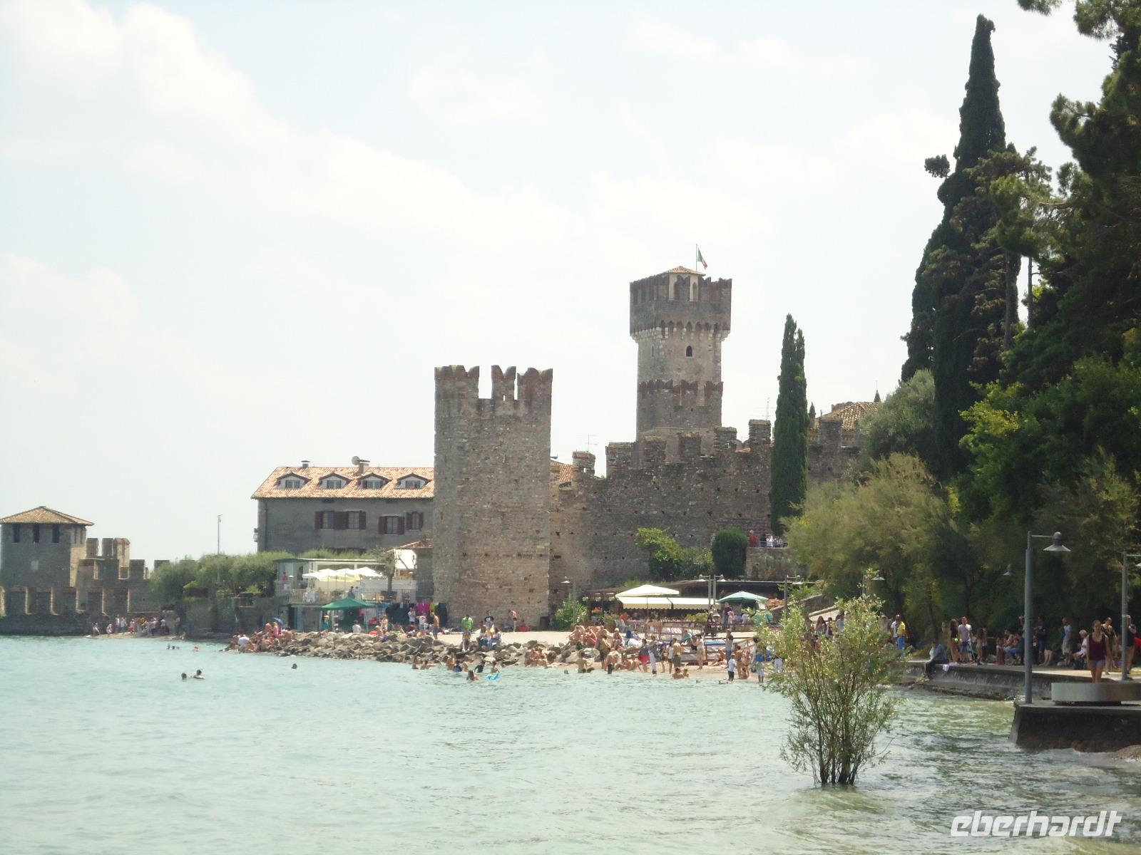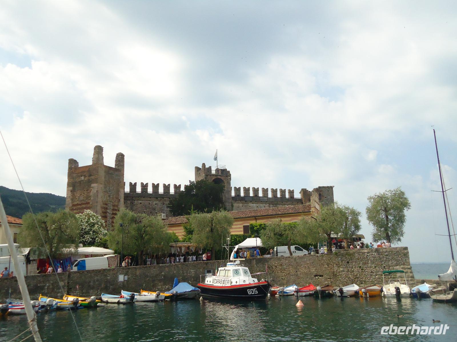 Heute wollen wir die östliche Seite des Sees abfahren und im Süden der ca 4 km langen Halbinsel Sirmione einen Besuch abstatten. Zunächst fahren wir durch Torbole, wo sich die ersten Surfer für einen „Wasserausflug" vorbereiten, weiter entlang der „Olivenriviera"(so wird die östl. Seite auch genannt), vorbei an Malcesine. Die Skaligerburg, das Wahrzeichen des Ortes, fällt uns gleich ins Auge. Das ist also die Burg, in der man einst unseren Herrn Goethe als angeblichen Spion festegehalten hat.