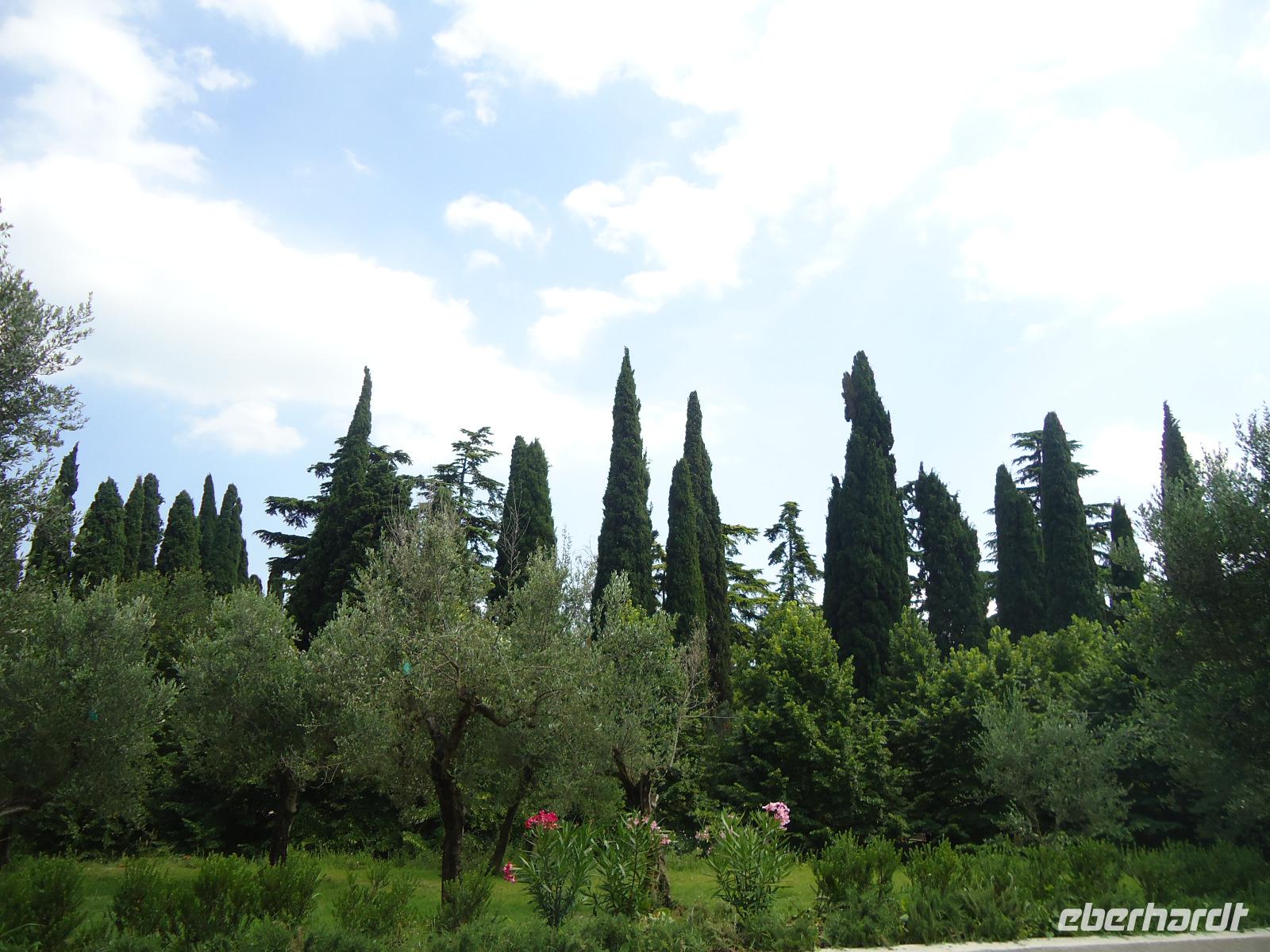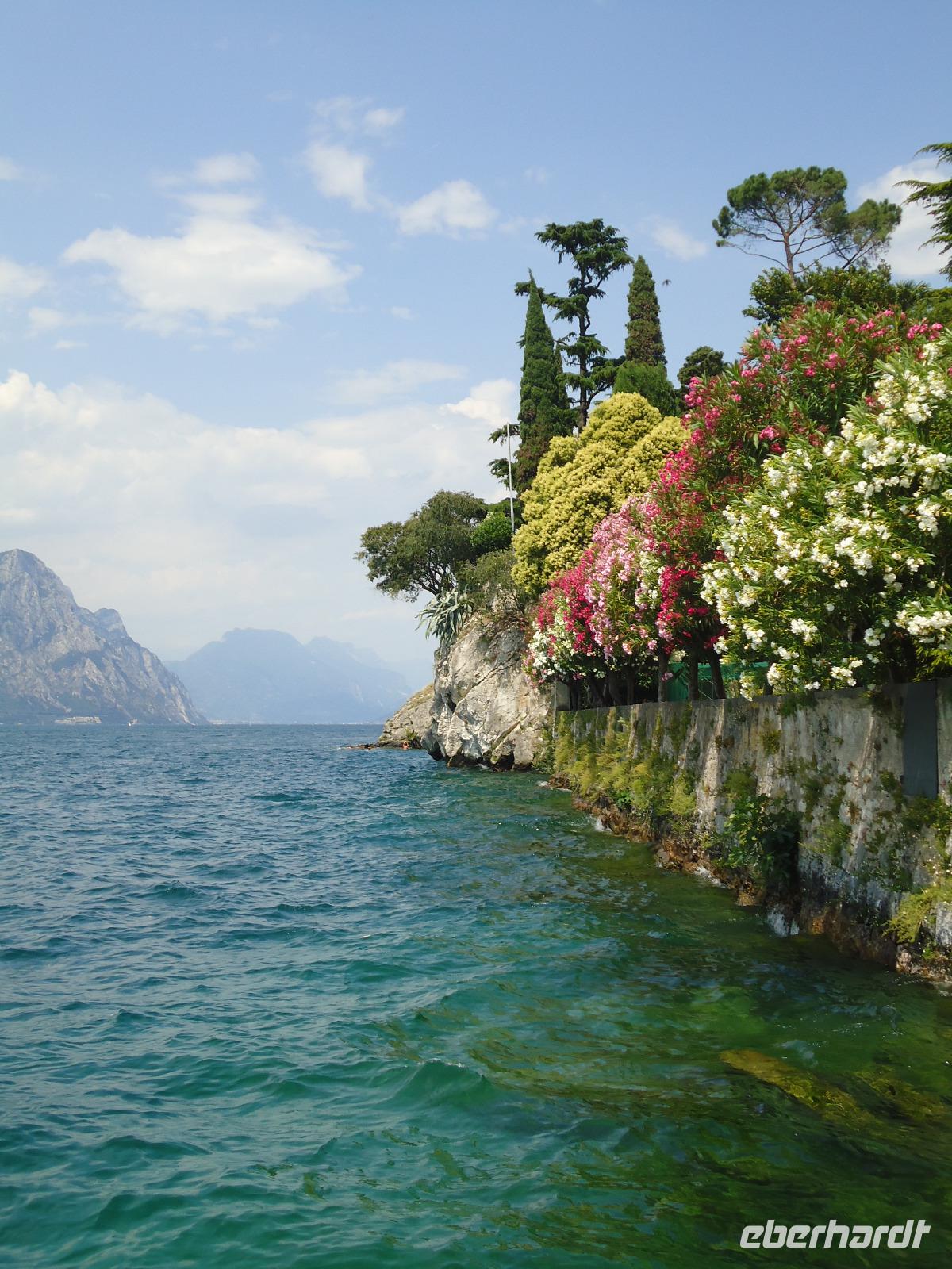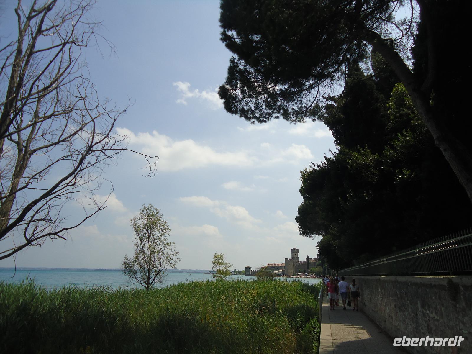 Heute wollen wir die östliche Seite des Sees abfahren und im Süden der ca 4 km langen Halbinsel Sirmione einen Besuch abstatten. Zunächst fahren wir durch Torbole, wo sich die ersten Surfer für einen „Wasserausflug" vorbereiten, weiter entlang der „Olivenriviera"(so wird die östl. Seite auch genannt), vorbei an Malcesine. Die Skaligerburg, das Wahrzeichen des Ortes, fällt uns gleich ins Auge. Das ist also die Burg, in der man einst unseren Herrn Goethe als angeblichen Spion festegehalten hat.