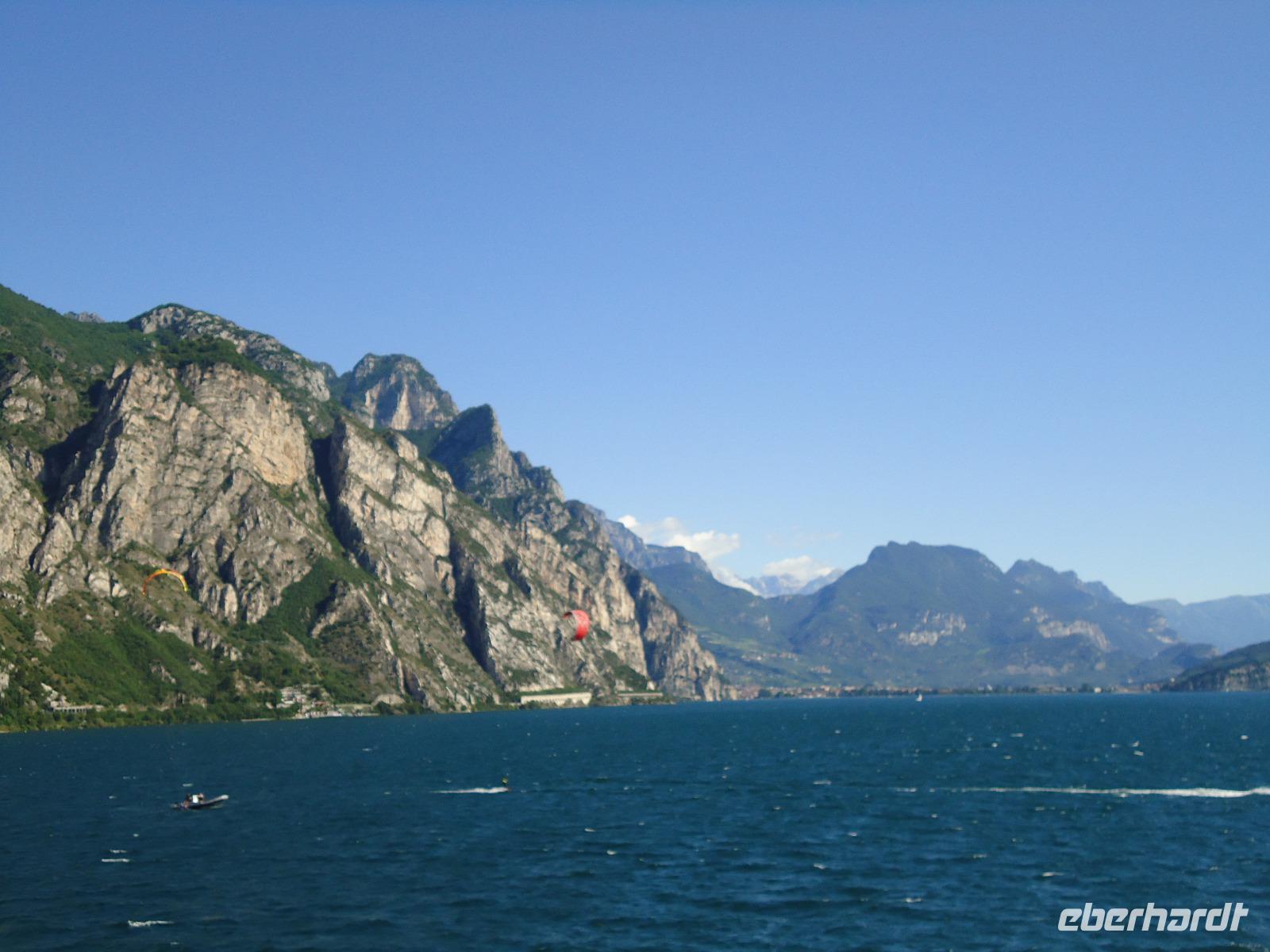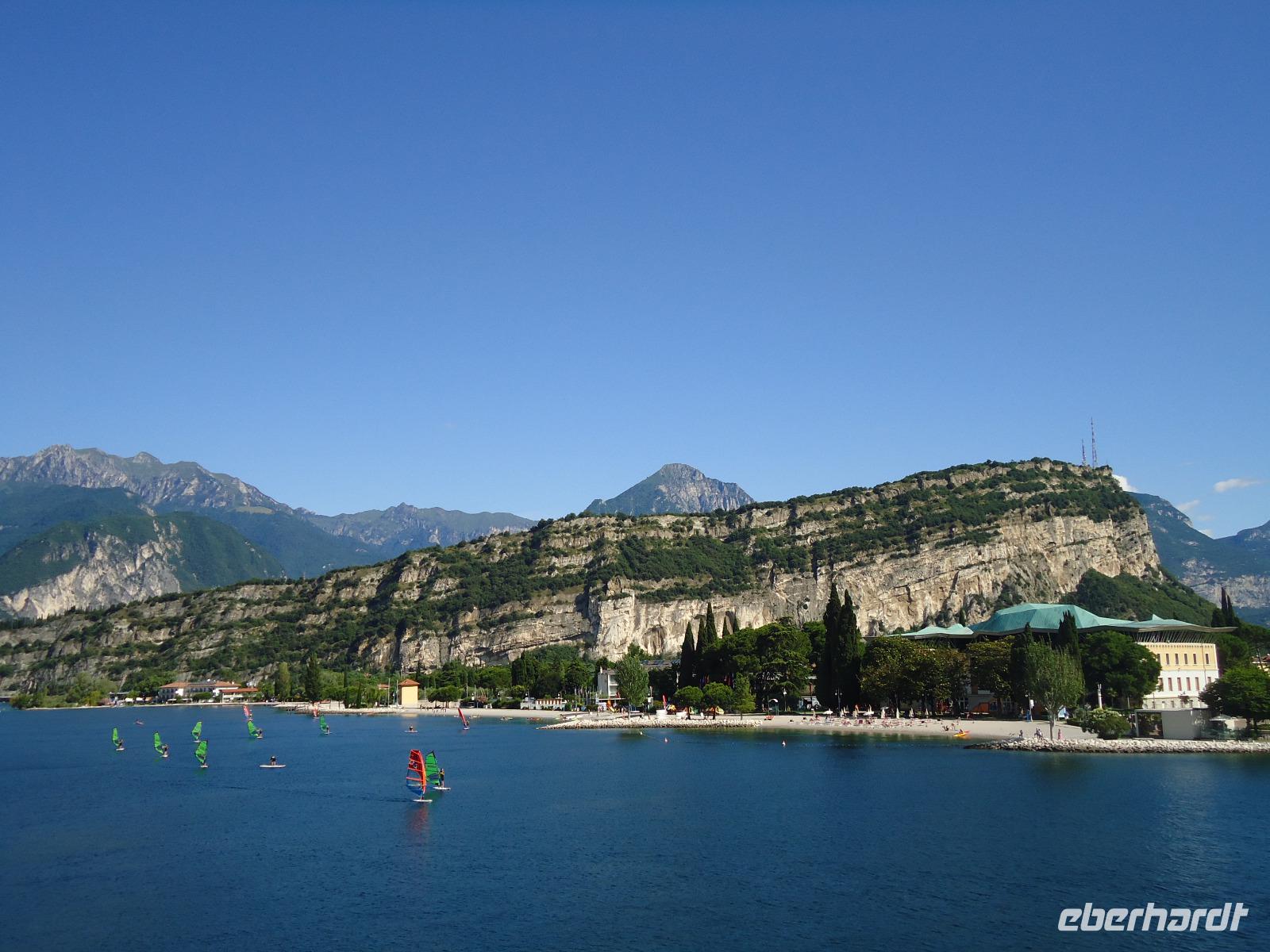 Am frühen Nachmittag treten wir wieder unsere Rücktour an. Wir gleiten wieder über das Wasser und erfreuen uns an den vielen Farbtupfern (Surfern) auf dem See. Die Bucht von Torbole ist ein ganz beliebtes Surfrevier, hier spielen Wind (Vento, Sarca oder Ora) und Wellen miteinander - und das sehr zuverlässig und unentwegt. Weil hier die eng zusammenstehenden Felsen den Effekt verstärken, heißt diese Region auch „Düse".