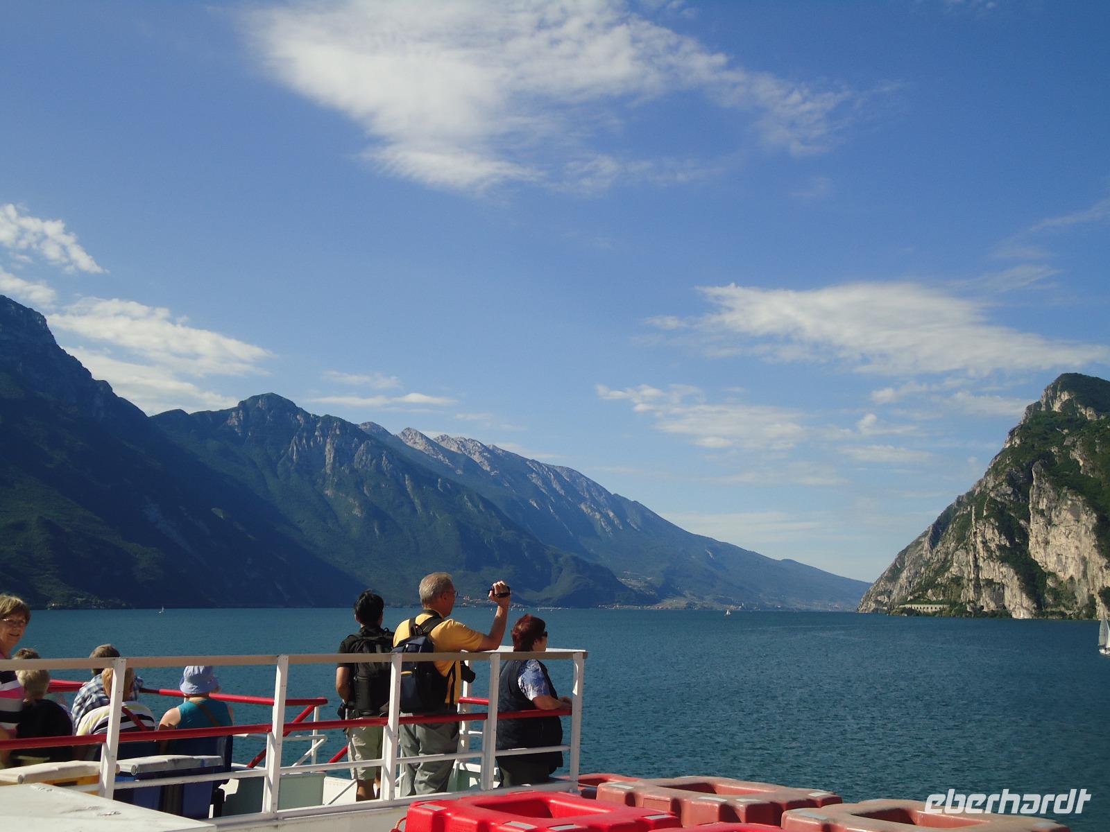 Am Nachmittag nehmen wir das Schiff in Richtung Garda. Wir genießen nicht nur das kühle Lüftchen sondern auch den wunderschönen Blick auf die Halbinsel und die vielen Wasserliebhaber, die sich vorallem auf ihren Booten im Wasser tummeln. Vorbei an den Grotten des Catulls, die wie wir wissen nichts mit dem Dichter zu tun haben, sondern möglicherweise einmal ein römischer Kaiserpalast waren (bis heute nicht erforscht) erreichen wir Garda, den Ort, der dem See später seinen Namen gab. In Garda angekommen, haben wir nur noch einen Wunsch - wir wollen in unseren klimatisierten Bus und uns nach Riva chauffieren lassen. Wir spazieren noch entlang der hübschen Seepromenade und treten kurze Zeit später die Rückfahrt an.
