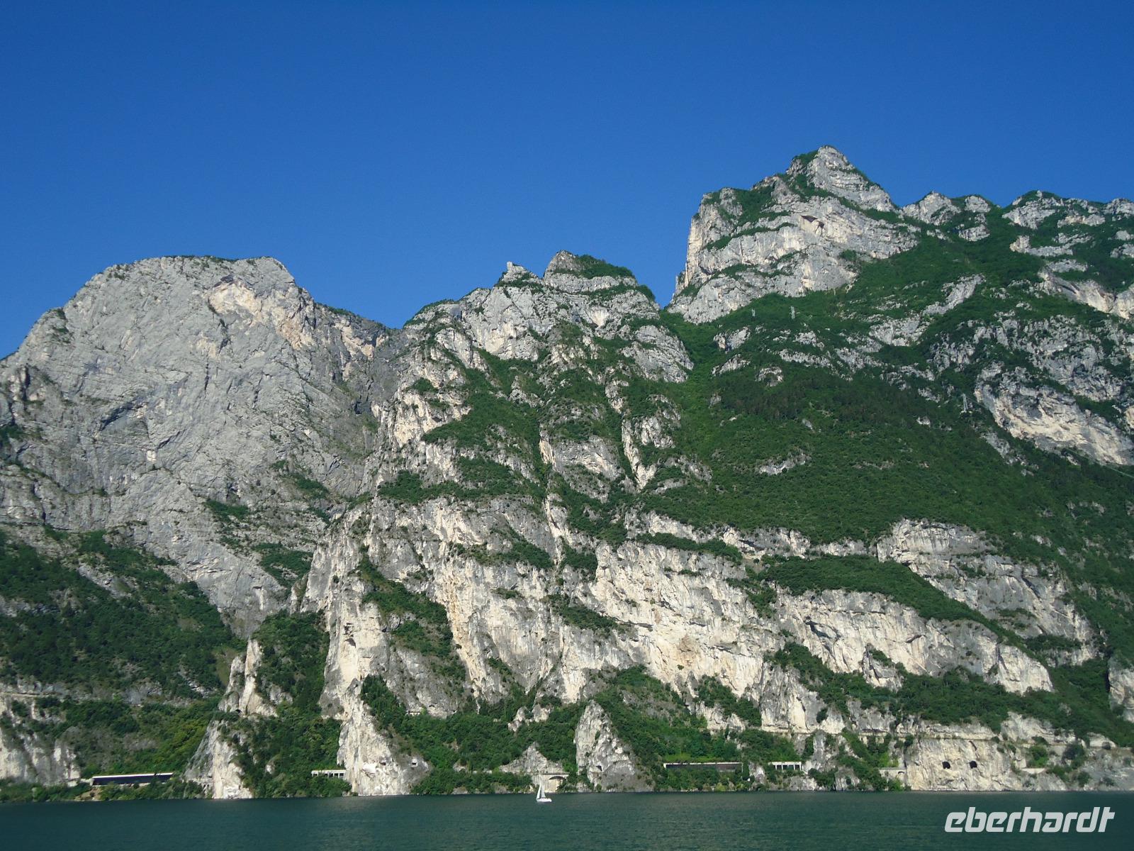 Die Fahrt auf dem „Benaco" (so wird der See bei den Einheimischen genannt) ist einfach nur schööööön. Wir sehen Riva vom Wasser aus, am Fuße der Rocchetta in einer Bucht liegend und von Torbole nur durch den Hausberg von Riva, dem Monte Brione, getrennt. Wir genießen den Blick auf die, den See umgebenden Berge, auf das glasklare blau-grüne Wasser, wo sich bereits wieder einige Surfer tummeln und auf die Ortschaften, die insbesondere am Westufer wie Vogelnester an den Bergen „kleben". Eine dieser Ortschaften, Limone, steuern wir an...und wir werden auch bereits erwartet.