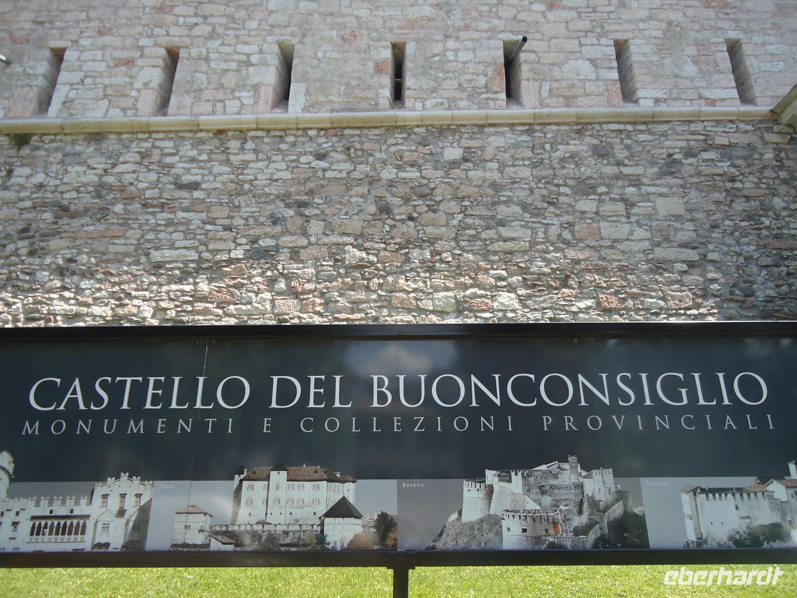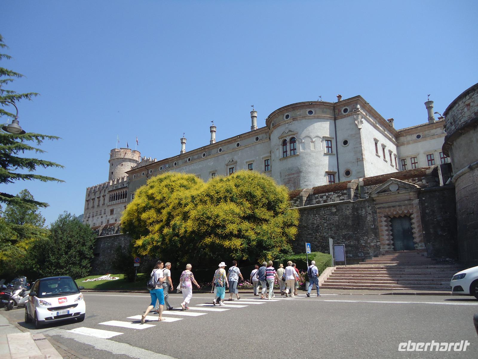 Marocche, genannt. Nur ein paar Kilometer weiter zeigt sich uns mit dem malerisch gelegenen Lago di Cavedine, ein ganz anderes Landschaftsbild. Wir sind begeistert, begeistert auch von Uwes Fahrkünsten, denn die sind hier tatsächlich gefragt. Bravourös meistert er die noch so engen Wege und Kurven und chauffiert uns schließlich noch am wunderschön gelegenen Lago di Toblino inklusive Castel Toblino, einst Sommersitz der Trienter Fürstbischöfe, jetzt in Besitz der Familie Wolkenstein, vorbei. Nach dieser wunderschönen Fahrt erreichen wir Trient, wo wir von unserer Stadtführerin Maria bereits erwartet werden.