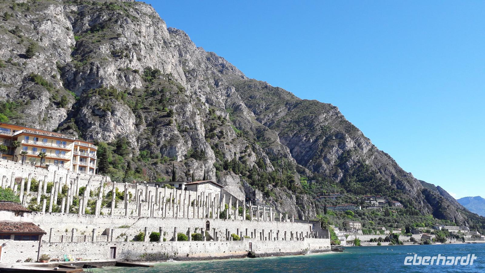 Die Sonne kitzelt uns aus dem Bett und nach einem ausgiebigen Frühstück machen wir uns auf den Weg Richtung Hafen. Auf dem Programm steht heute, an unserem zweiten Tag, ein fakultativer Ausflug nach Limone, einem, wegen seiner landschaftlichen Schönheit beliebtesten Orte am See. Zunächst aber genießen wir die morgendliche Stille in Riva und schlendern vorbei an der Rocca, dem Torre Apponale (Wahrzeichen der Stadt) bis hin zum Hafen. Pünktlich heißt es „Leine los" und schon gleiten wir über das Wasser. Obgleich die Sonne scheint, weht uns auf dem Oberdeck doch ein ziemlich kühles Lüftchen um die Nase. Dafür werden wir mit phantastischen Anblicken auf die Bucht von Riva, auf den Monte Brione - den Hausberg von Riva -, auf Torbole und das Hinterland belohnt.