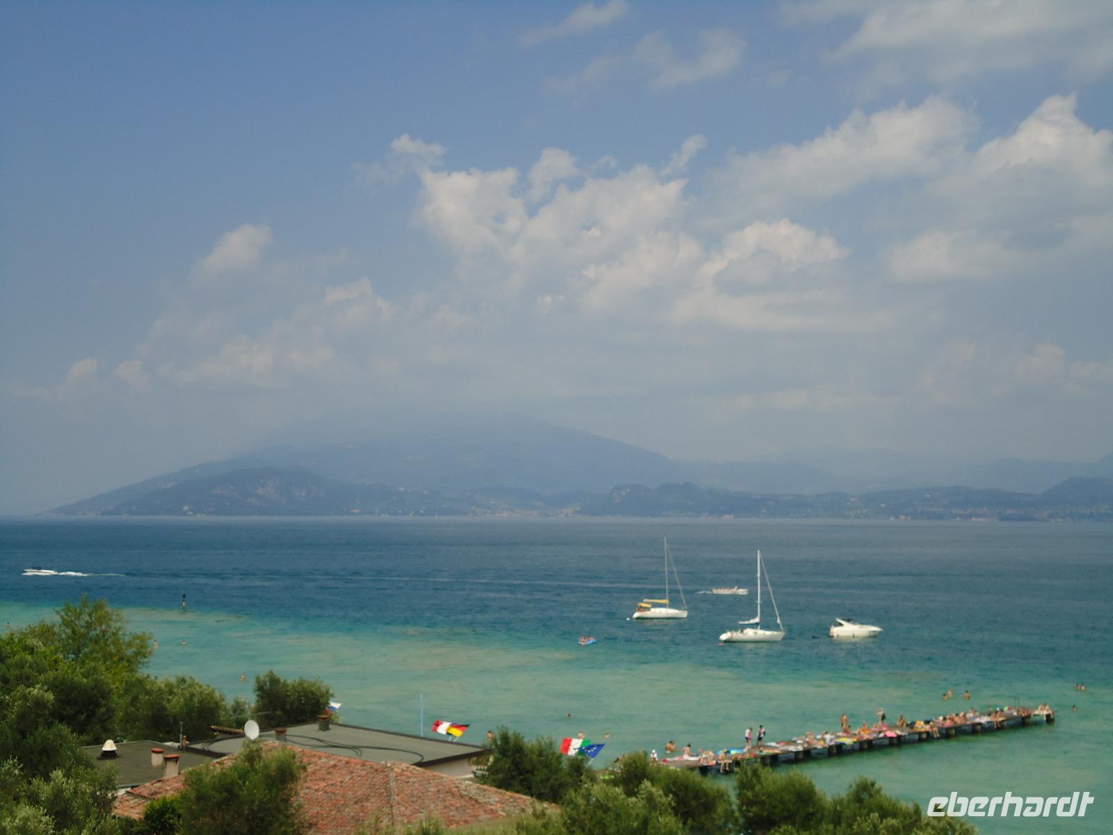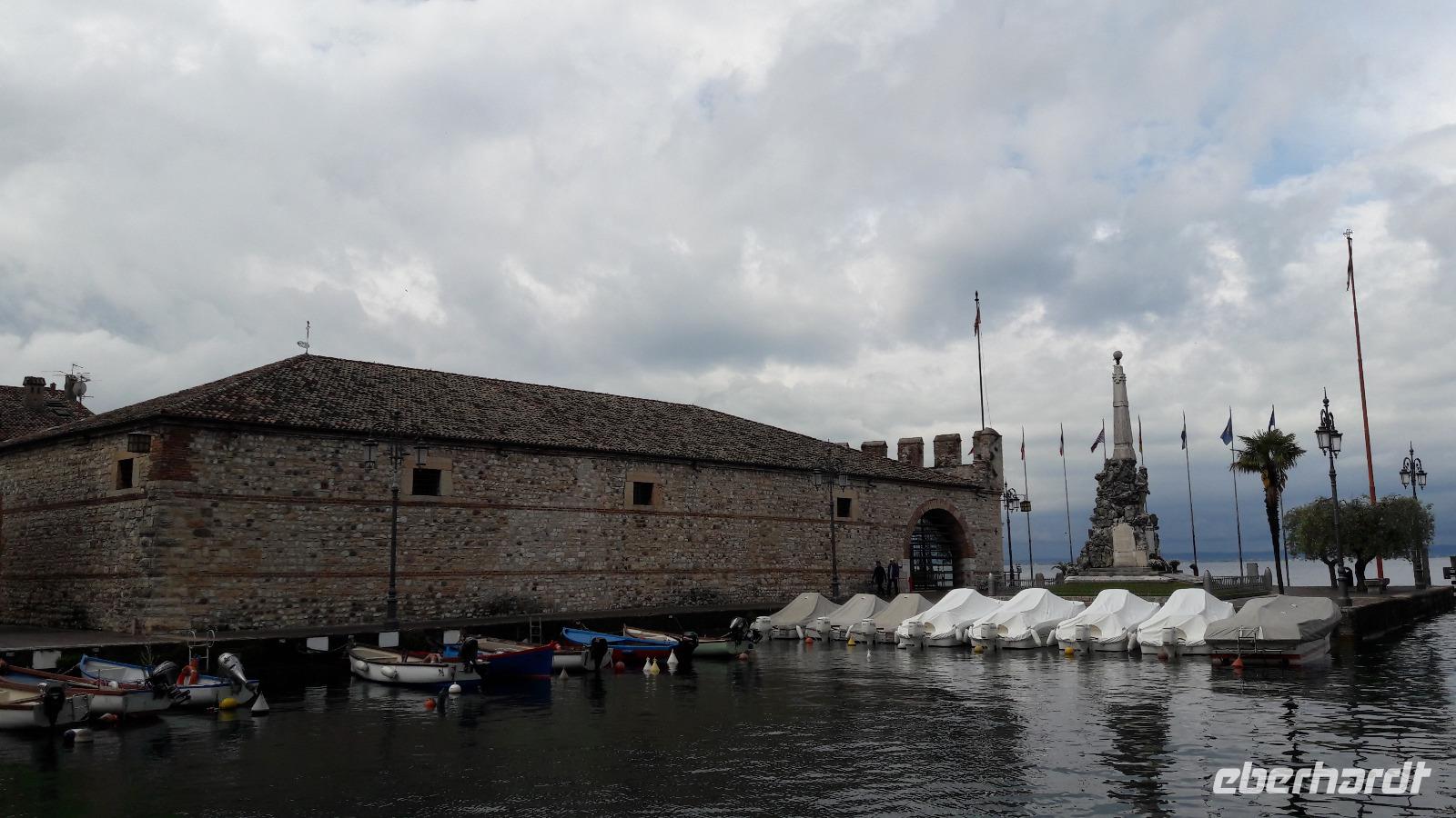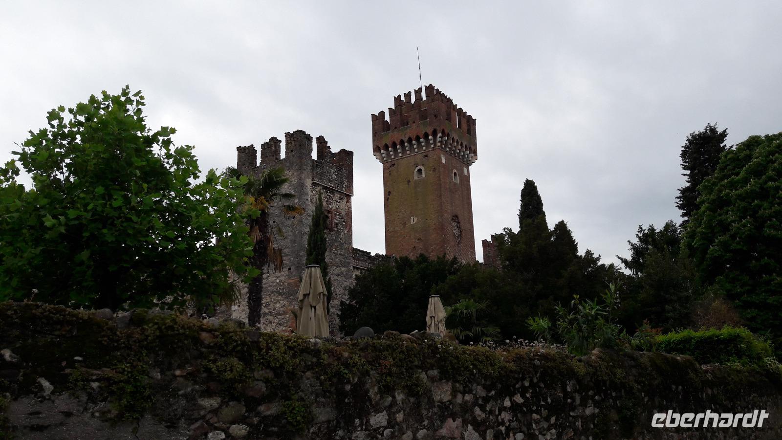 Als „Begrüßung" vom Himmel schüttet es eimerweise Freudentränen. Diese unerwartete, „übertriebene Zuwendung" von Petrus ist einfach zu viel für uns und so verzichten wir auf einen Ausstieg und fahren weiter Richtung Süden. Als nach kurzer Zeit der Vorhang wieder aufgezogen wird und die Sonne ihre ersten Strahlen schickt, beschließen wir ein Halt in dem beschaulichen, hübschen kleinen Ort Lazise einzulegen. So ganz beschaulich ist er allerdings an diesem Morgen dank der vielen Markthändler doch nicht. Wir spazieren durch die Gassen und Gässchen und bestaunen die Skaligerburg inklusive erhaltener Stadtmauer. Nach diesem einstündigen Schnupperrundgang besteigen wir wieder den Bus - und dieses Mal mit etwas Sonne im Gepäck. Wir fahren durch Peschiera , überqueren den Mincio und erreichen endlich die vom römischen Dichter Catull so viel geliebte und besungene Halbinsel Sirmione.
