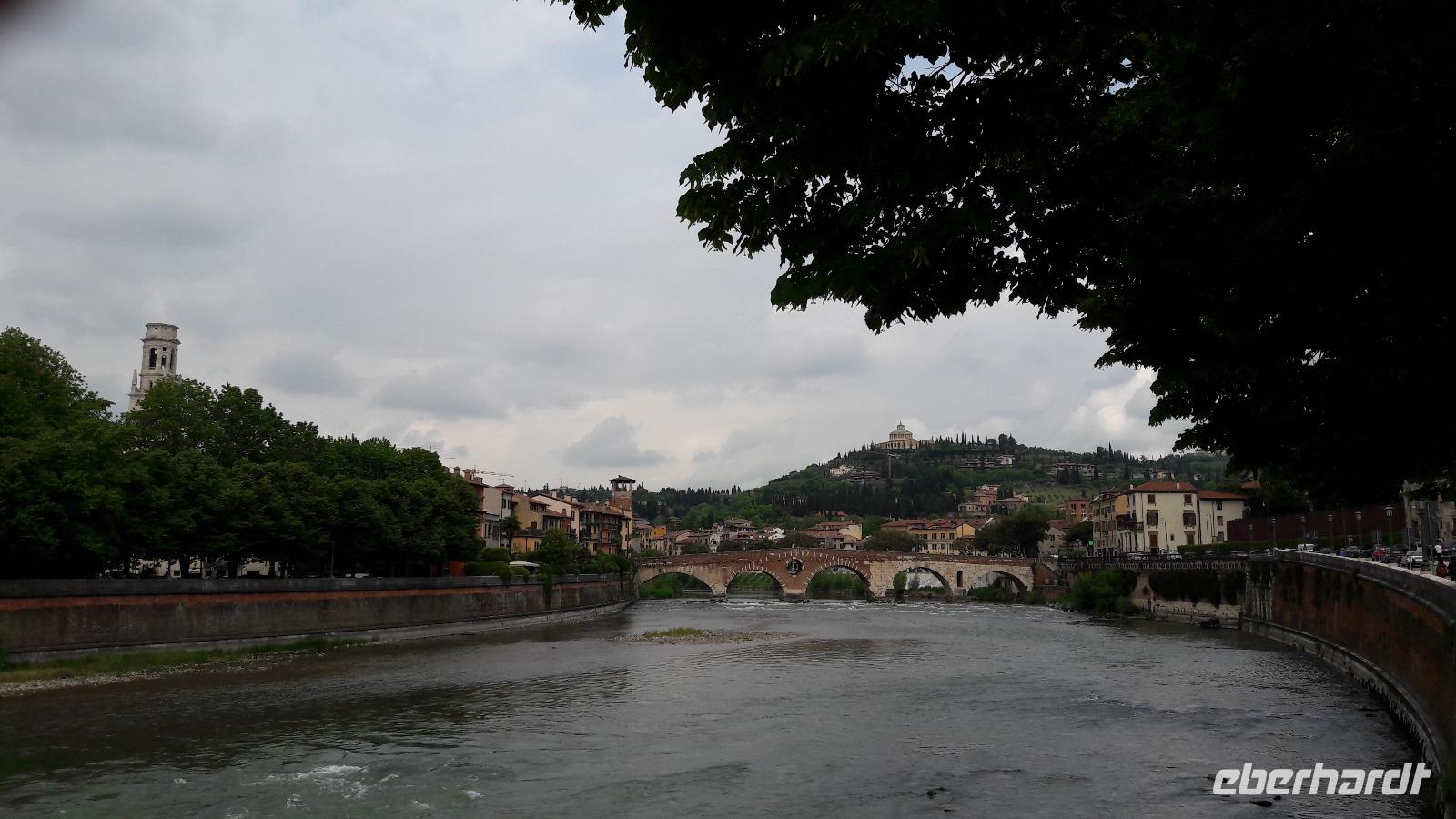 Mit unserer Stadtführerin Erika „steigen wir Verona erst einmal aufs Dach" und holen uns von der Madonna di Lourdes den Segen für einen erlebnisreichen Tag in dieser geschichtsträchtigen Stadt. Aber auch der Blick von oben auf die, in einer Schleife der Etsch/Adige liegenden, Stadt ist einfach nur schön.