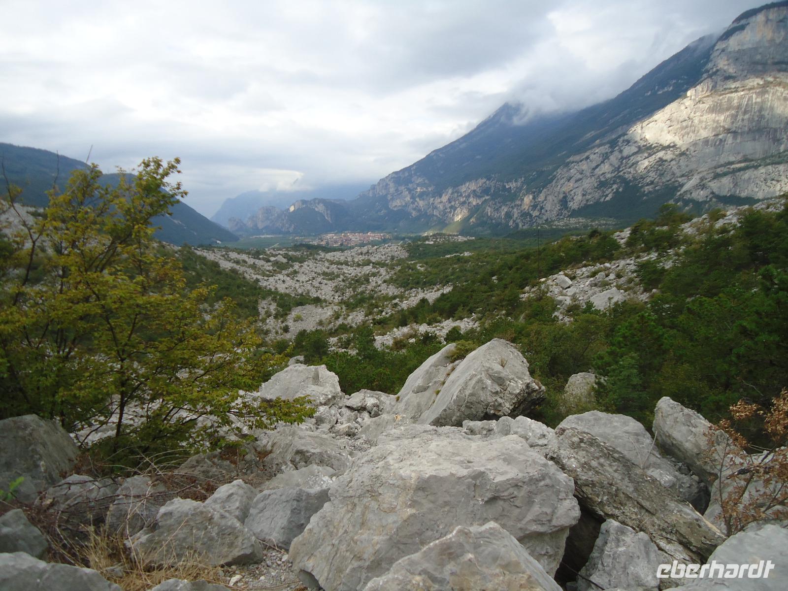 Vor der Ortschaft Dro biegen wir rechts ab und entdecken hoch über uns eine weitere Burg, die Burg Drena, einst nördliche Grenz-u. Talkontrolle der Ebene von Arco. Aber die Burg it heute nicht unser Ziel, vielmehr interessiert uns die eigenwillige Landschaft, die uns ganz plötzlich links und rechts der Straße umgibt. Kleine, große und riesengroßen Gesteinsbrocken säumen den Weg. Es sieht geradezu so aus, als hätten hier die Riesen Ball gespielt und vergessen aufzuräumen...