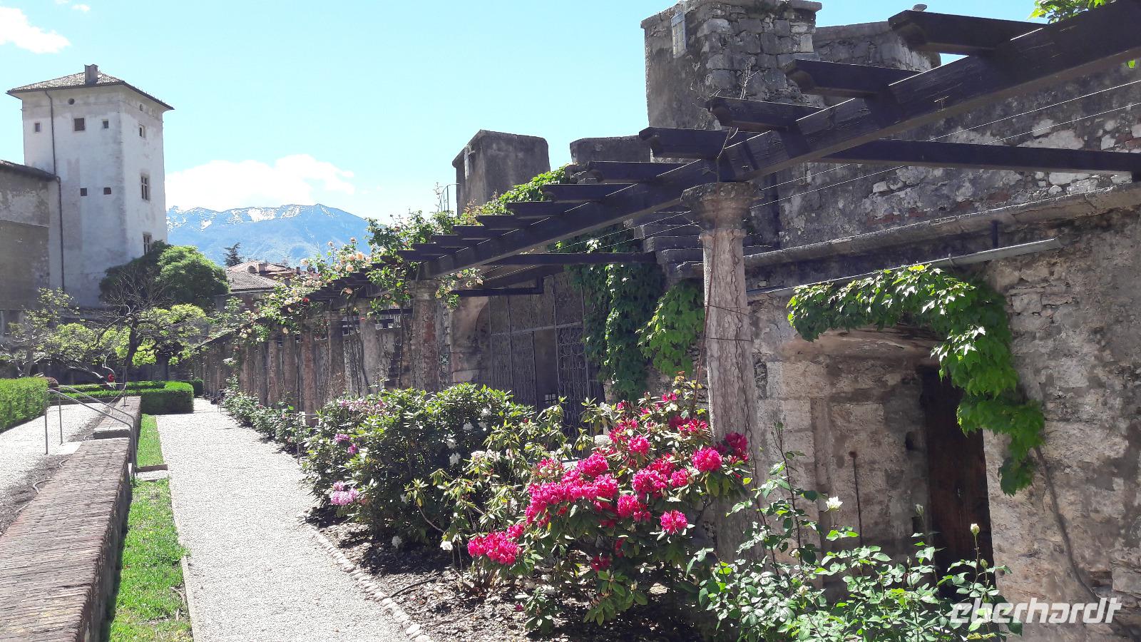 Und so fahren wir auch nicht über die Autobahn, sondern überraschen Sie mit einer Fahrt durch das Sarcatal. In Arco, am Eingang des Tales, werden wir von einer hoch über dem Ort thronenden Burgruine begrüßt. Einst von dem Geschlecht der Arco als Festung ausgebaut, wurde sie während des Spanischen Erbfolgekrieges von den Franzosen erobert und geschleift. 1982 wurde sie von der Gemeinde erworben, restauriert und der Öffentlichkeit wieder zugänglich gemacht. Heute ist insbesondere der Burgberg - die Felswände fallen nahezu senkrecht ab - eine Herausforderung für Kletterliebhaber (Freeclimber).