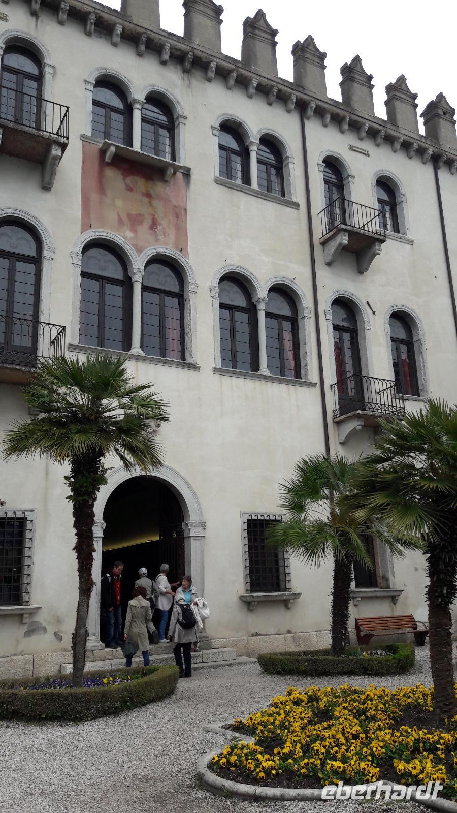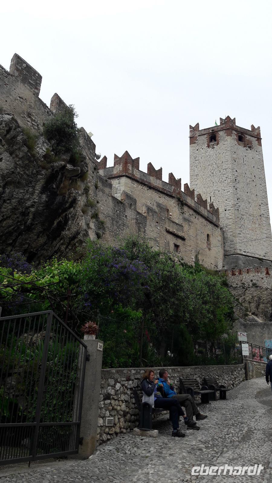 Mit den „Wetteroptimisten" fahren wir zunächst entlang der Gardesana orientale, verlassen dabei die autonome Provinz Trentino und fahren in der Region Venetien ein. Wie Sie bereits von mir gehört haben, teilen sich die beiden Regionen Venetien und Lombardei sowie die autonome Provinz Trentino den Gardasee. Unser Ziel ist heute Malcesine, einer der hübschesten Orte am Ostufer. Schon von weitem grüßt die einstige Skaligerburg, eine von vielen hier am See. Gebaut wurden sie von der Familia della Scala (Herrschergeschlecht aus Verona) und diente, wie die anderen Burgen am See auch, als Schutz und zur Verteidigung vor den Viscontis aus Mailand, mit denen die Familie della Scala ständig im „Klinsch" lag. Von der Burg in Malcesine war unser Geheimrat so fasziniert, dass er sie auf seiner Italienreise (er reiste inkognito) unbedingt zeichnen musste. Doch das wäre ihm bald zum Verhängnis geworden und er hätte als Spion in der Burg „schmoren" müssen. Er hatte jedoch noch einmal Glück und konnte seine Reise fortsetzen. Heute erinnert eine Büste in einem der Innenhöfe an seinen Aufenthalt.