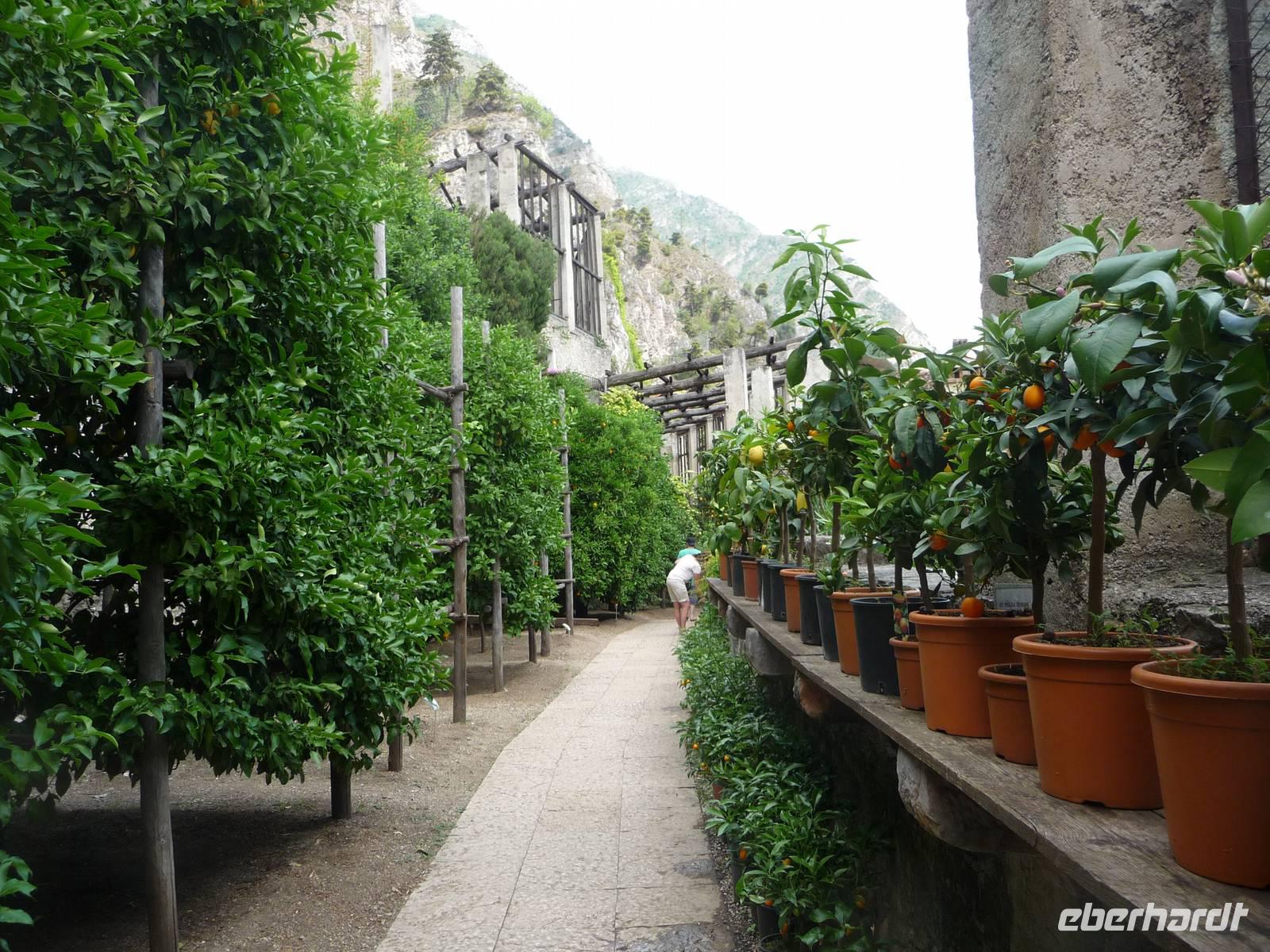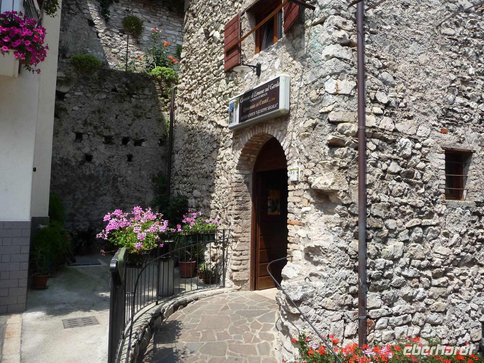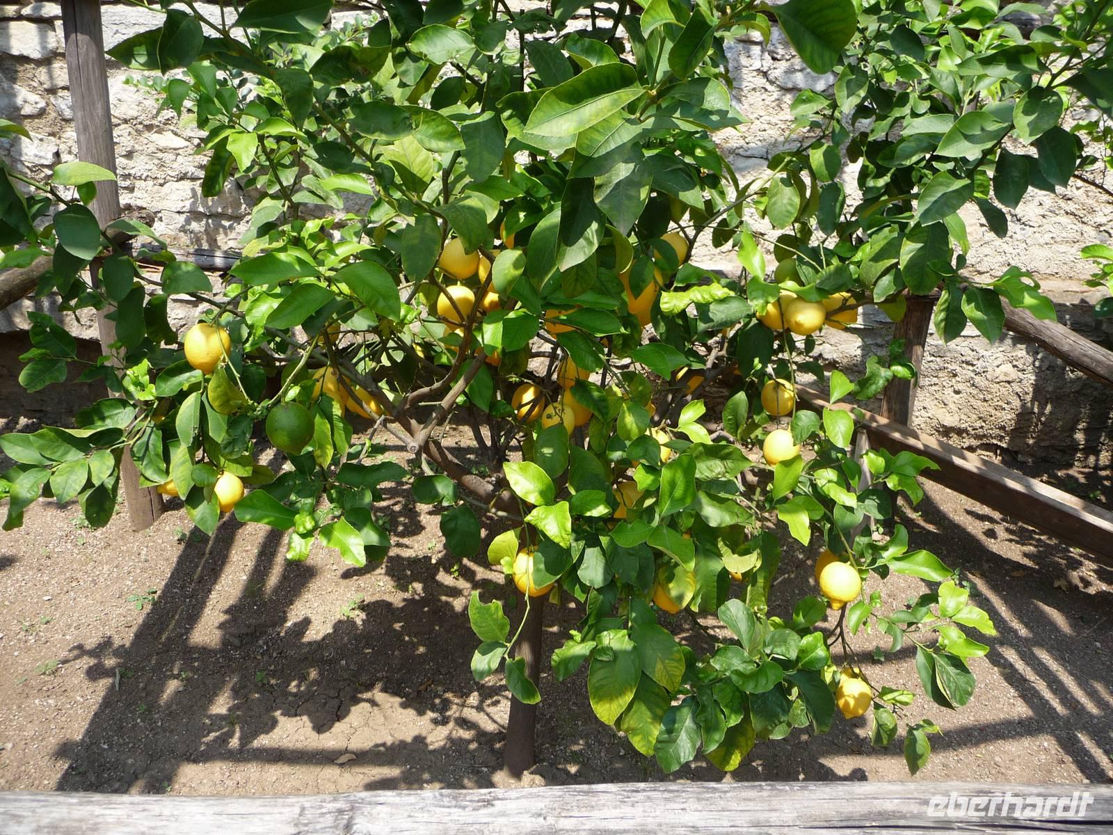 strahlt. Wir werden von Alessandra erwartet, einer netten jungen Dame, die uns durch die Limonaia del Castel, ein Zitronengewächshaus, führen wird. Hier erfahren wir, dass bereits im 17. Jh. in diesen für Limone so typischen Gärten mit Steinsäulen zwischen dem alten Gemäuer Zitronen angebaut wurden. Goethe schrieb bei einer seiner italienischen Reisen nieder, "dass die in Terrassen angelegten Gärten voller Zitonenbäume einen wahrhaft reichen und üppigen Eindruck hinterlassen".