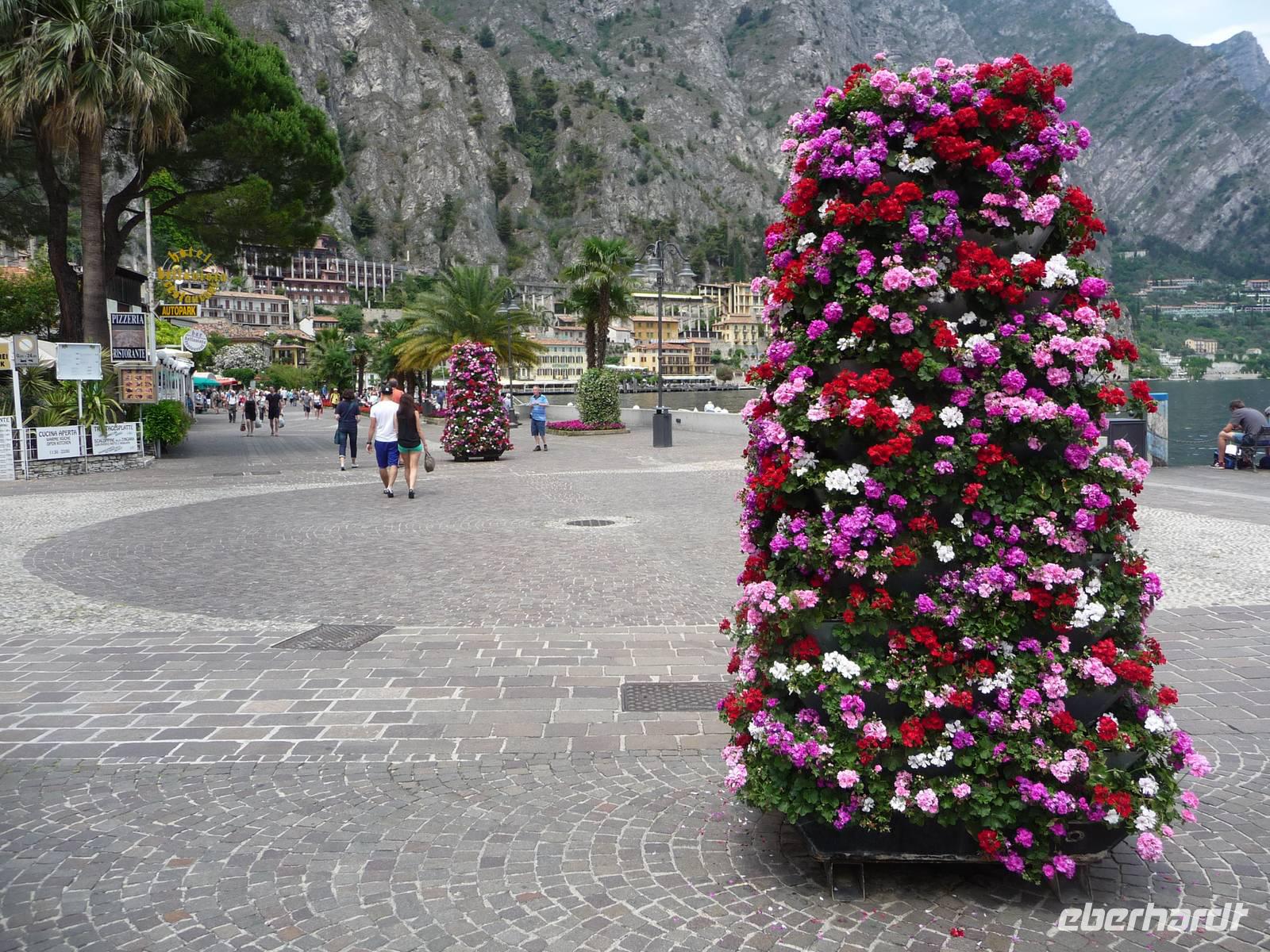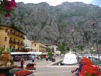 Die Sonne brennt vom Himmel, was die Zitronenbäume freut, aber manchem von uns das kühle immer wehende Lüftchen am Gardasee, die Ora, beim sich anschließenden Spaziergang am Ufer wieder gut tut. Schön ist Limones Uferpromenade mit wundervollen Blumenbeeten, mit Ausblicken in die steilen Felswände nach oben. Gleichfalls wunderschön ist es, den Blick schweifen zu lassen über das Wasser des Gardasees hinüber auf die andere Seite, wo einem das 1800 m hohe Monte Baldo - Massiv den Kontrast zeigt zwischen Wasser und Berg.