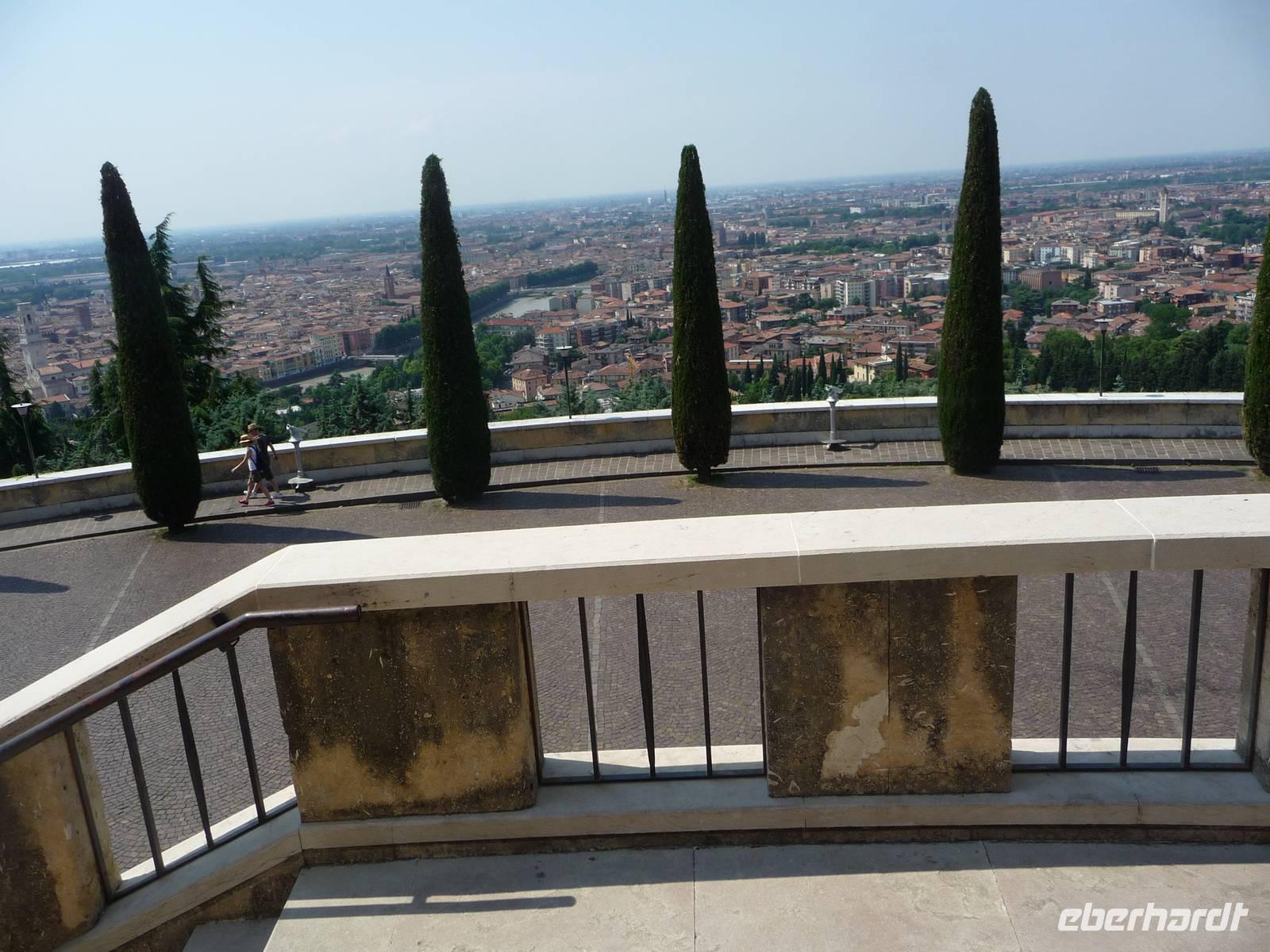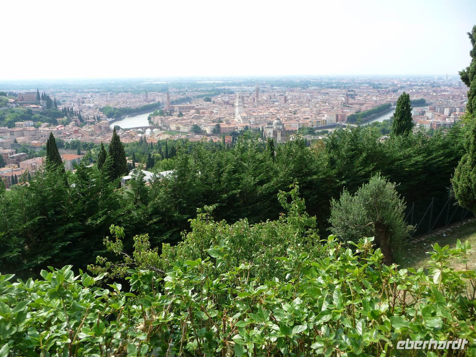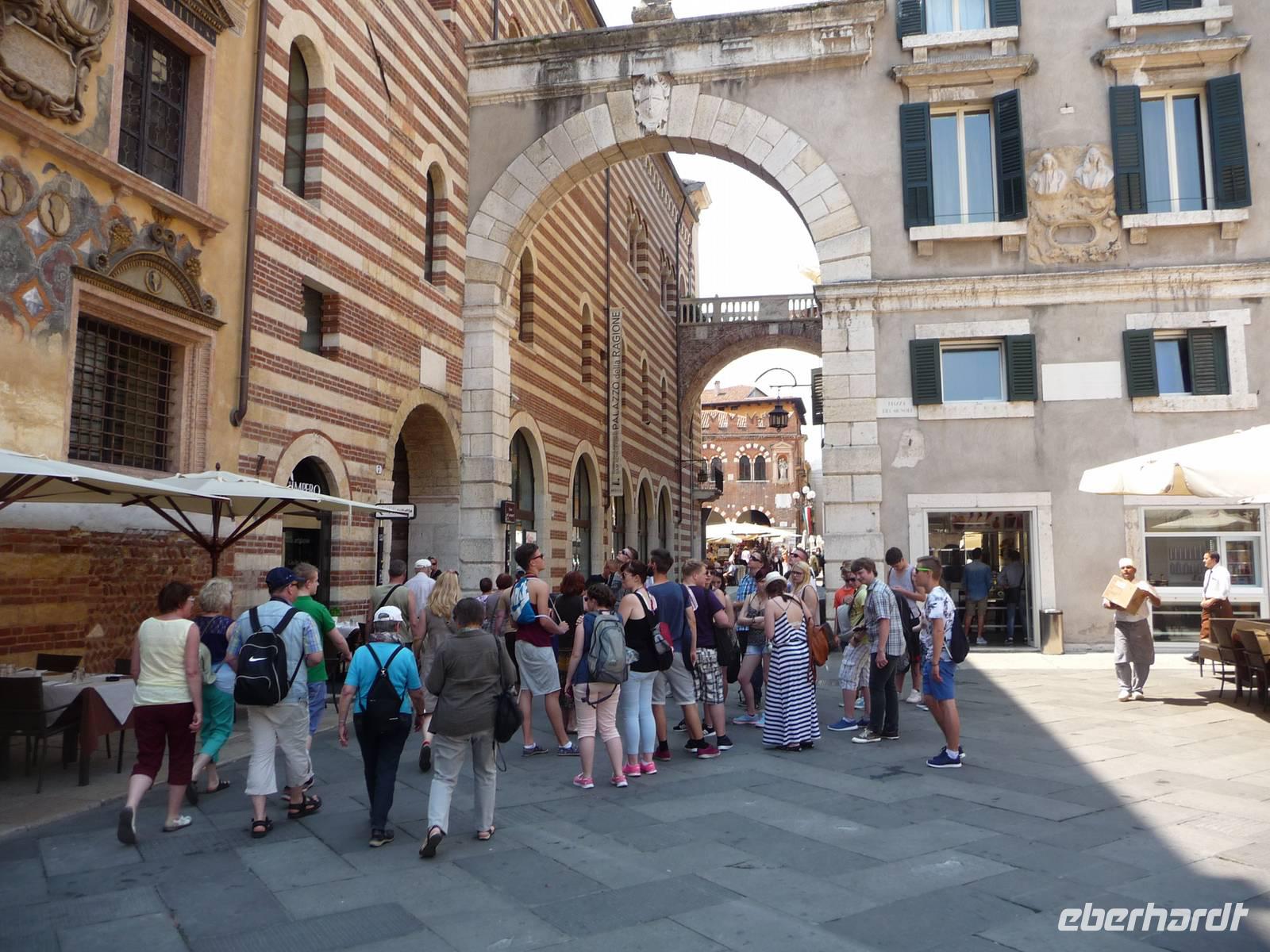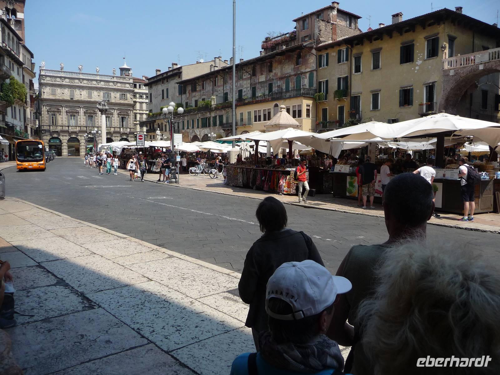 Zuerst fahren wir mit unserem Bus zu dem "Santuario", hoch über der Stadt liegend, hinauf, von wo aus wir einen phantastischen Ausblick haben über die auf einer Landzunge liegenden Stadt an der Etsch. Wieder "unten" angekommen, geht es zu Fuß an der Etsch entlang hinein in die Altstadt . Auf der Piazza dei Signori mit den Gräbern der Familie Scaliger, sowie deren Palazzi aus dem 13./14. Jh., schaut nachdenklich von seinem Sockel der berühmte italienische Dichter Dante herunter, so, als wollte er uns zur Vorsicht mahnen. Weiter führt uns Stefano zur Piazza Erbe einem langgestreckten Platz, der zu den schönsten Plätzen Italiens gehört.