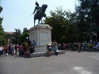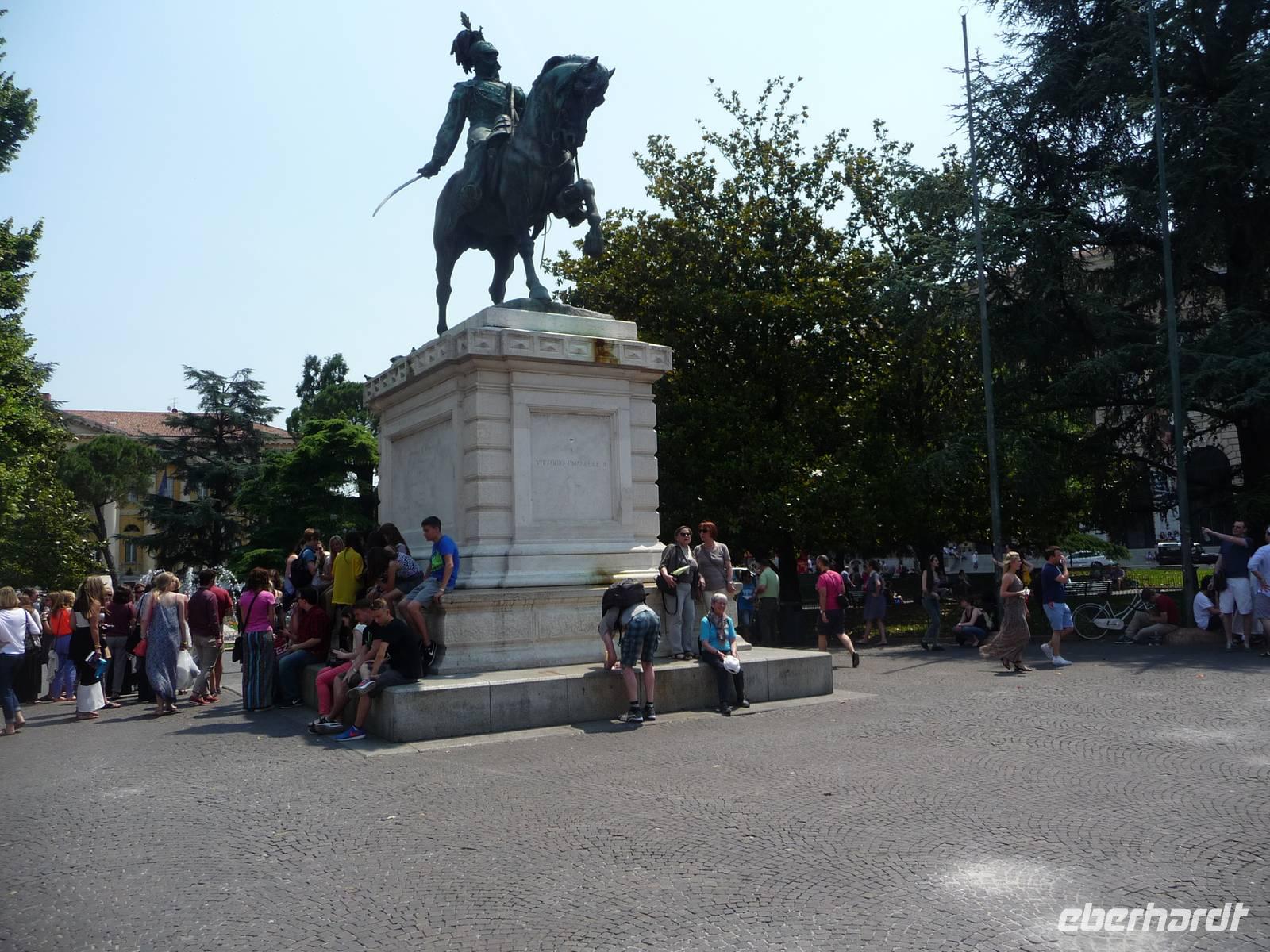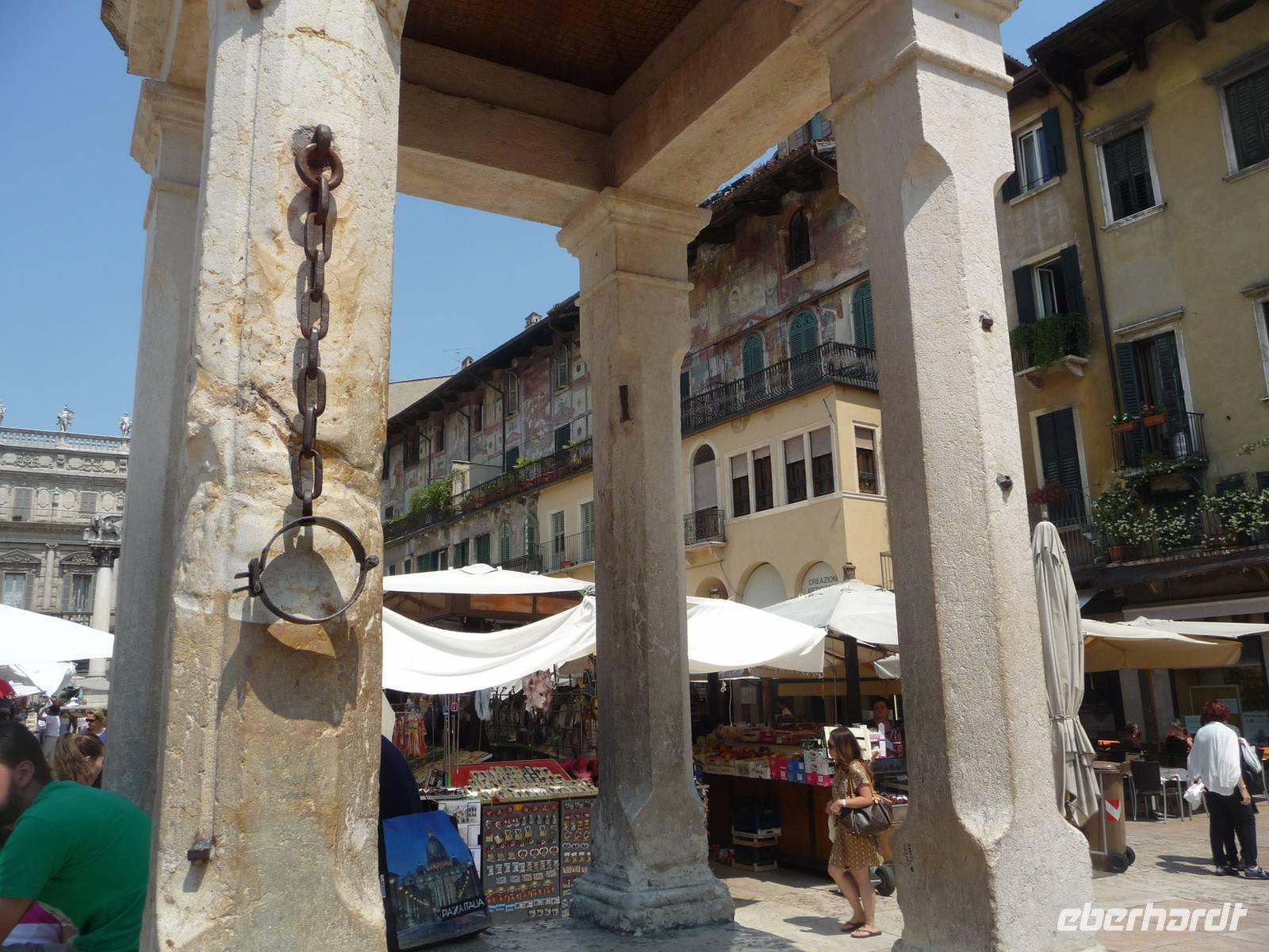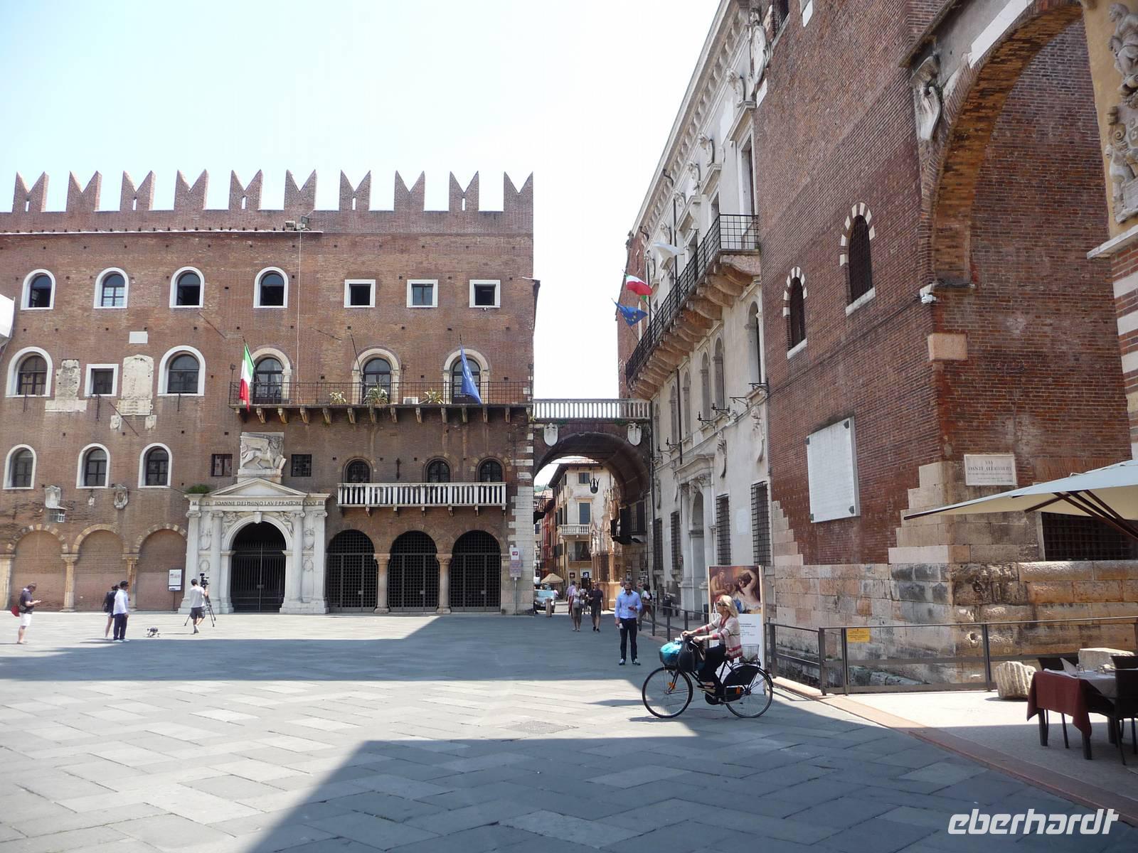Zuerst fahren wir mit unserem Bus zu dem "Santuario", hoch über der Stadt liegend, hinauf, von wo aus wir einen phantastischen Ausblick haben über die auf einer Landzunge liegenden Stadt an der Etsch. Wieder "unten" angekommen, geht es zu Fuß an der Etsch entlang hinein in die Altstadt . Auf der Piazza dei Signori mit den Gräbern der Familie Scaliger, sowie deren Palazzi aus dem 13./14. Jh., schaut nachdenklich von seinem Sockel der berühmte italienische Dichter Dante herunter, so, als wollte er uns zur Vorsicht mahnen. Weiter führt uns Stefano zur Piazza Erbe einem langgestreckten Platz, der zu den schönsten Plätzen Italiens gehört.