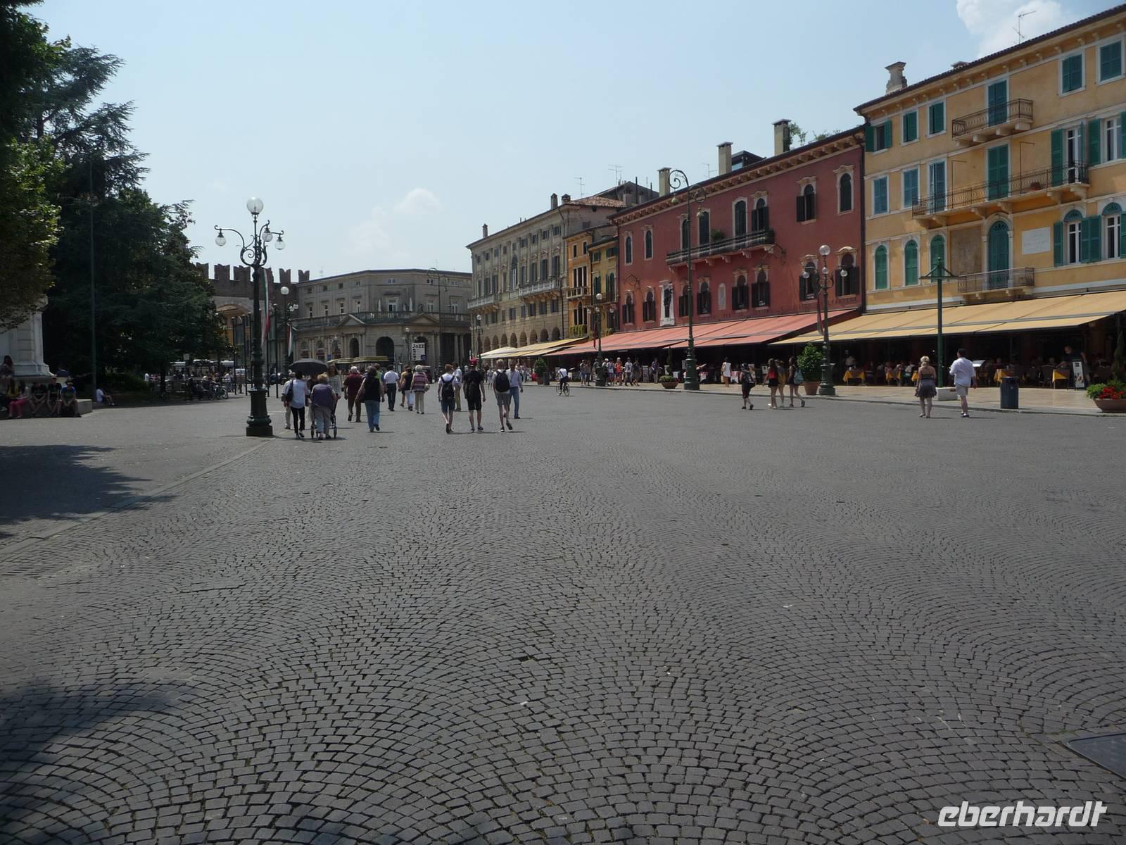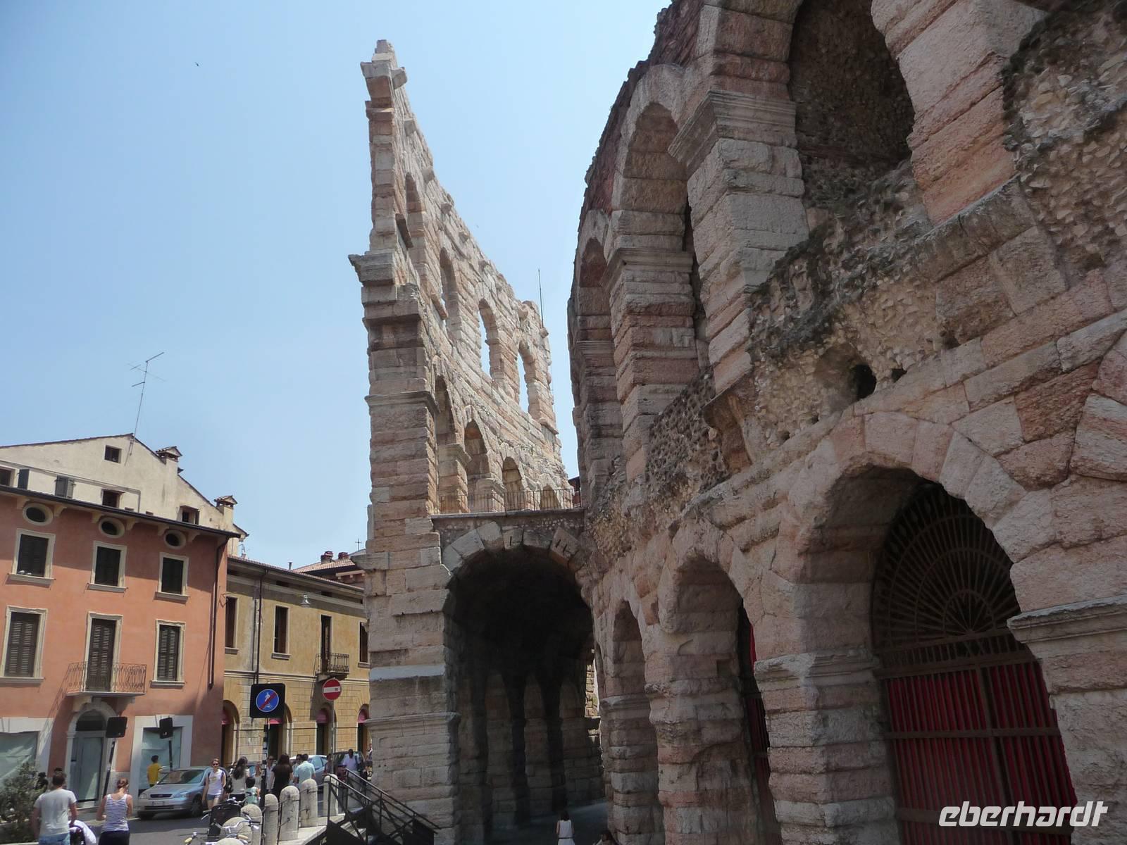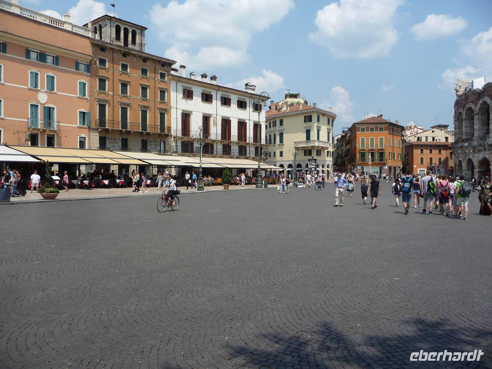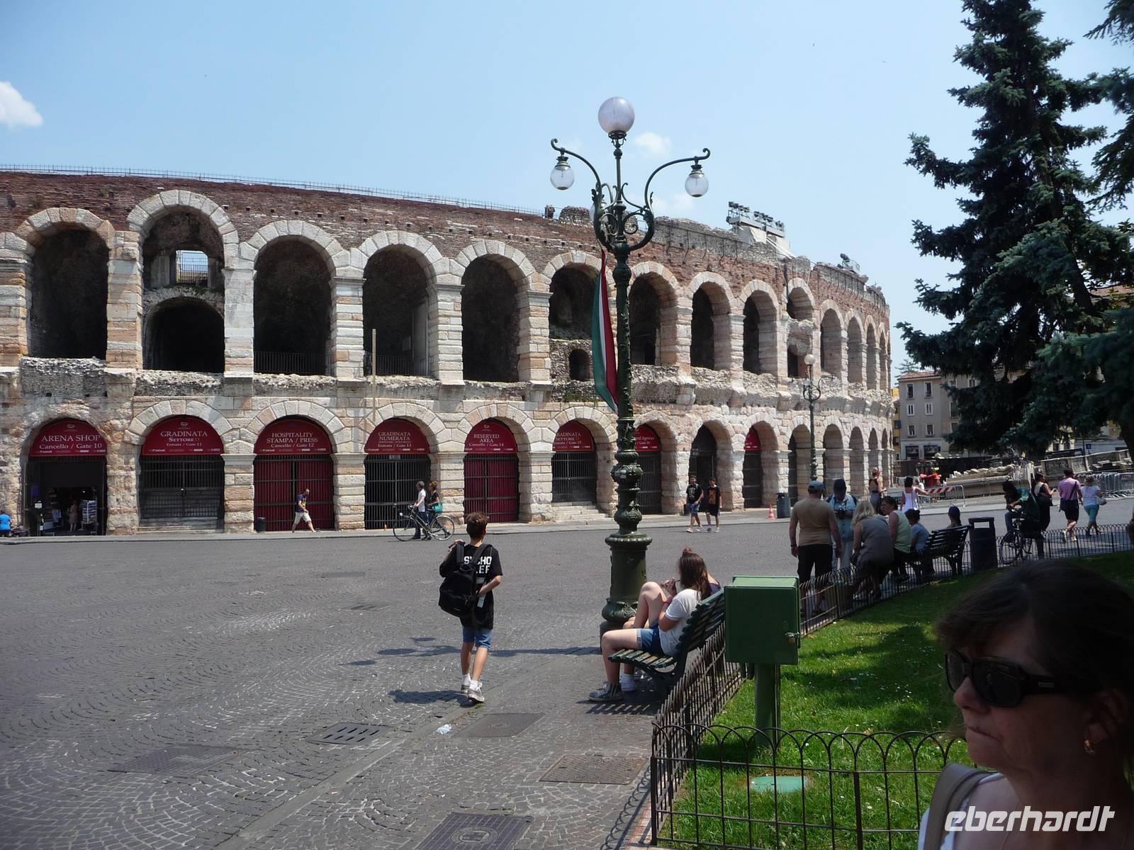 Auf der eleganten, mit rosa Marmor gepflasterten, Via Mazzini gelangen wir dann zur Piazza Bra und sehen auf fast 2000 Jahre alte Geschichte, wir stehen vor der Arena di Verona. Nach dem Kolosseum in Rom und einer weiteren Arena ist diese von Verona das drittgrößte der noch erhaltenen antiken Amphitheater. Heutzutage finden im Sommer Opernfestspiele hier statt und als sehr berühmte Aufführungen sind zu nennen: Aida, Carmen, Don Giovanni, Romeo und Julia u.a.