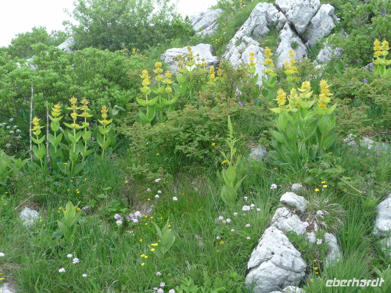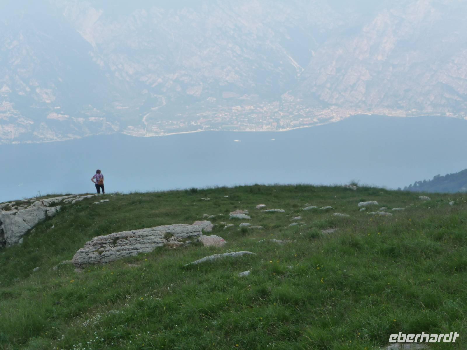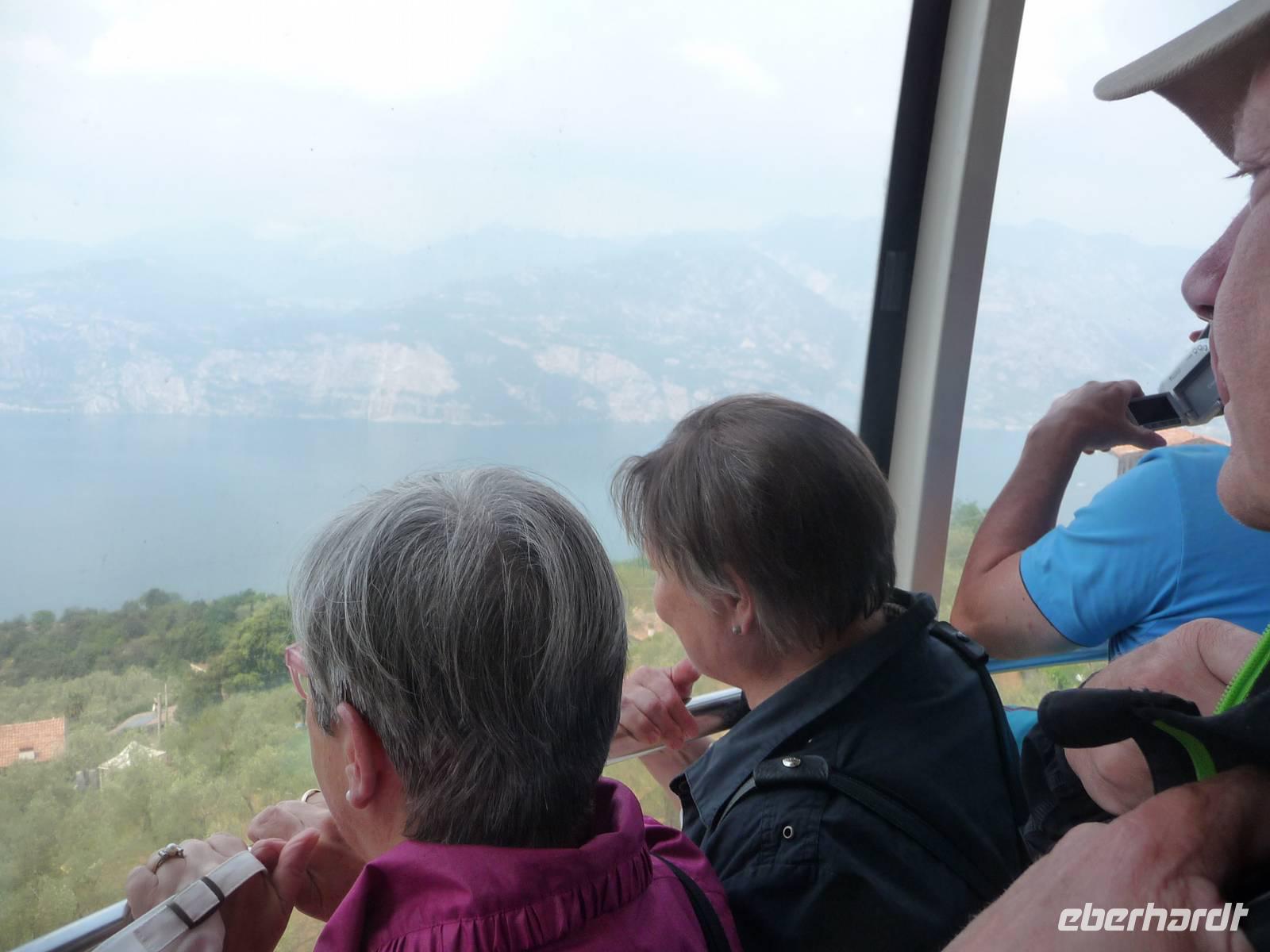 Um 9:30 h stehen wir bereits an der Talstation, um hinauf zu fahren auf 1760 m nach Tratto-Spino im Monte Baldo-Massiv. Auf der Mittelstation steigen wir um in eine Gondel, die sich bei der Bergfahrt einmal um 360° dreht so, dass jeder einmal sowohl auf den Berg als auch auf den sich immer weiter entfernenden Gardasee blicken kann. Dunkle Wolken hängen über den Alpen und auf unserem Spaziergang auf dem Monte Baldo beginnt es dann auch wirklich leicht zu regnen. Trotzdem bleiben uns weite Blicke über den Gardasee hin zu den Brentadolomiten und - man glaubt es kaum - nach unten ins SONNIGE Malcesine. Überraschung auf der Hochebene: