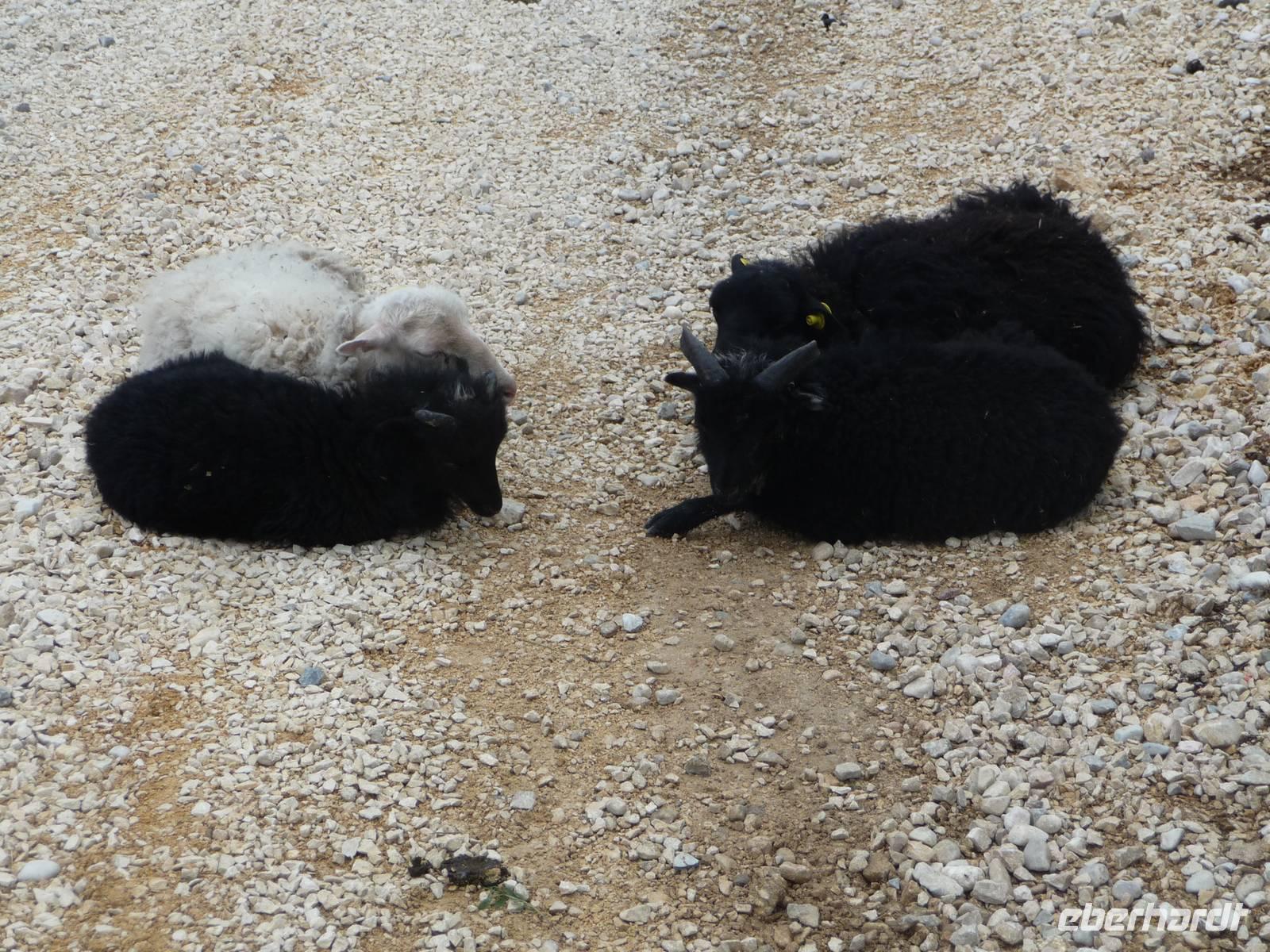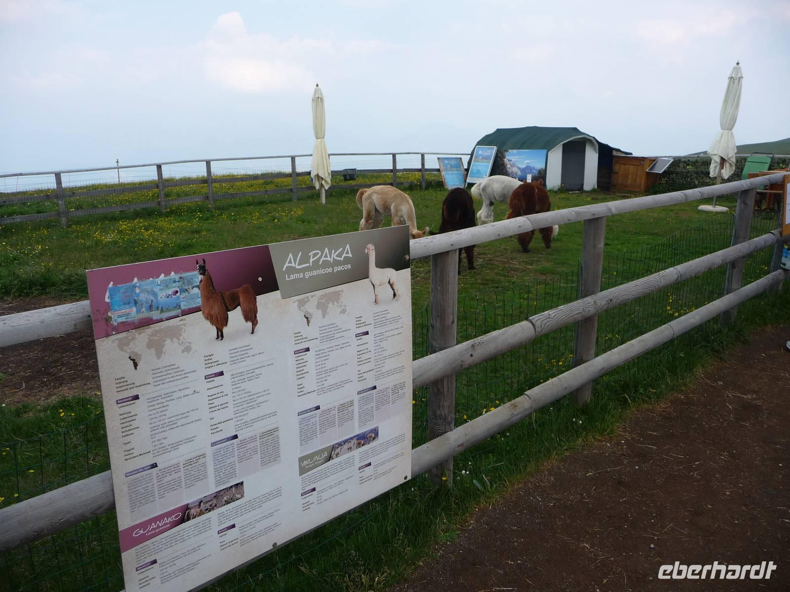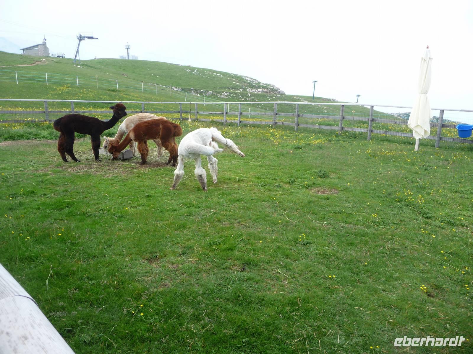 In einem kleinen Gehege kuscheln 4 Alpakas miteinander, die gern als Fotoobjekte herhalten.