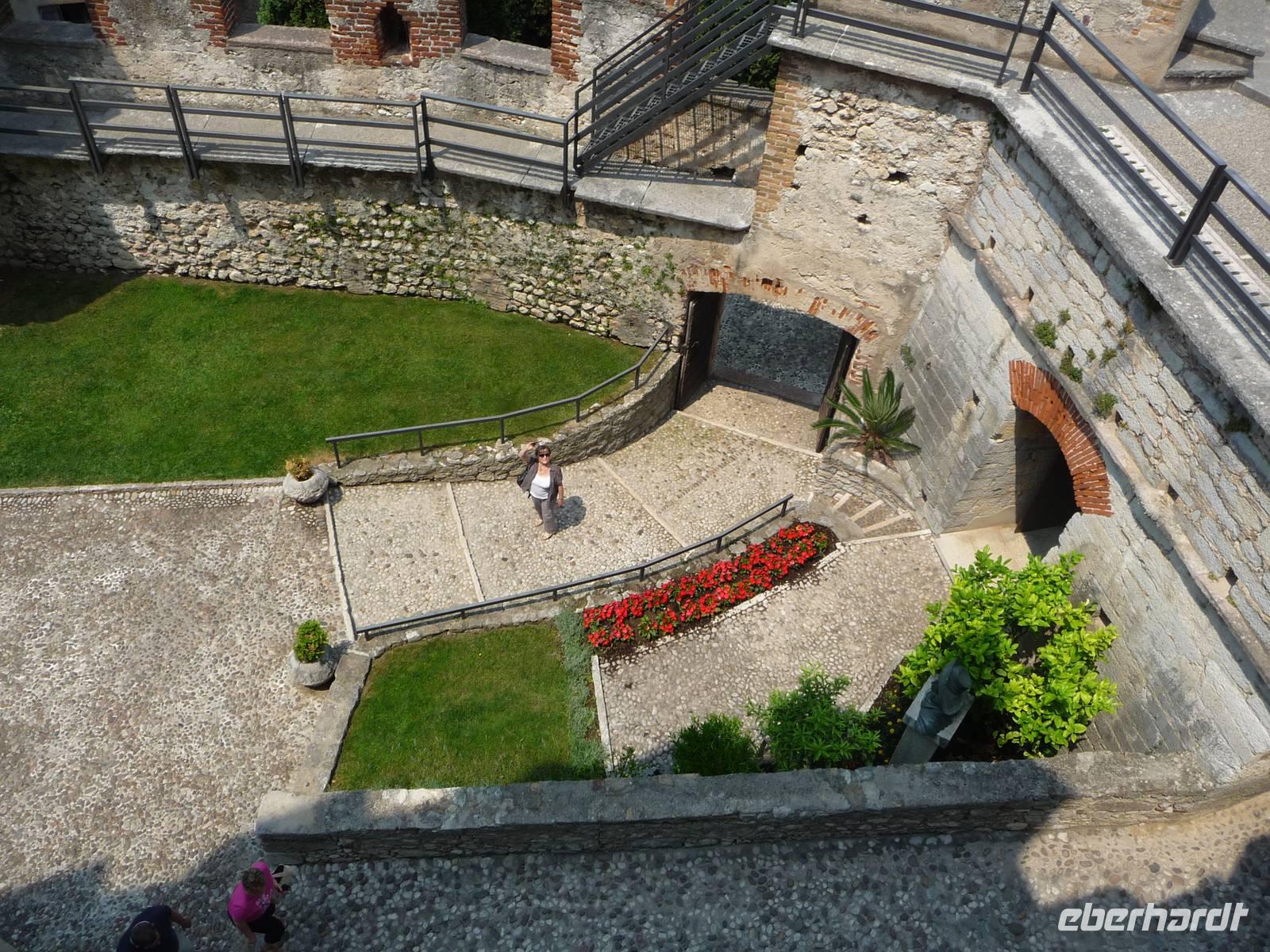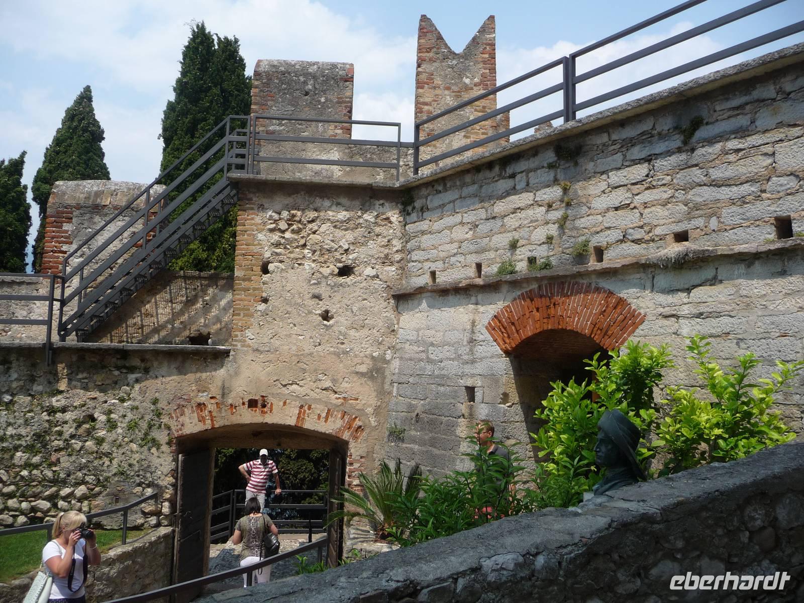 Ausgeschlafen und gut gefrühstückt fahren wir bei strahlendem Sonnenschein mit unserem Bus an der Ostseite des Gardasees entlang. Der Weg ist schon mal das Ziel, denn wir erleben üppige Vegetation einerseits und den wunderbaren Blick über den See hin bis zu dem gegenüberliegenden Ufer mit den steil aufragenden Felswänden. Zypressen, Oleanderbüsche, Olivenhaine, Palmen, Pinien, Kaktusfeigen säumen die Gardesana Orientale, die Ostseite des Gardasees. Wir fahren durch malerische kleine Ortschaften, wie Brenzone, Torri del Benaco, durch Garda sowie an Bardolino vorbei und erreichen schließlich unser Ziel, Sirmione am Südufer des Gardasees.
