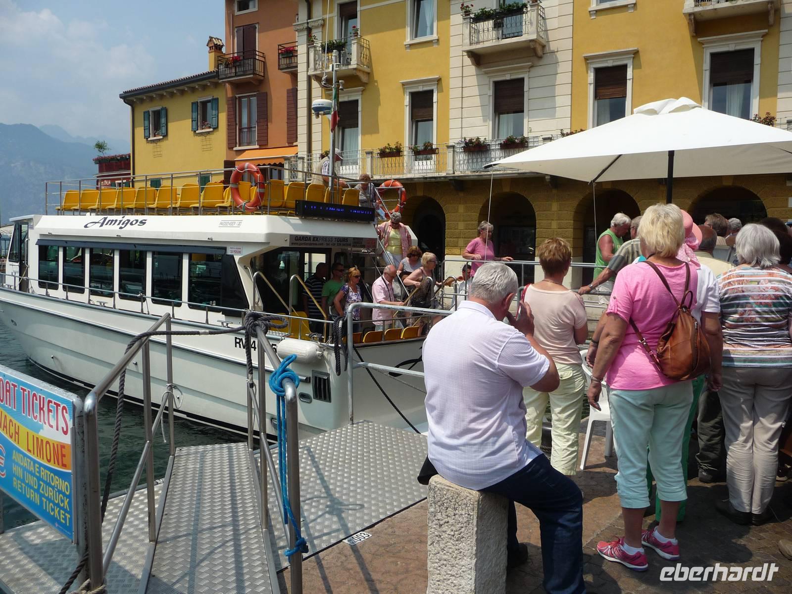 Auch heute meint es der Wettergott wieder sehr gut mit uns. Gerade recht, um mit dem Boot von Torbole aus über den Gardasee zu fahren und in Limone anzulanden. Der Name, der vom Lateinischen Limes = Grenze stammt, wird heute als Zitronenimage vermarktet. Das ist sehr schön anzusehen, wenn einen über fast jedem Haustürschild eine Keramikzitrone gelb an-