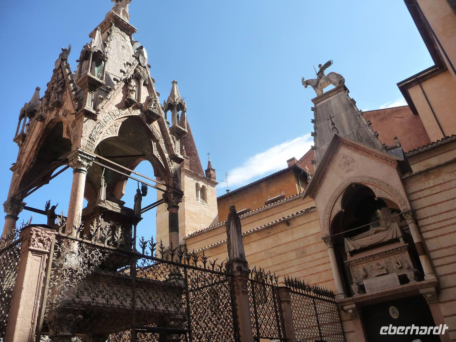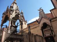 Unsere Gästeführerin Mariella begrüßt uns im Bus und fährt mit uns hinauf zum Santuario de Lourdes hoch über Verona gelegen. Ein wunderbarer Ausblick auf das alte Verona, das auf einer Landzunge liegt, die von der Etsch umschlungen wird, wird uns nun geboten. Und danach beginnt der Stadtrundgang, der an Romeos Geburtshaus vorbeiführt, an den hoch in den Himmel ragenden Gräbern der Familie Scala vorbei zur Piazza Dei Signori mit dem Denkmal des italienischen Dichterfürsten Alighieri Dante. Und dann der obligatorische Besuch unter dem Balkon der Julia mit der goldfarbenen Statue im Hof, die man streicheln muß für anhaltendes Liebesglück. Und die Darstellung ist so realistisch, dass es auch dem Nüchternsten schwer fällt zu glauben, dass Romeo und Julia nur Phantasieprodukte sind, von italienischen Novellendichtern erdacht, von Shakespeare zur Weltliteratur gestaltet.